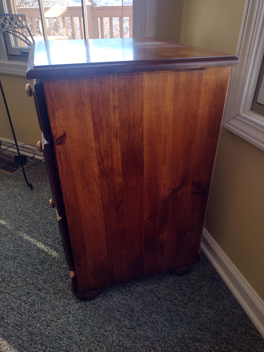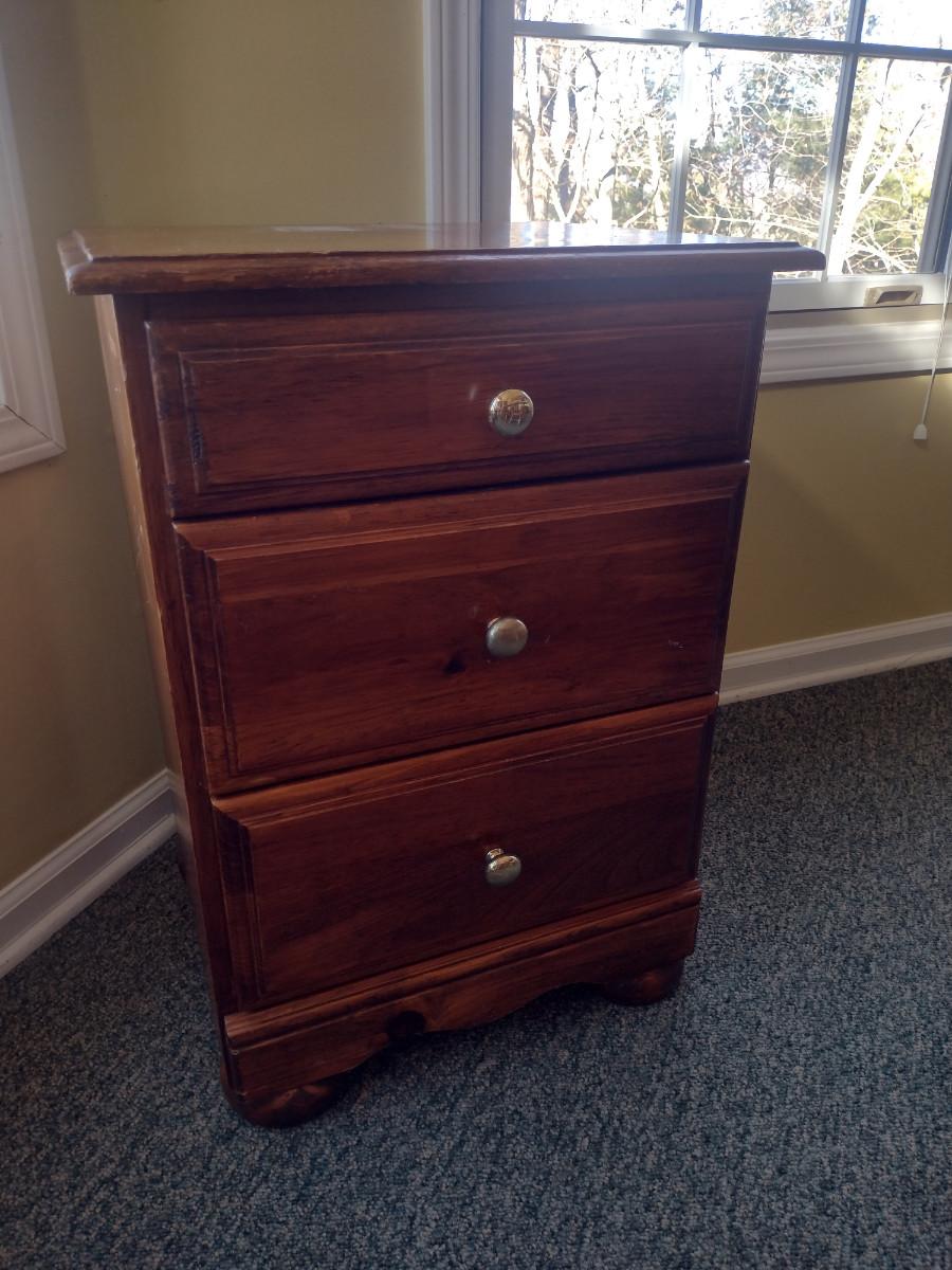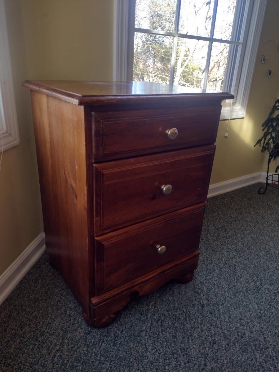 Wooden Three Drawer Side Table. Item has some wear to finish- please see all pictures.