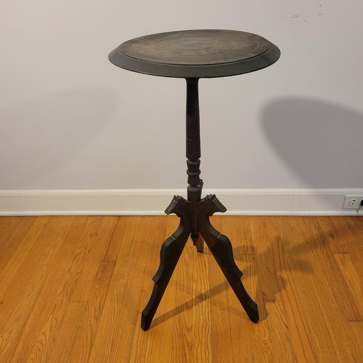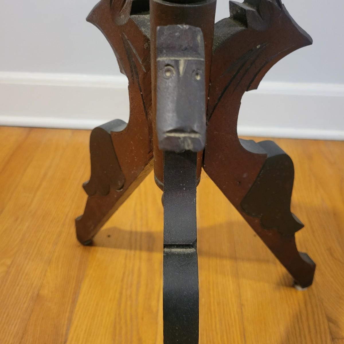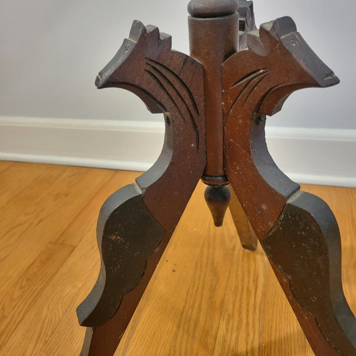 A unique vintage three legged plant stand with horse heads carved into the legs. Piece does show use with some minor scratches, the top piece has a slight warp to it and the varnish is blistering in various spots. Plant stand measures approximately 15" x 31". Local pickup only.