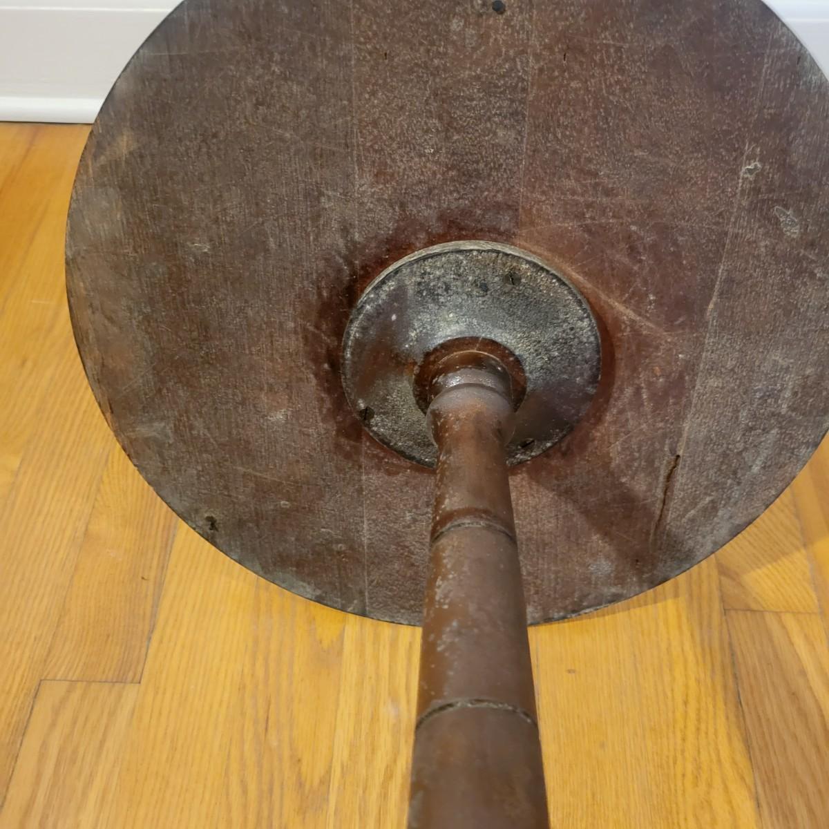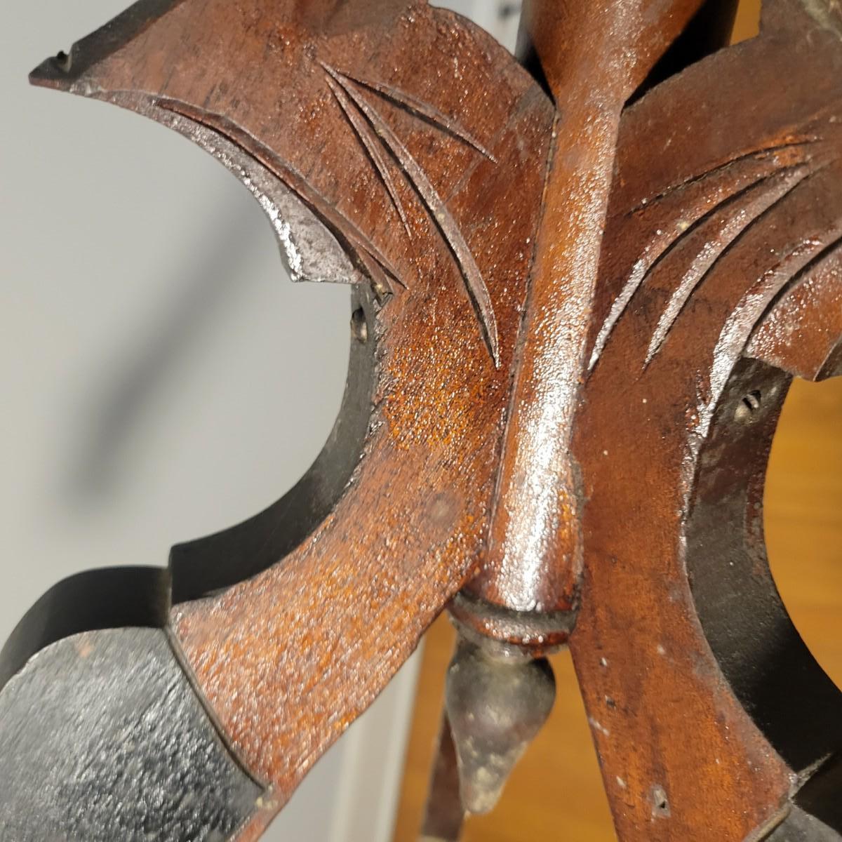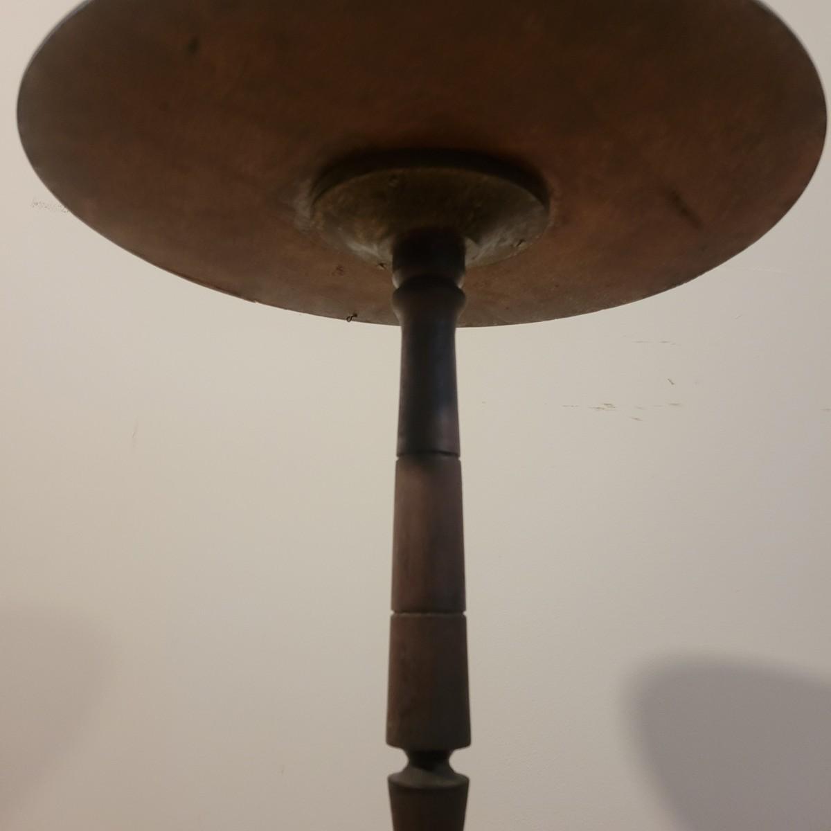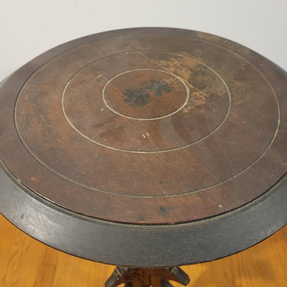 A unique vintage three legged plant stand with horse heads carved into the legs. Piece does show use with some minor scratches, the top piece has a slight warp to it and the varnish is blistering in various spots. Plant stand measures approximately 15" x 31". Local pickup only.
