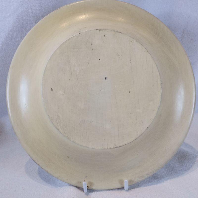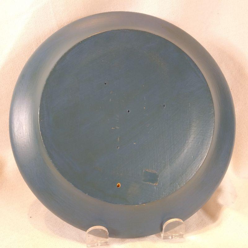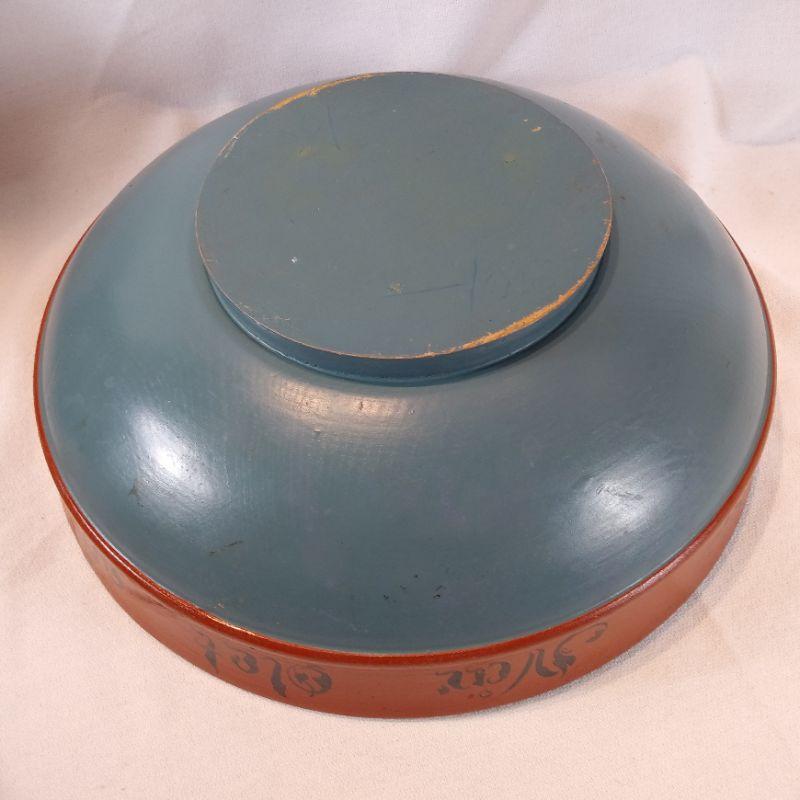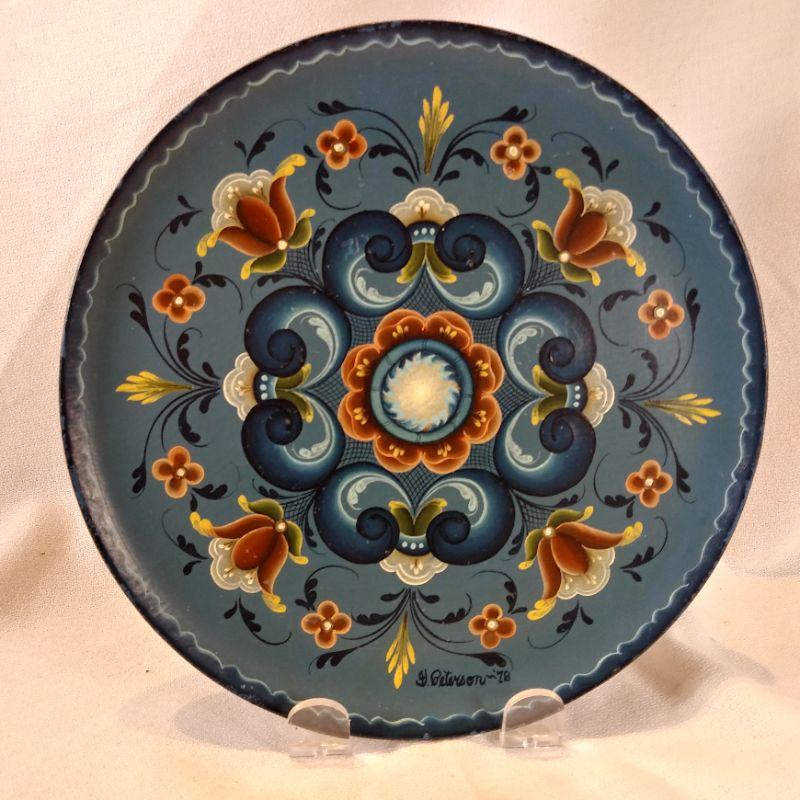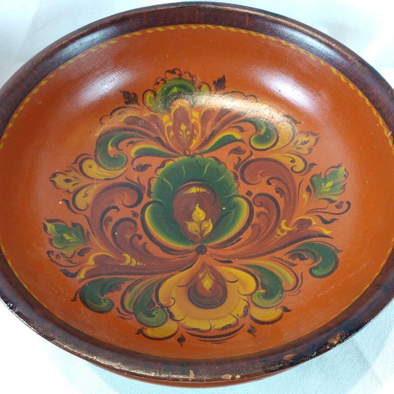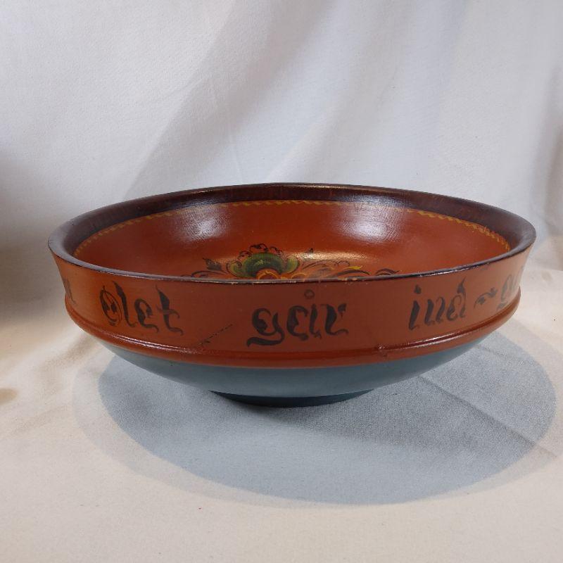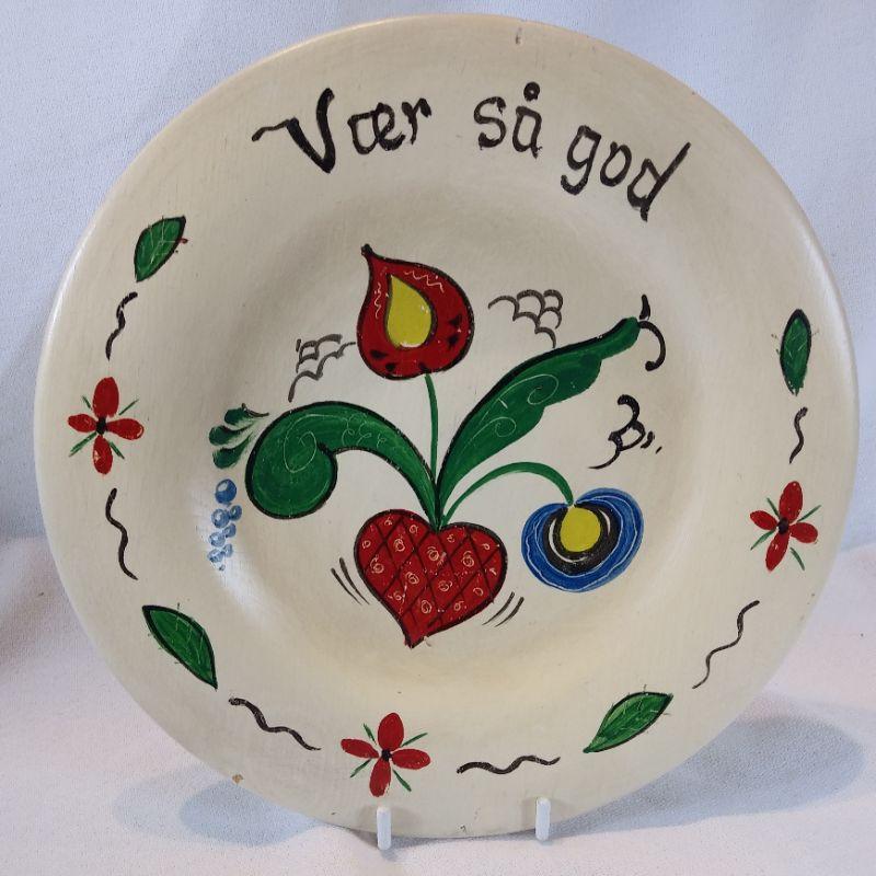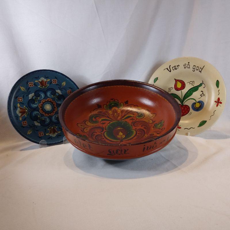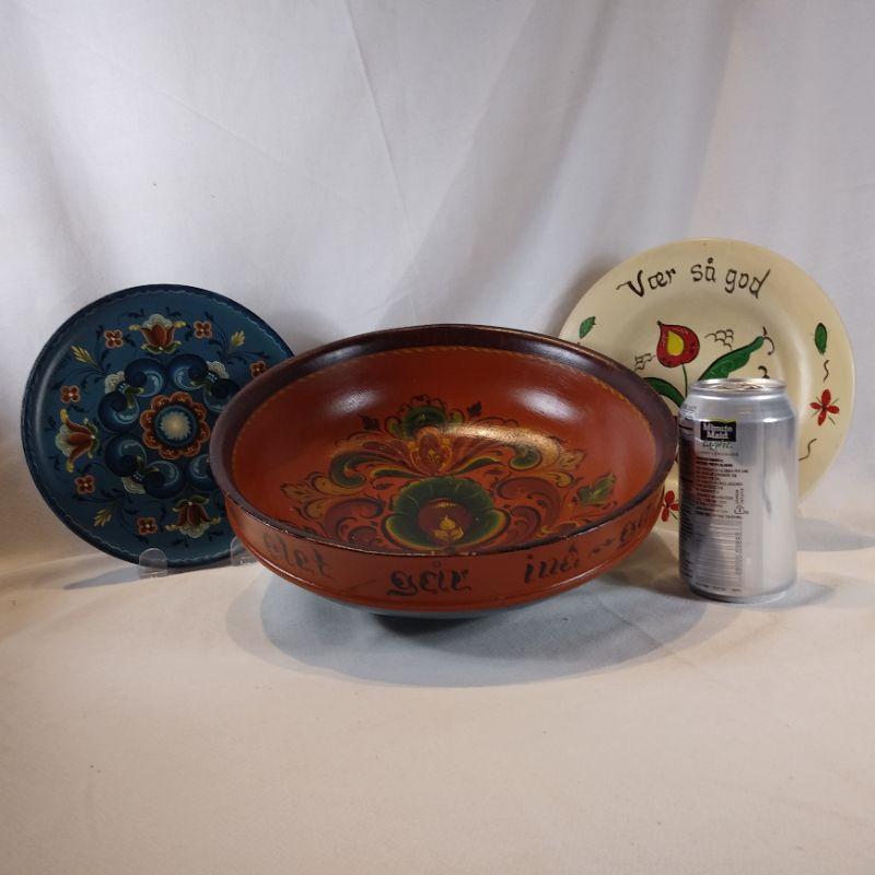 This is a very nice collection of hand-painted Tole on wooden service pieces. The large bowl is 11-inches in diameter x 3 1/2-inches tall. It shows wear around the edges and some usage. No cracks. The white plate says "Vuer sa god" in Norwegian which translates to "Here You Are!" and is a tad more amateurly painted but still sweet. It is 8 1/2-inches in diameter in very good condition. The blue plate is exquisitely painted and signed by the artist - G. Peterson '78. It is 8-inches in diameter and in very good condition. Nice collection for a folk art lover.