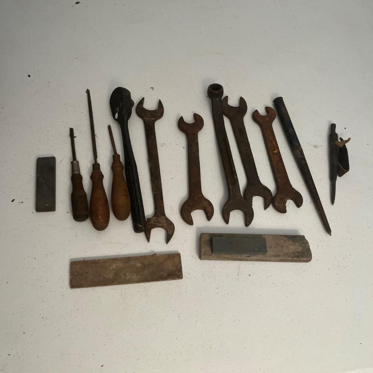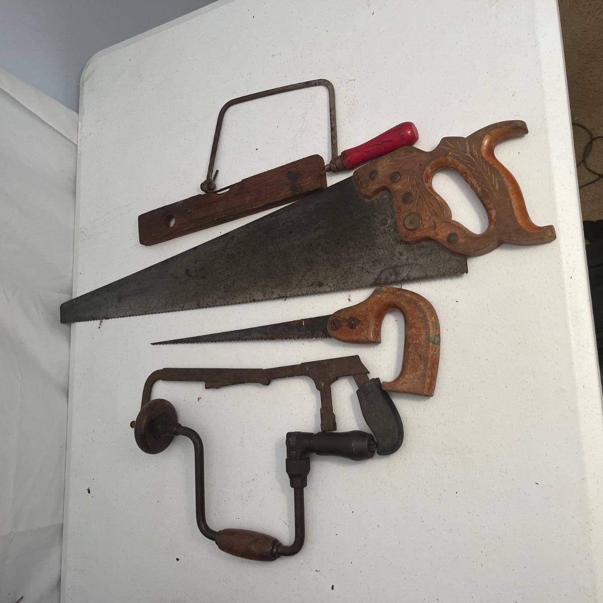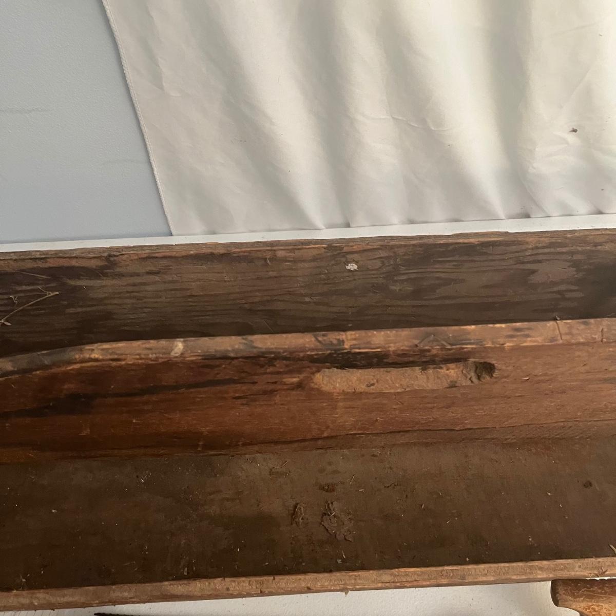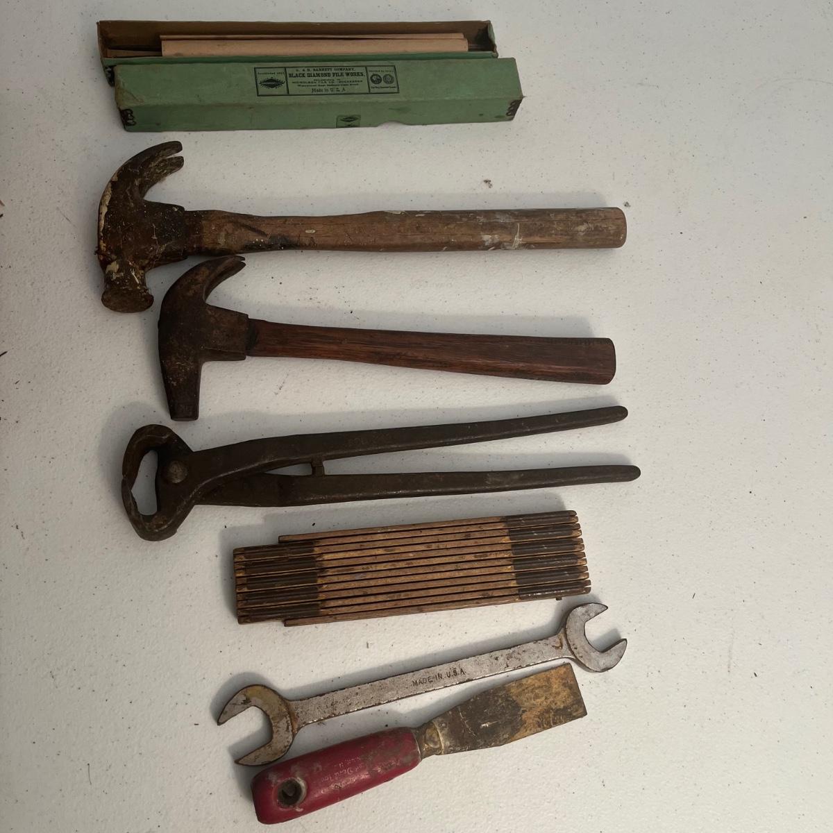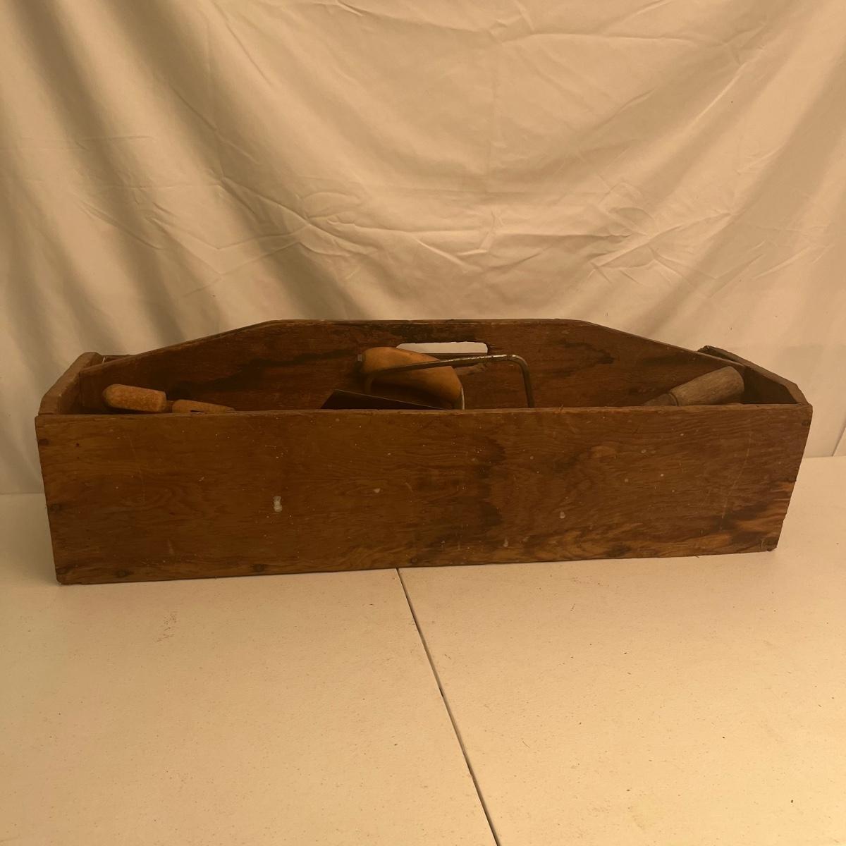 Lot contains a large wooden toolbox with tools that includes hammers, saws, wrench’s, wooden level, masonry tools, files and more. Toolbox measures 10” x 32” x 10.5”.