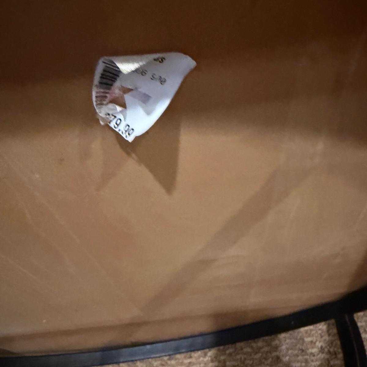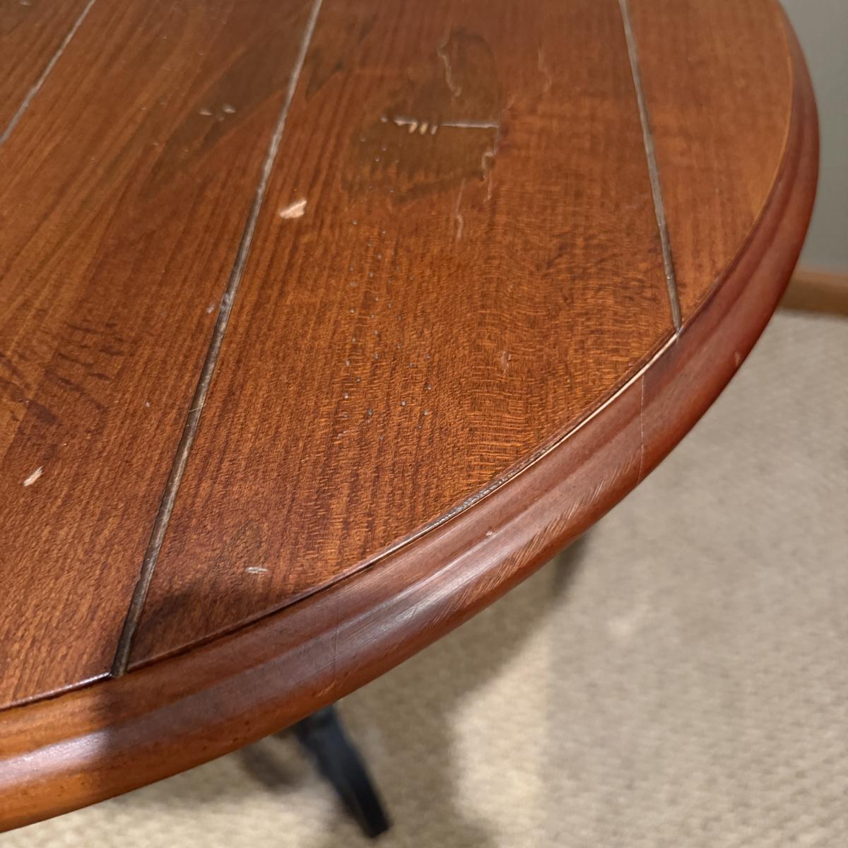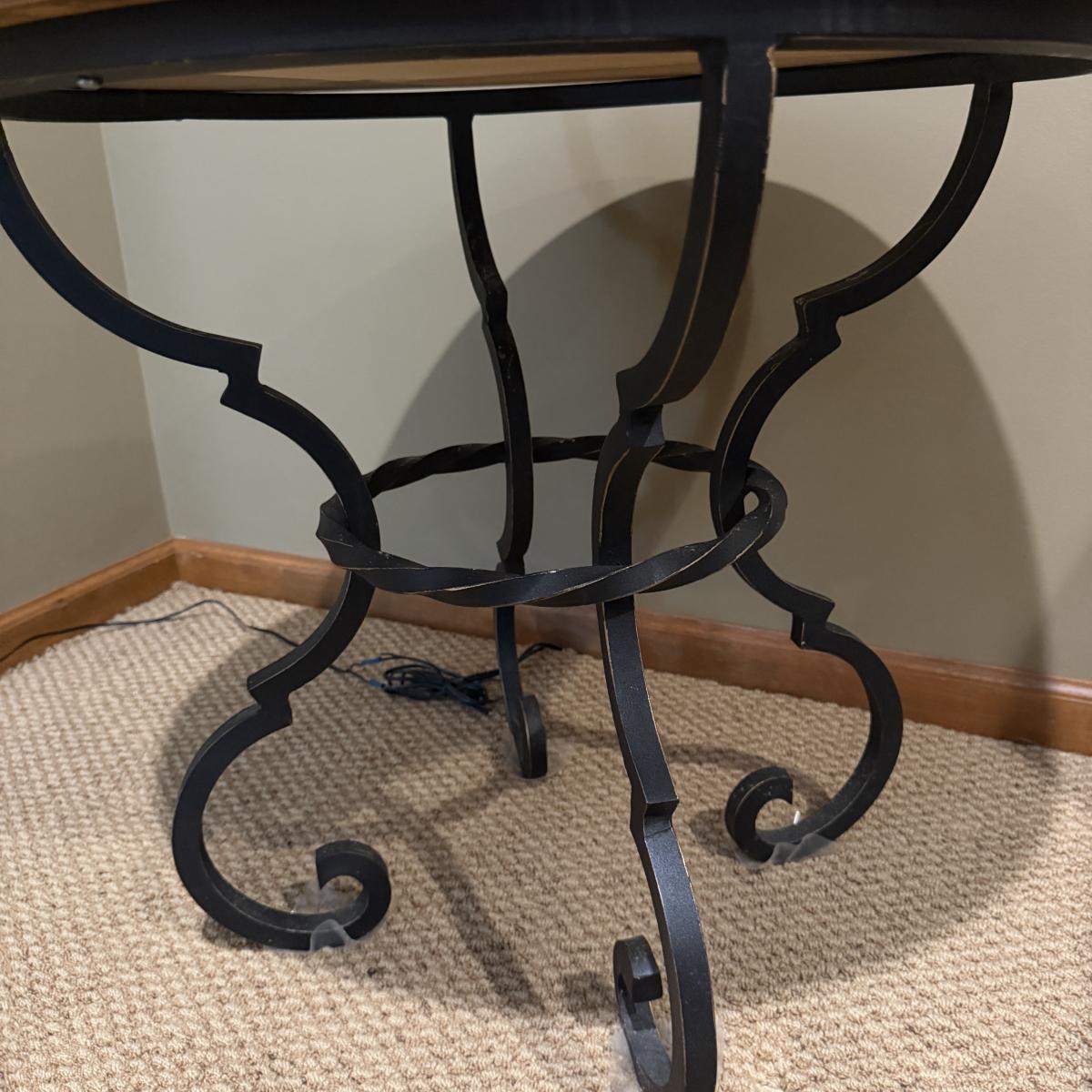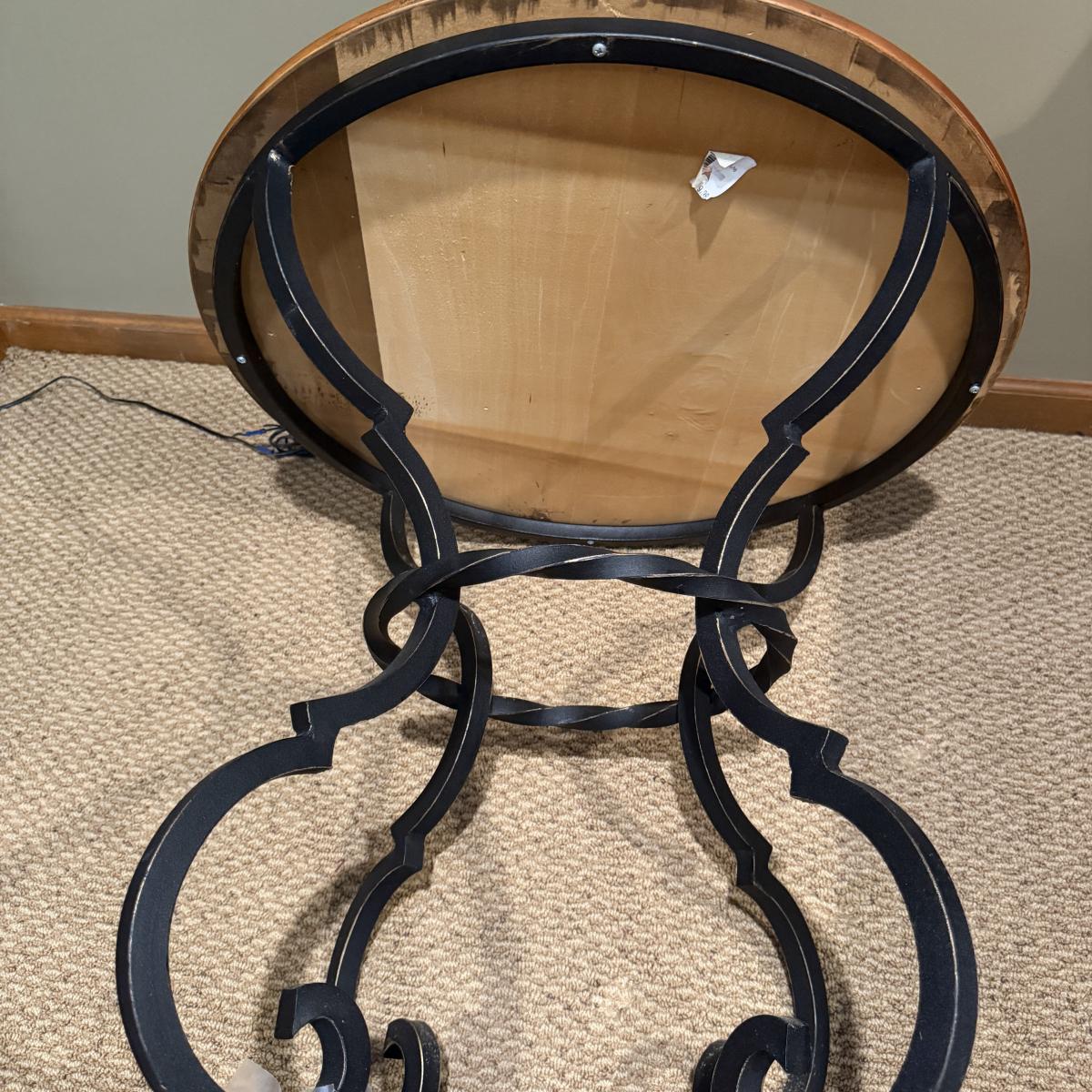 Lot includes a solid wood topped table with an iron base. Table measures 27”D x 25”H. Top has scratches, see pictures.