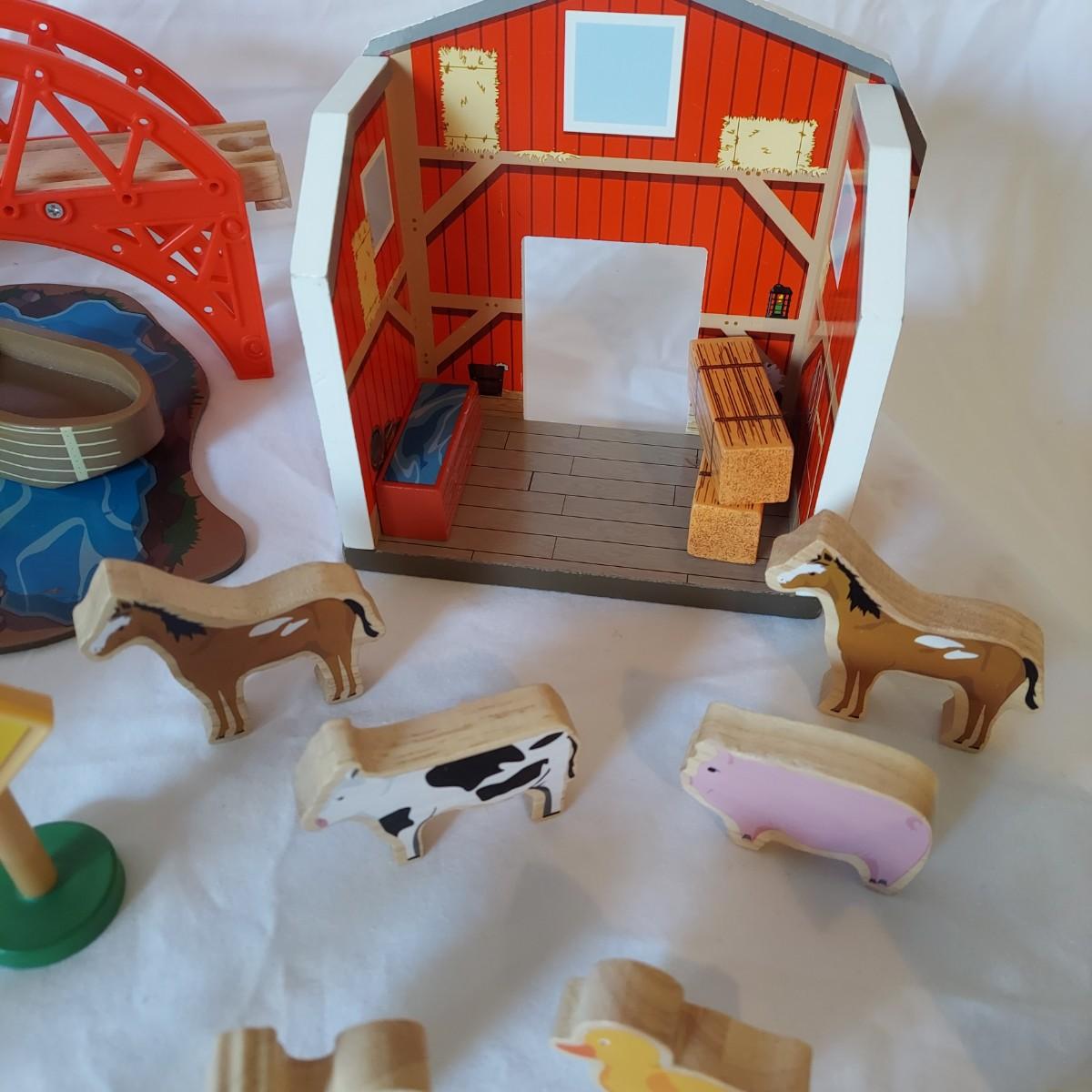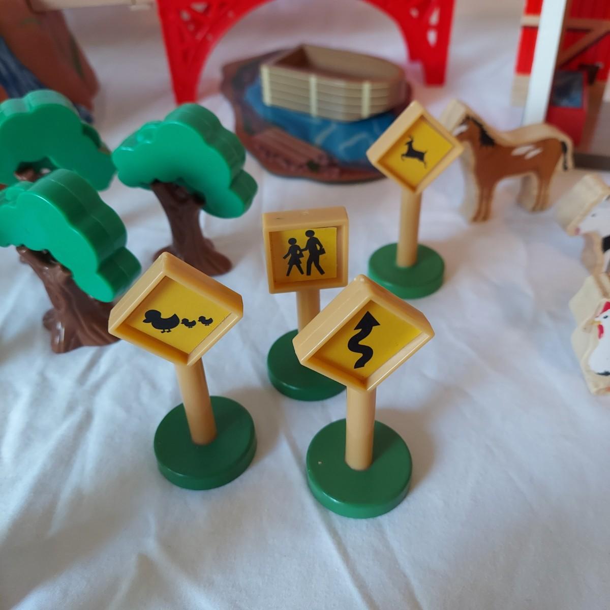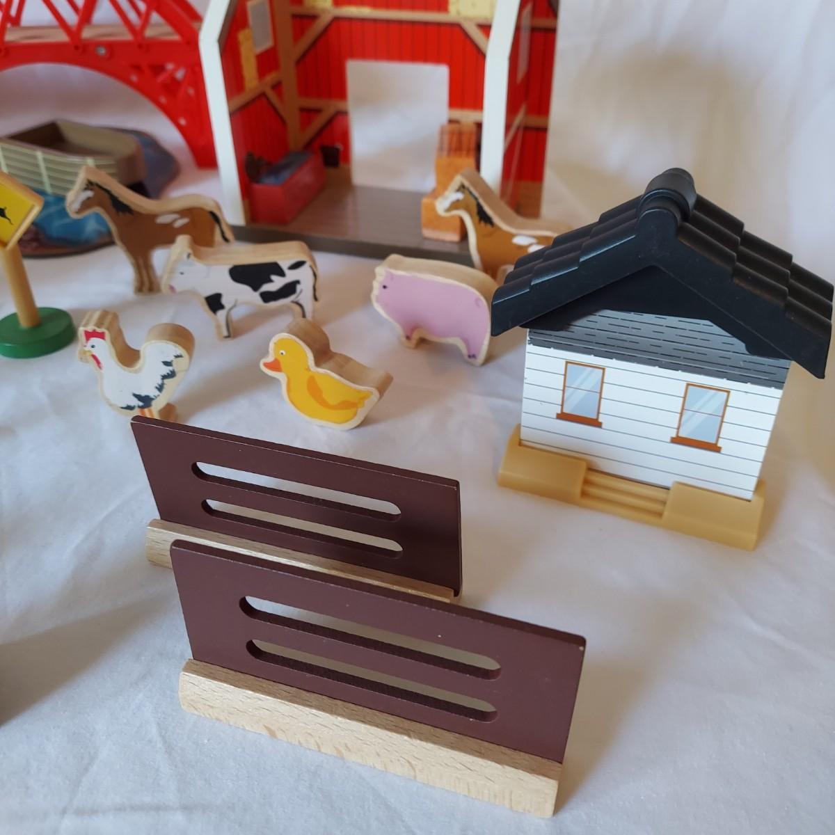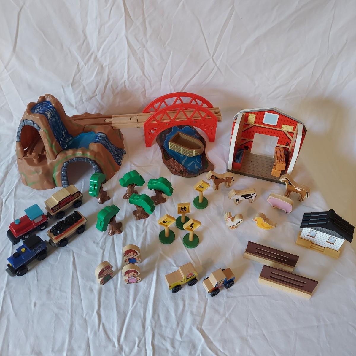 KidKraft wooden train farm set with additional bridges and accessories as well as several extra track pieces and six plastic dog bone connectors. Extra track includes straight track in multiple lengths, two sizes of curves, hills with supports, track switches and both double male and double female connections. Also includes two battery operated trains. The Brio train was not powered on. The white train powered on when tested. Please see photos for details. Shipping available.