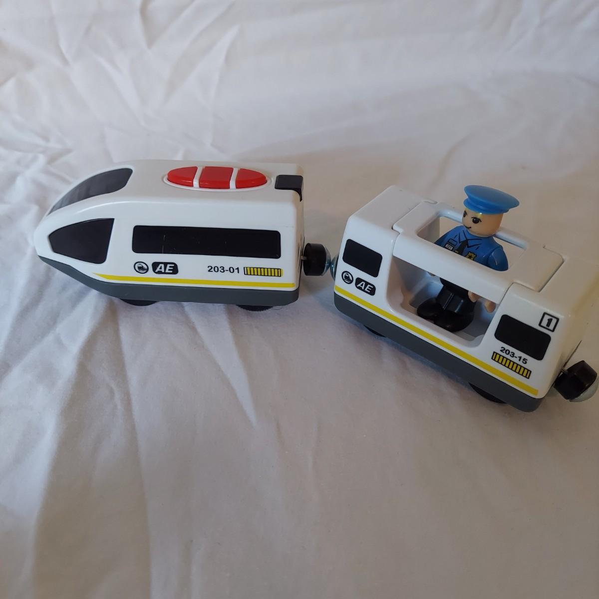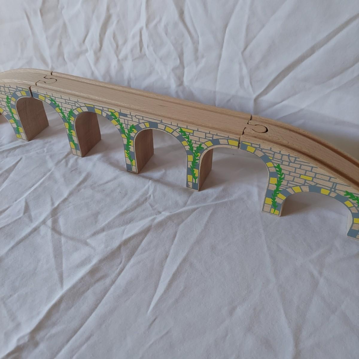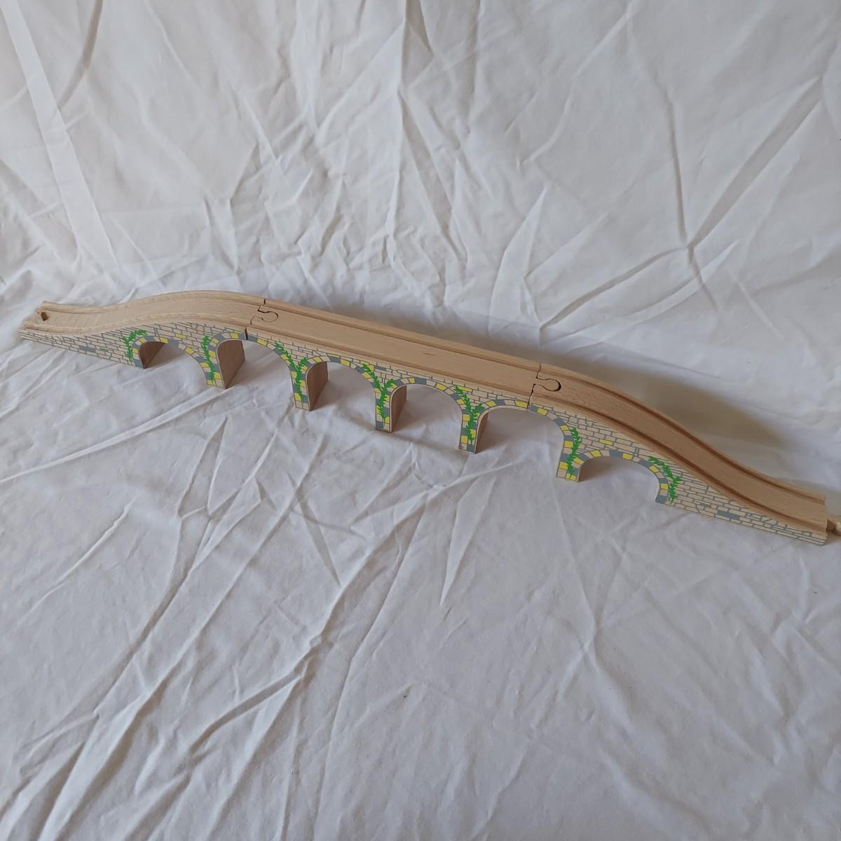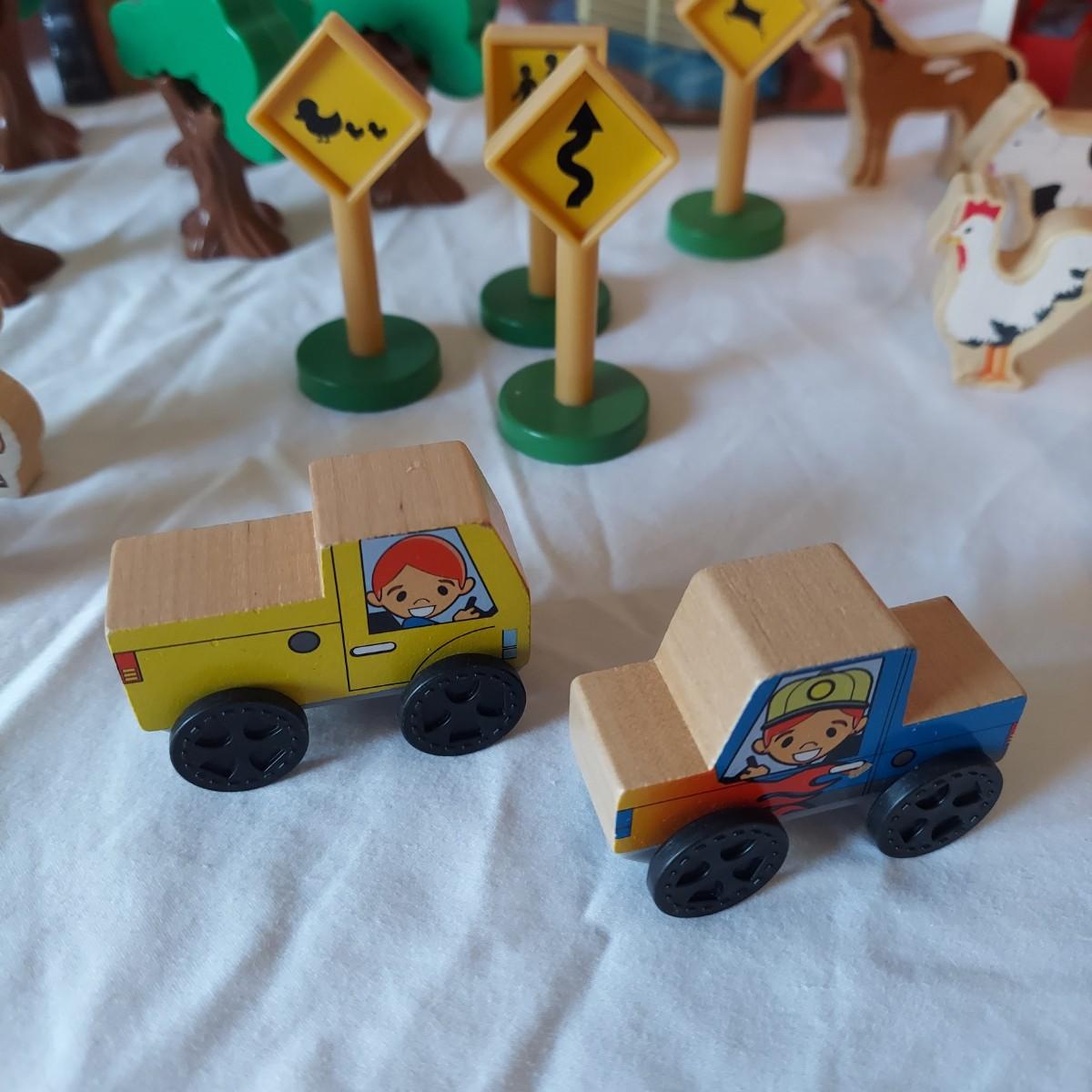 KidKraft wooden train farm set with additional bridges and accessories as well as several extra track pieces and six plastic dog bone connectors. Extra track includes straight track in multiple lengths, two sizes of curves, hills with supports, track switches and both double male and double female connections. Also includes two battery operated trains. The Brio train was not powered on. The white train powered on when tested. Please see photos for details. Shipping available.