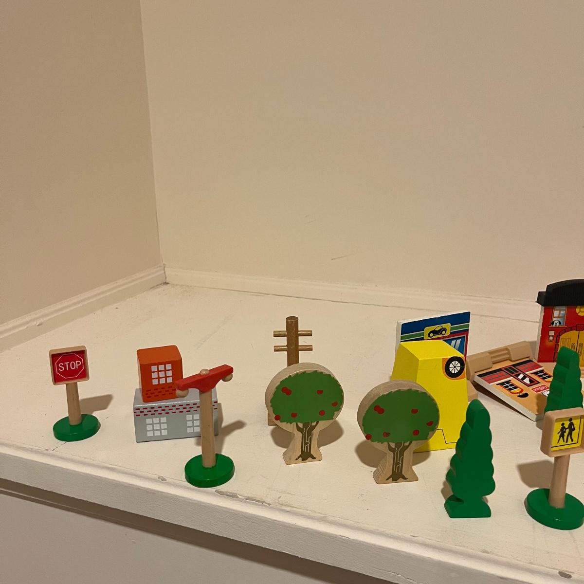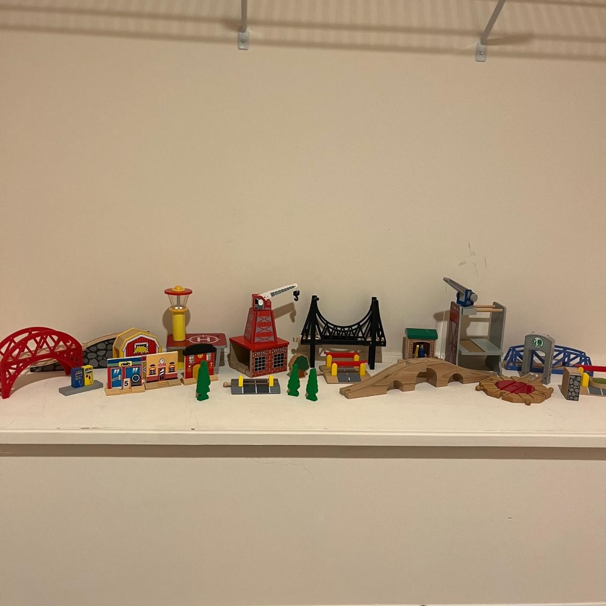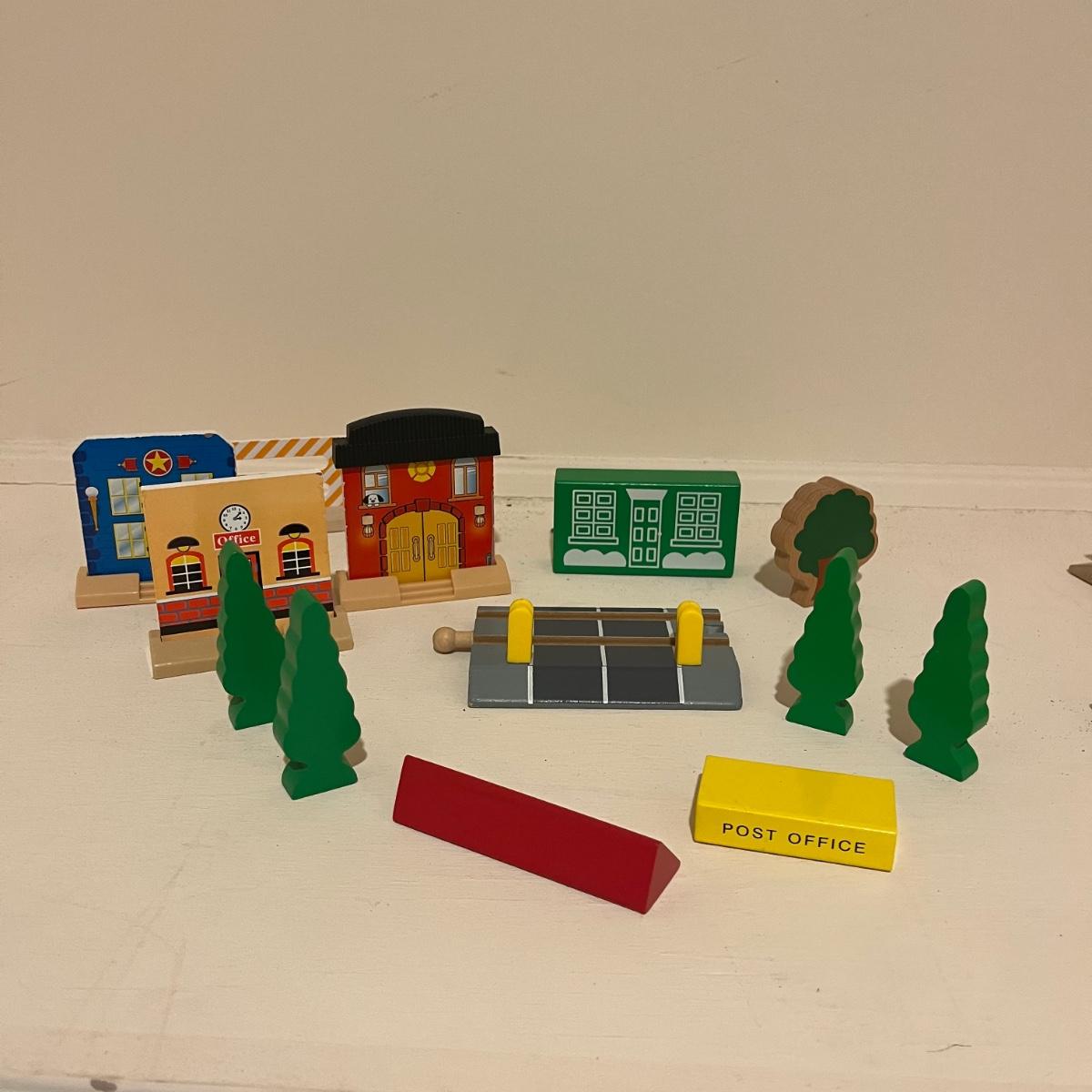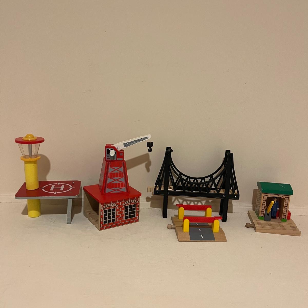 Lot includes a plethora of wooden train tracks that are curved and straight. Also includes a large selection of scenery for the train tracks including bridges, crane, helipad, buildings, trees and more. Helipad measures 4.5” x 5.5” x 8”.