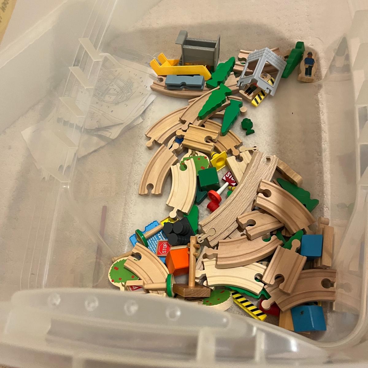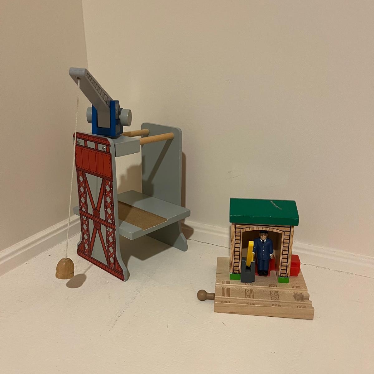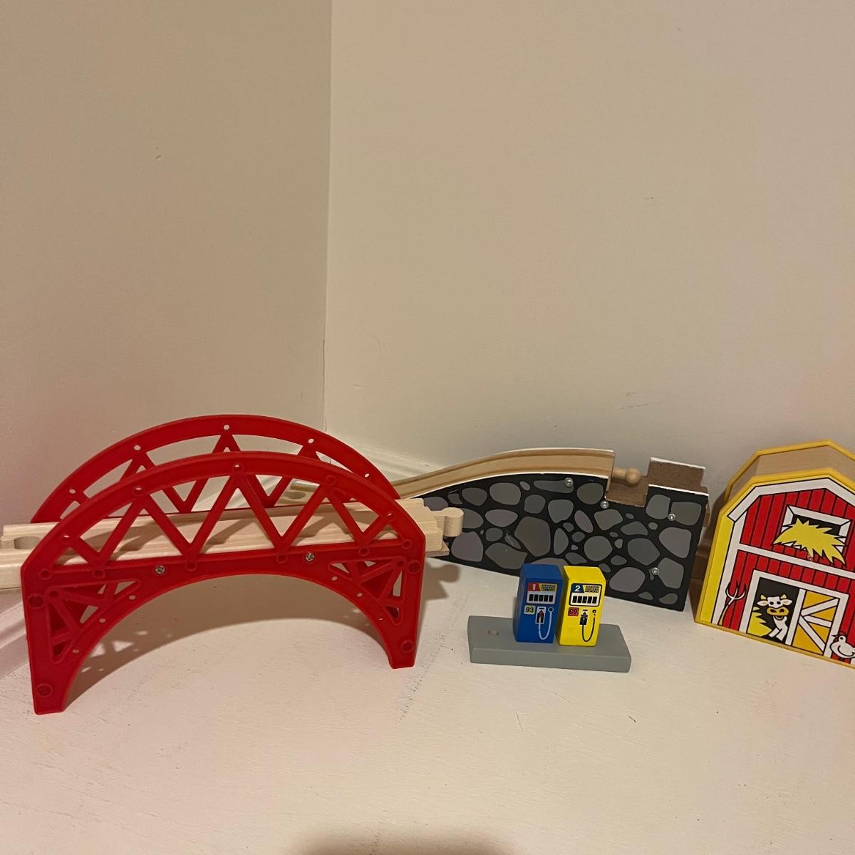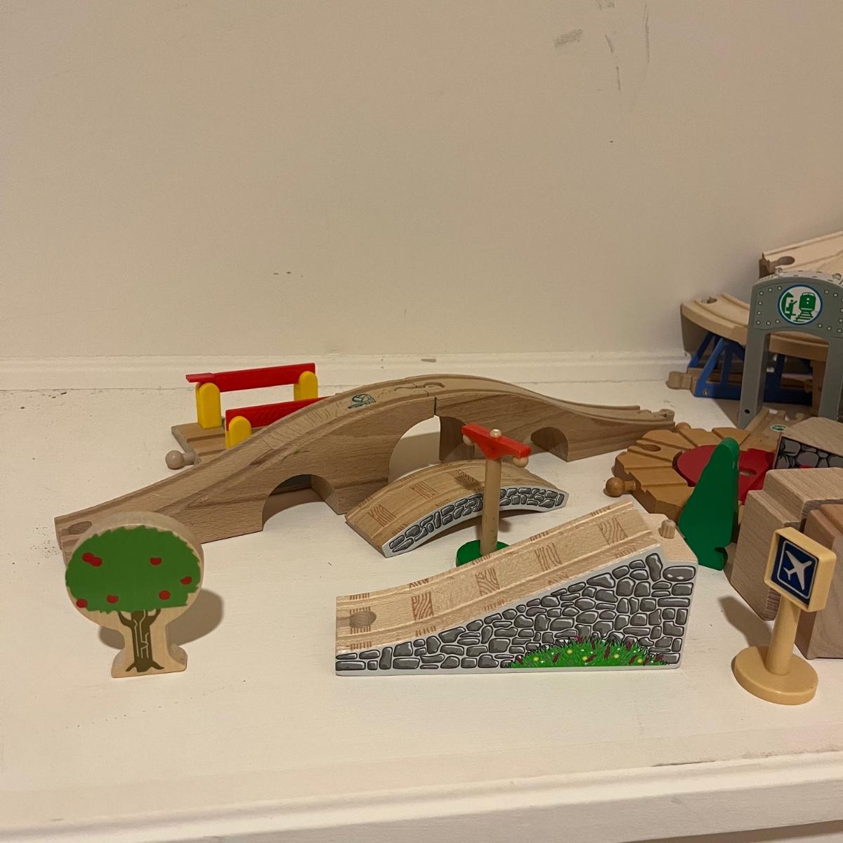 Lot includes a plethora of wooden train tracks that are curved and straight. Also includes a large selection of scenery for the train tracks including bridges, crane, helipad, buildings, trees and more. Helipad measures 4.5” x 5.5” x 8”.