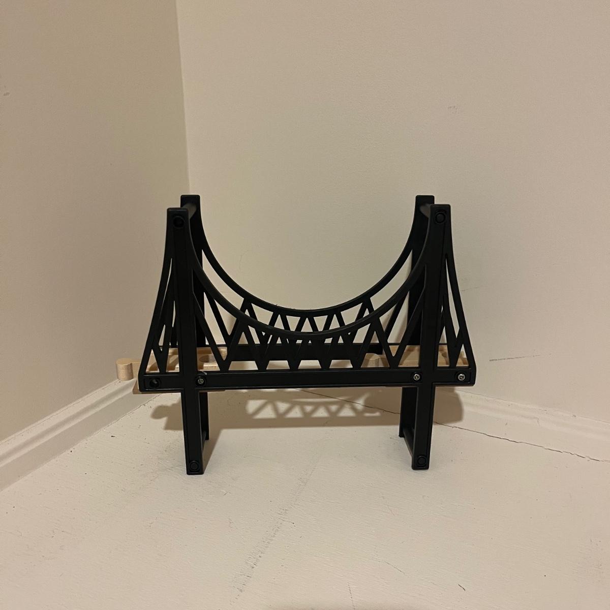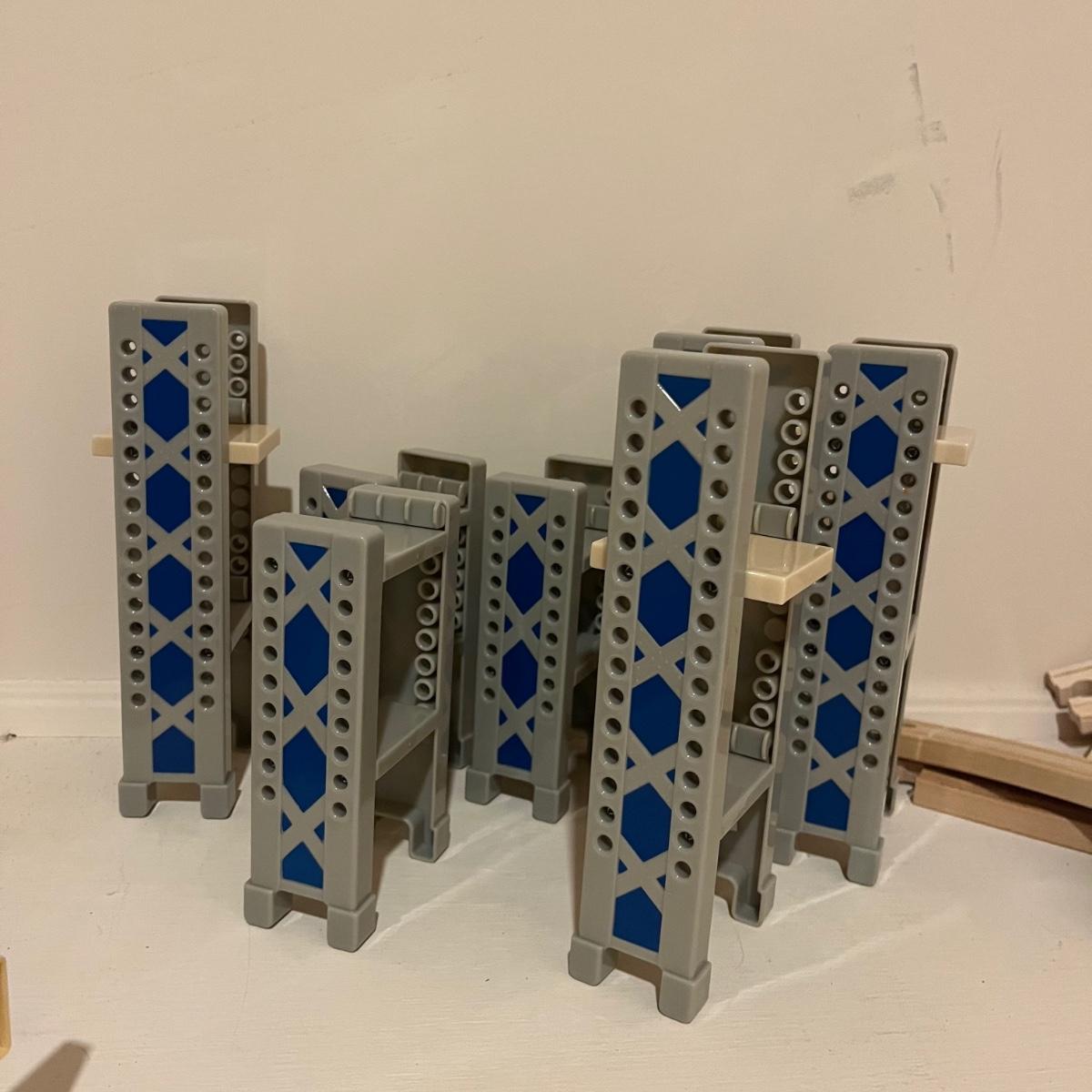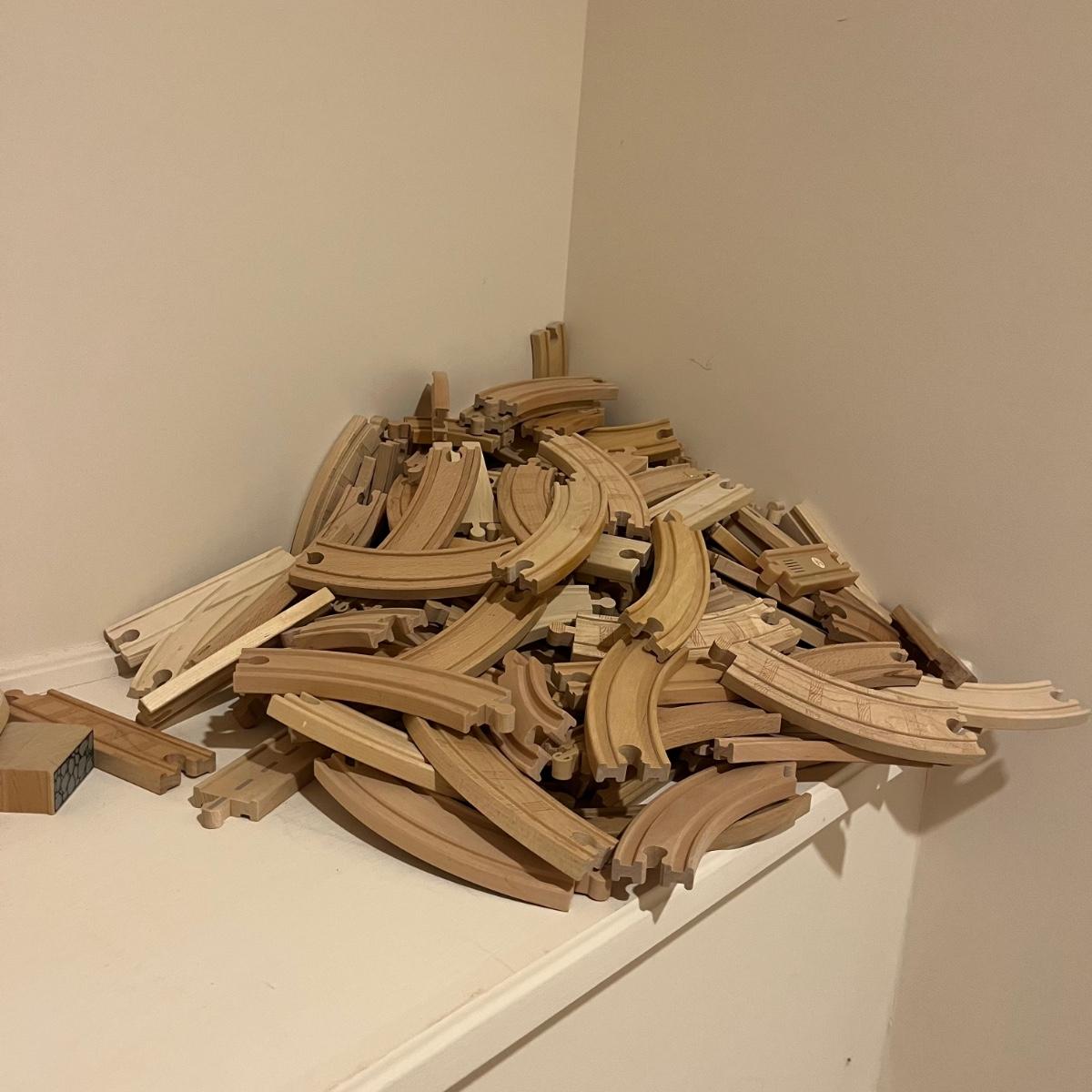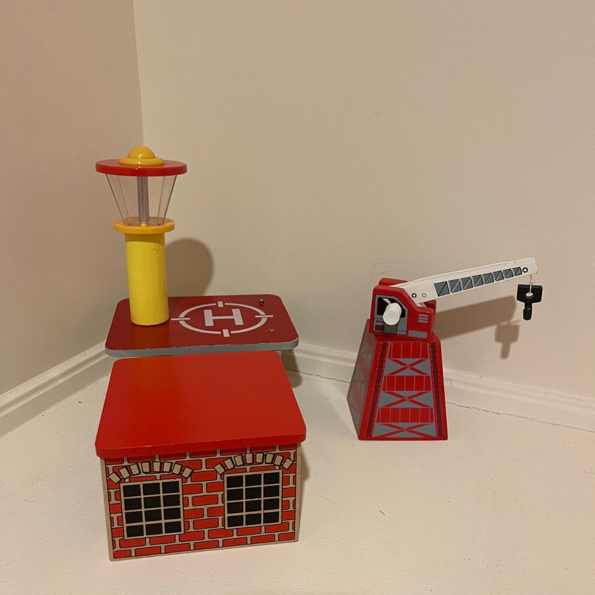 Lot includes a plethora of wooden train tracks that are curved and straight. Also includes a large selection of scenery for the train tracks including bridges, crane, helipad, buildings, trees and more. Helipad measures 4.5” x 5.5” x 8”.