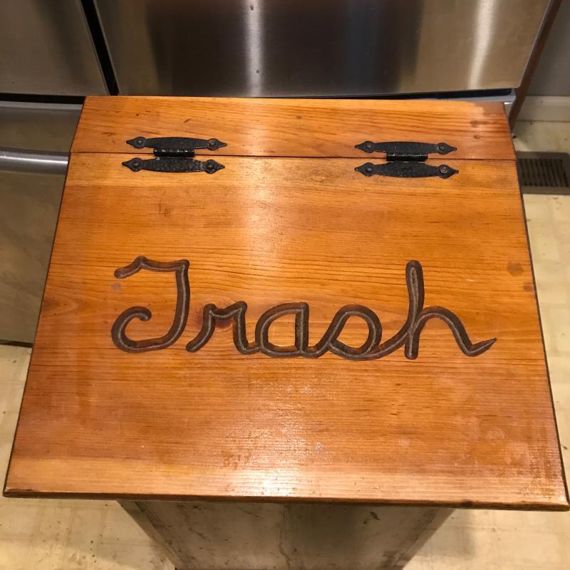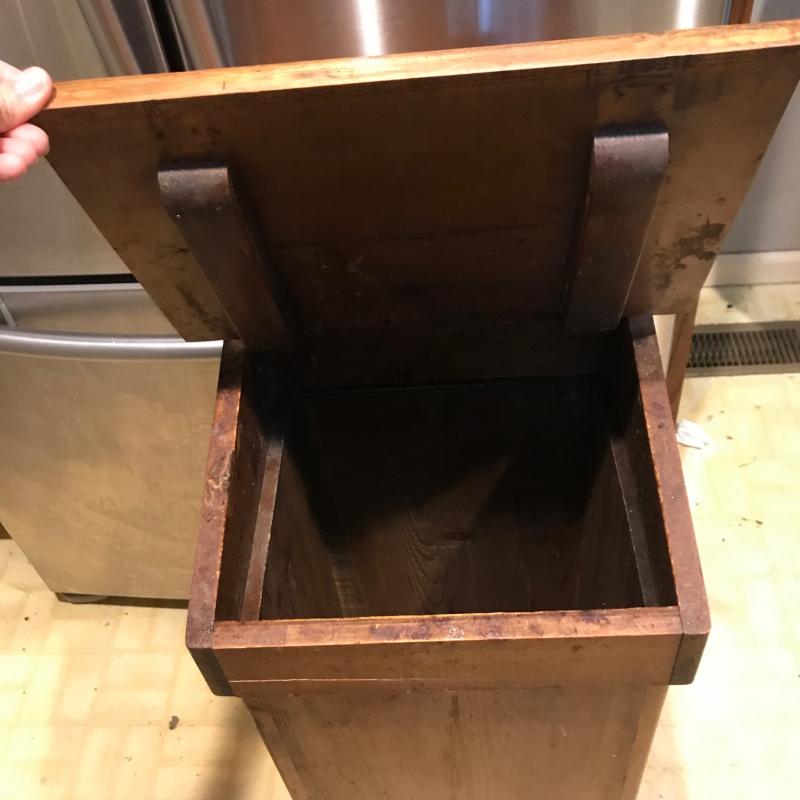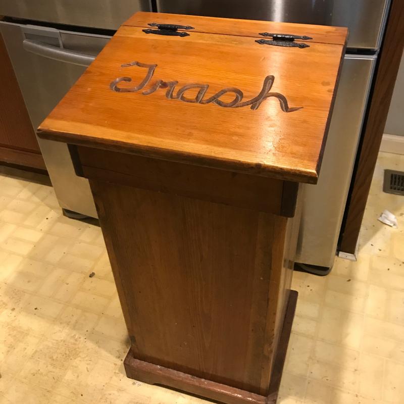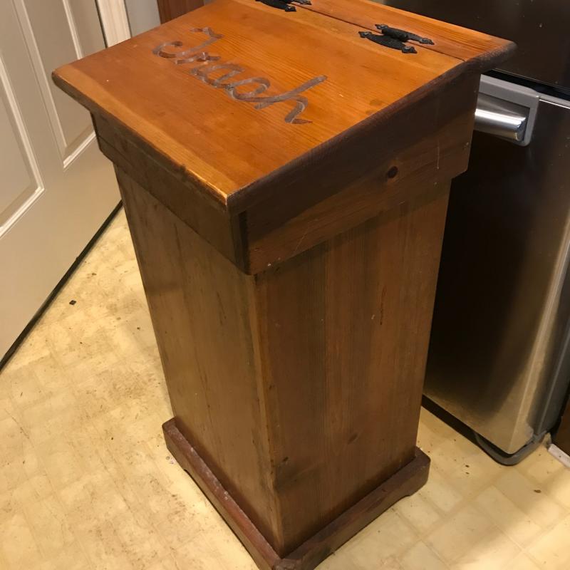 Lot includes wooden trash bin with hinged lid. Approx. 30” x 15” x 14”. No shipping available. Local pickup only in Hendersonville, NC.