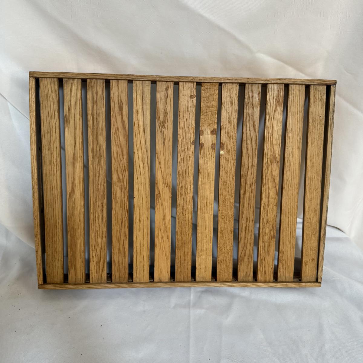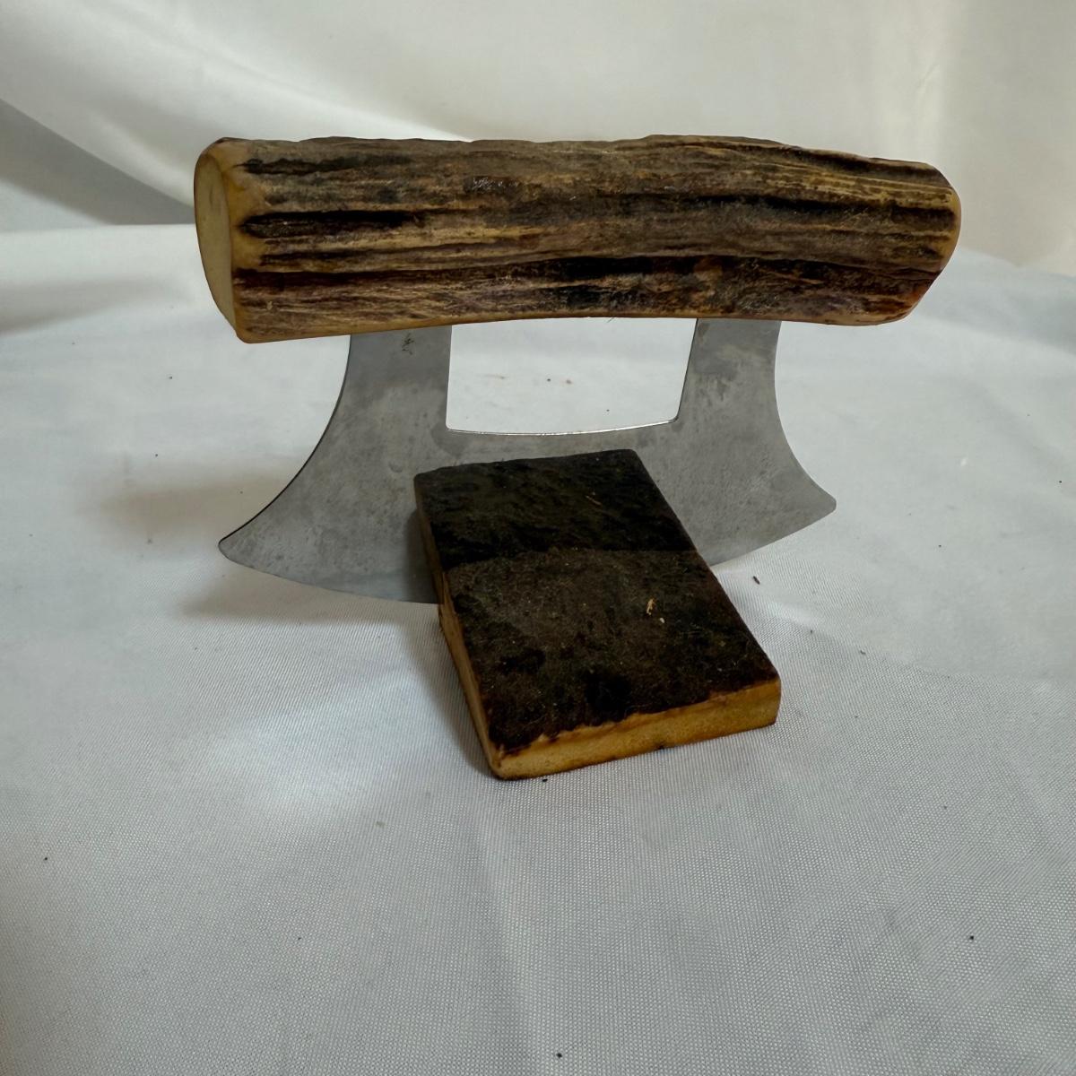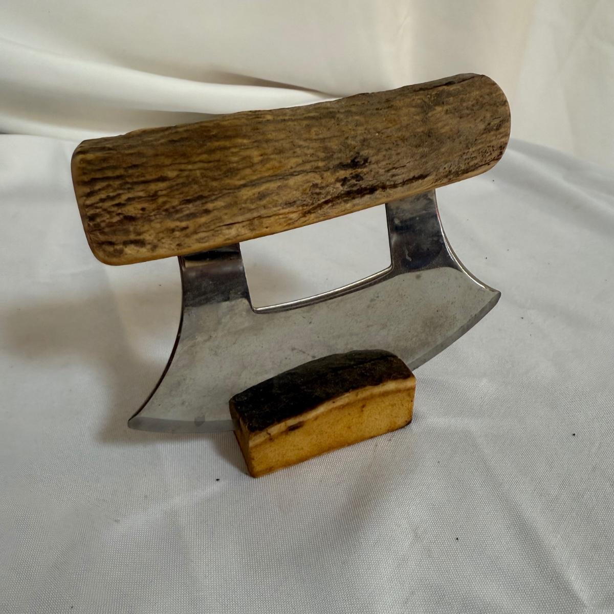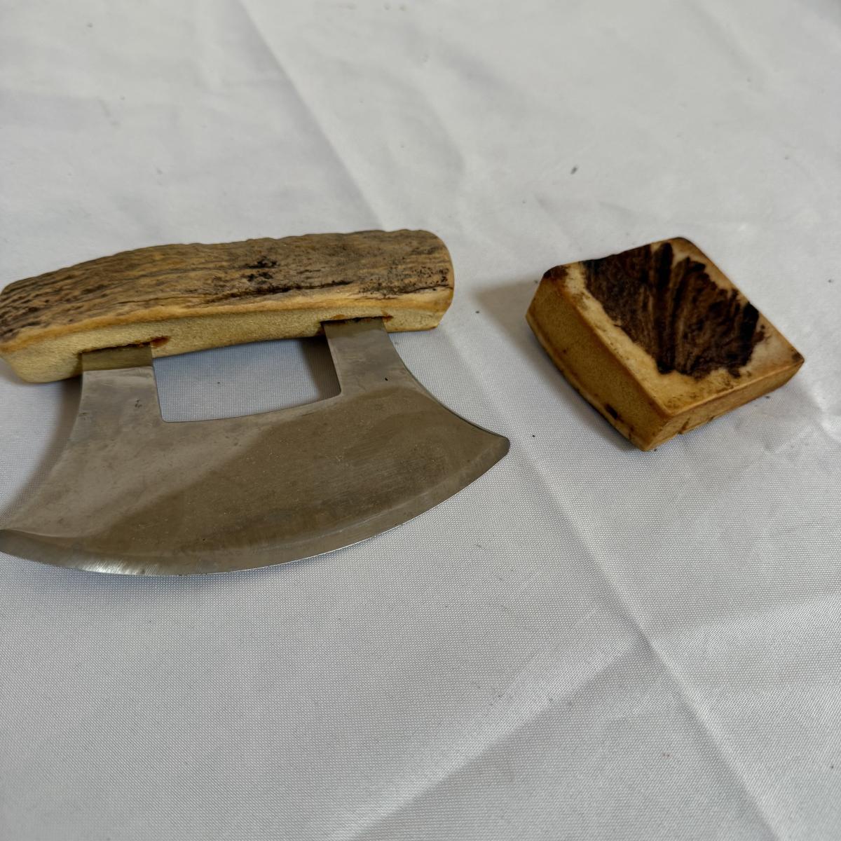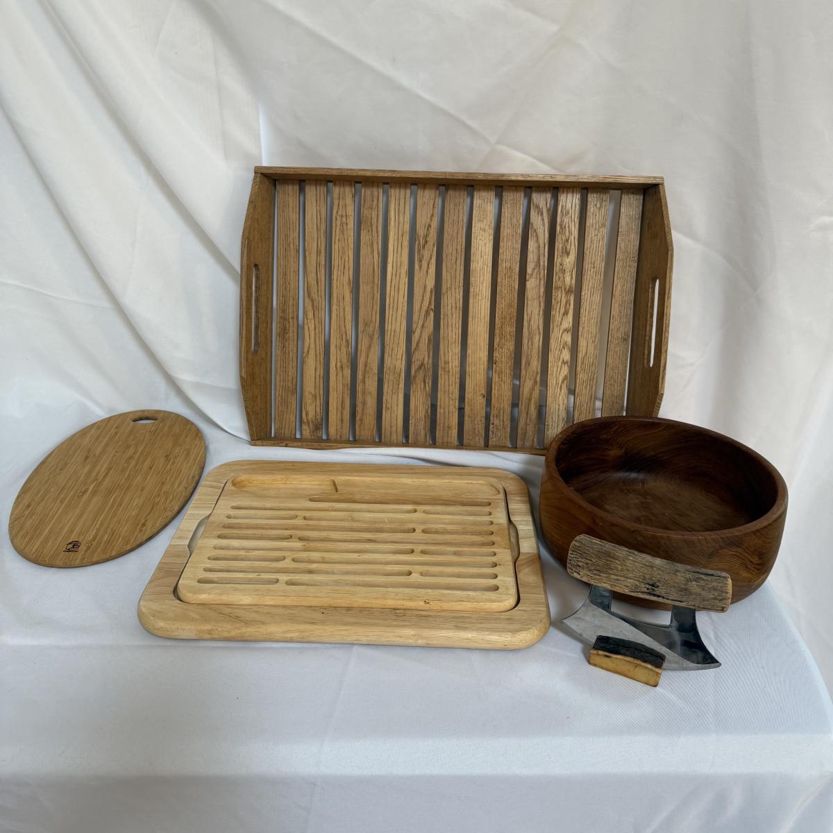 This lot contains five items including a wooden tray that measures 21” x 14.5” x 2.5”H. Also included is an oval cutting board as well as a rectangular one with a drain pop in piece. Next is a dark wood salad bowl that measures 9.75”D x 4”H. Lastly is an antler cheese knife with its own little stand.