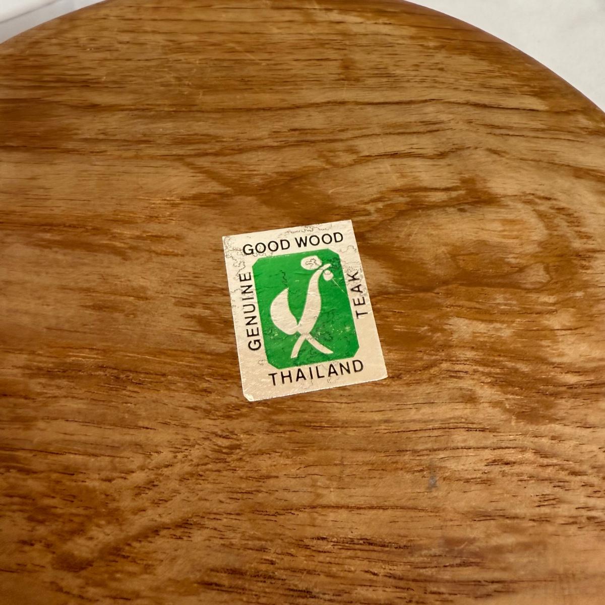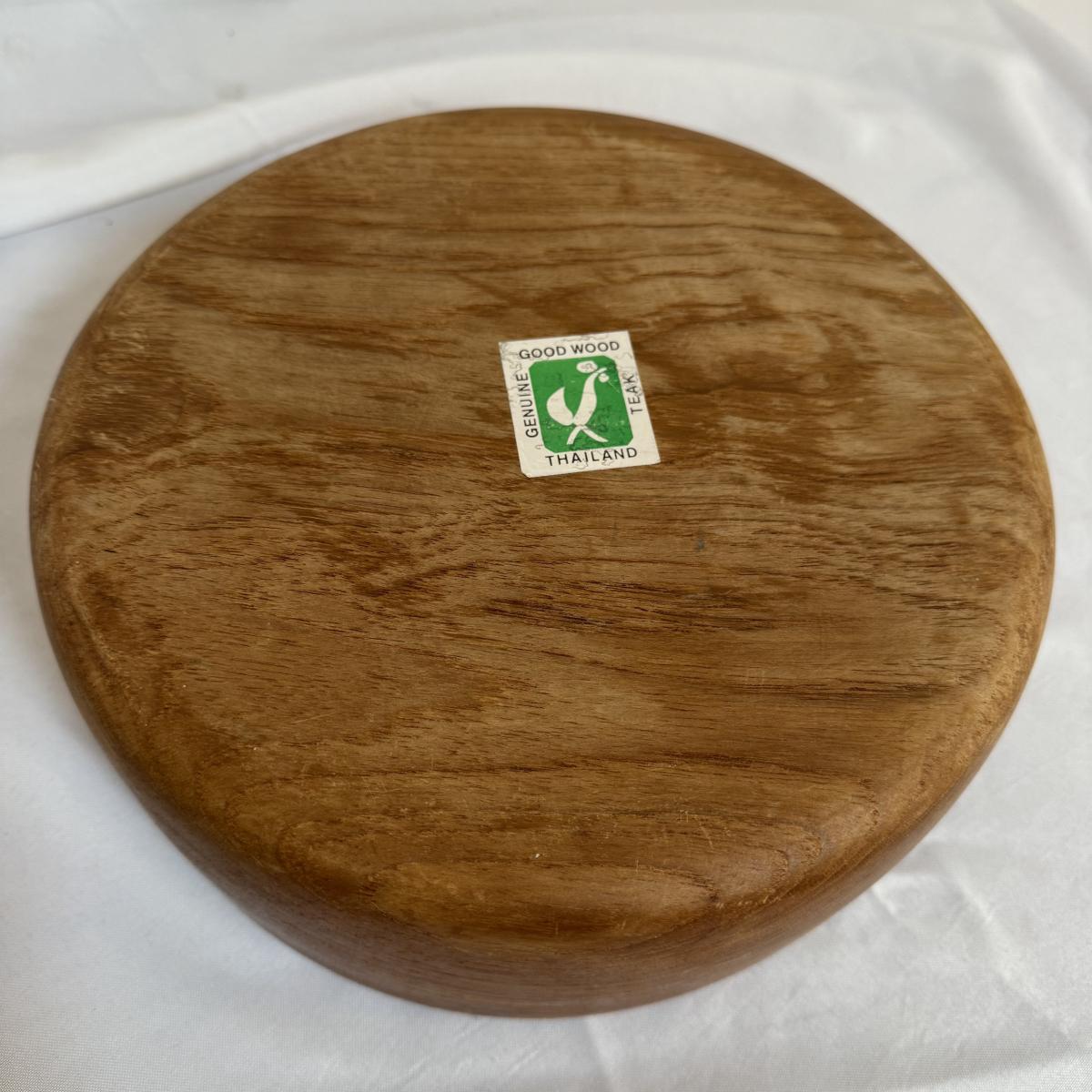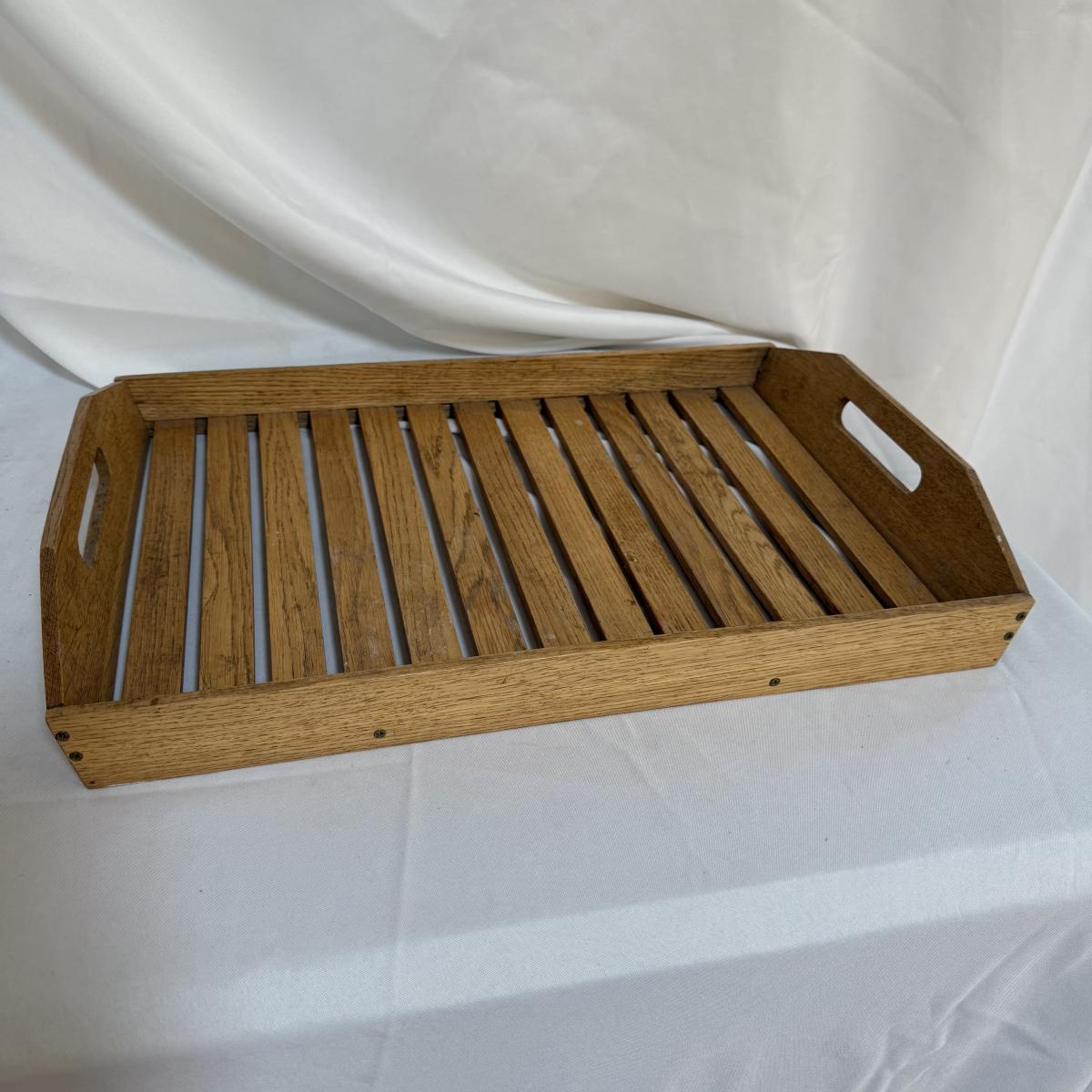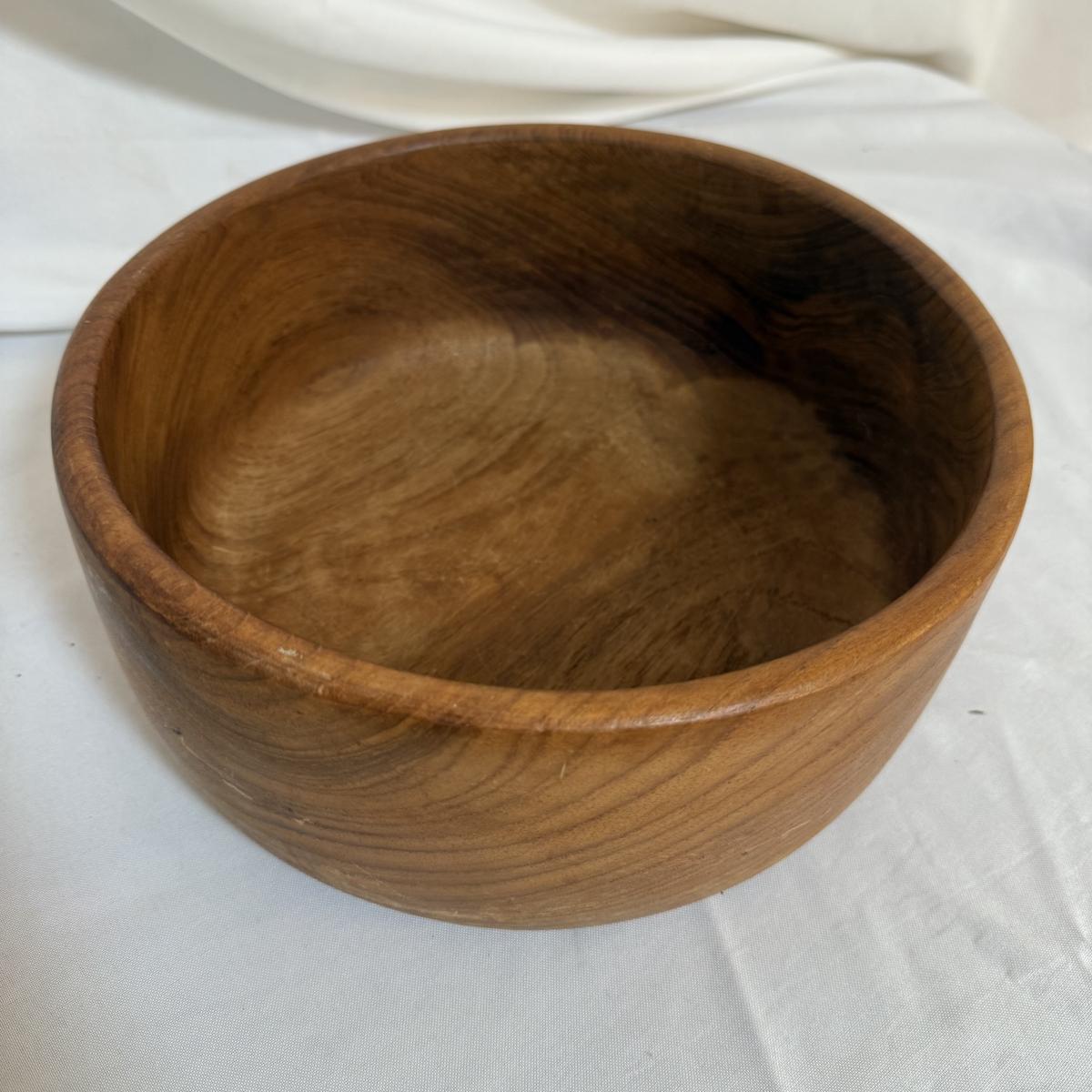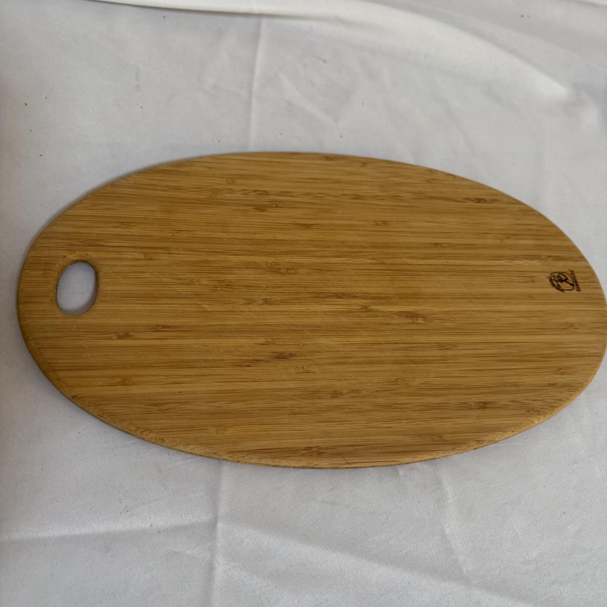 This lot contains five items including a wooden tray that measures 21” x 14.5” x 2.5”H. Also included is an oval cutting board as well as a rectangular one with a drain pop in piece. Next is a dark wood salad bowl that measures 9.75”D x 4”H. Lastly is an antler cheese knife with its own little stand.