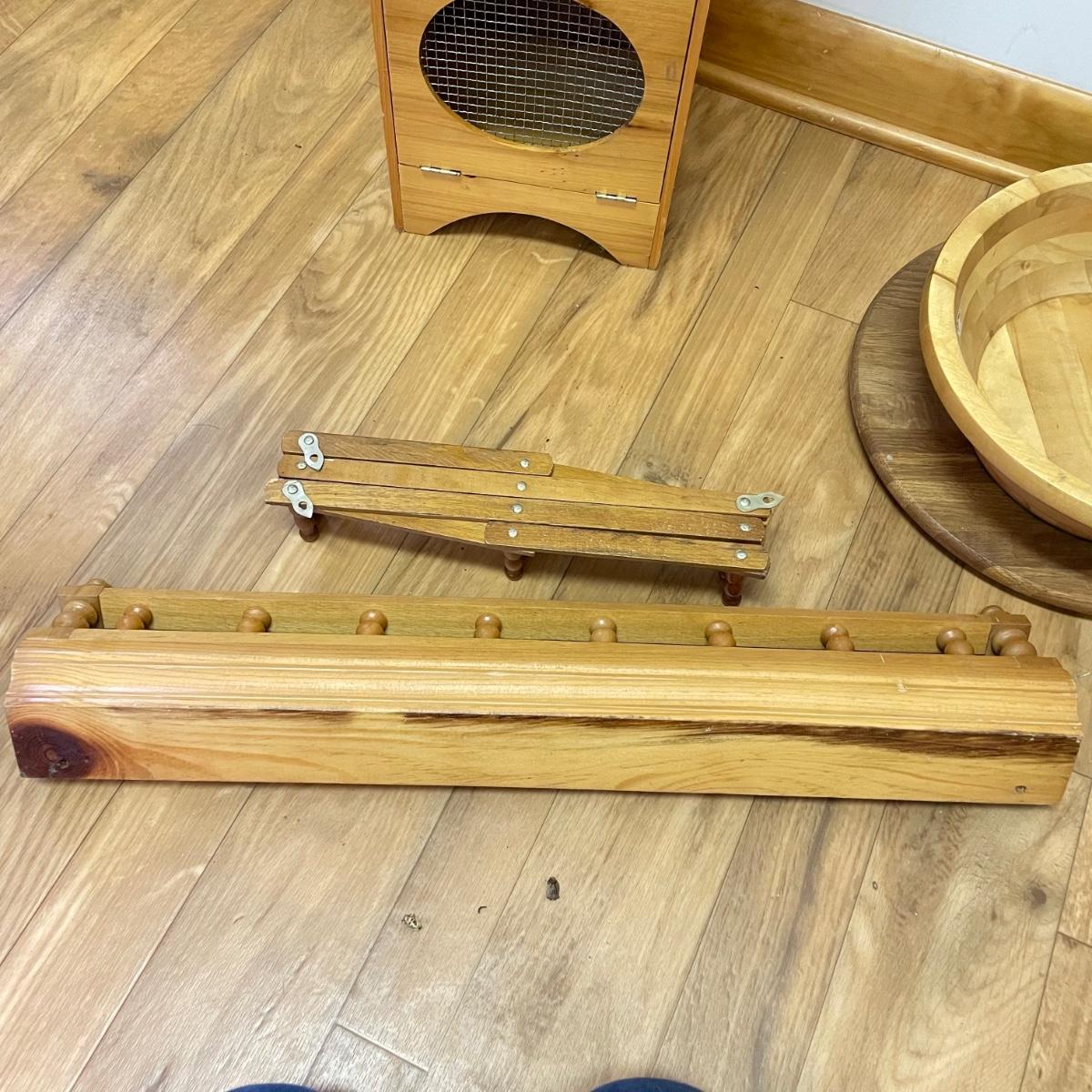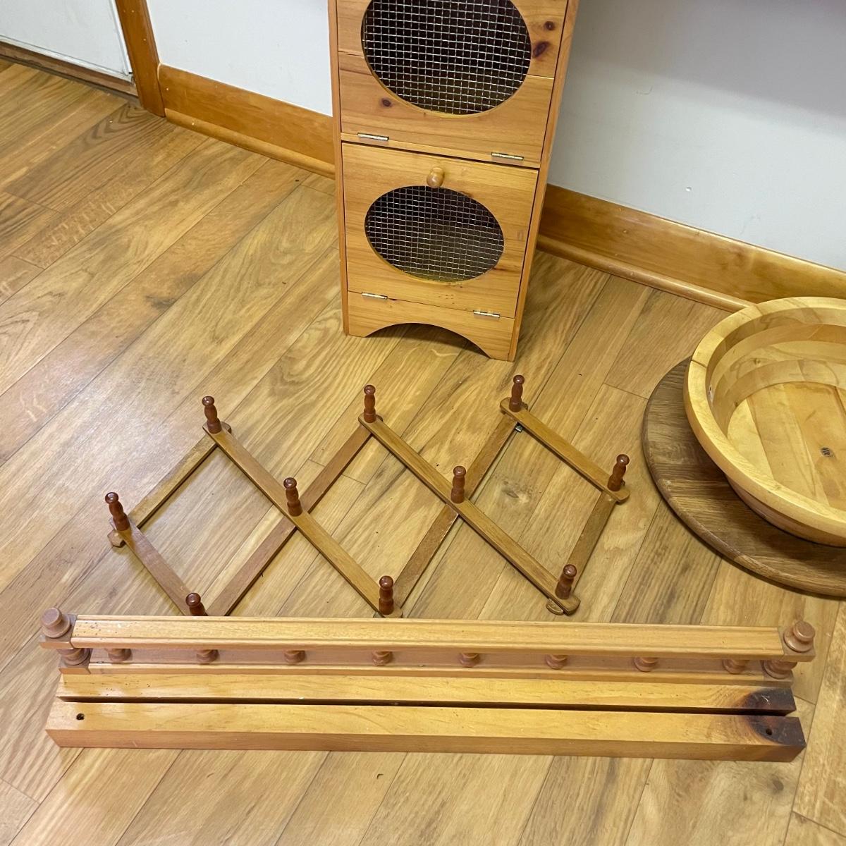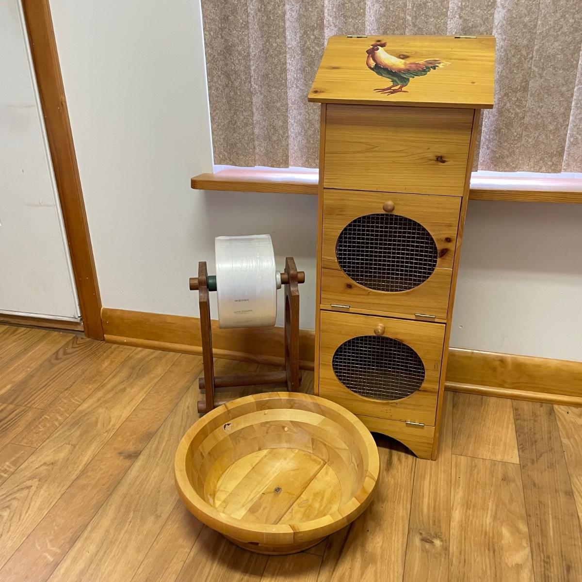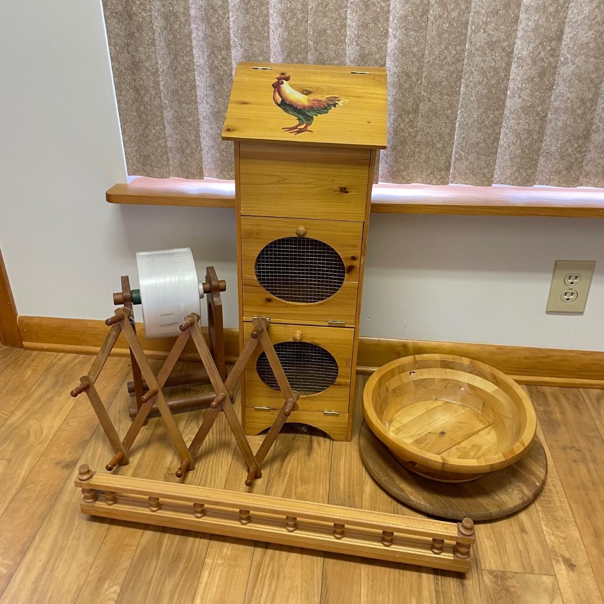 Six useful and decorative wooden items. A rooster painted on a decorative potato box, it is fairly lightweight and has a crack in the middle door on the outside only. This measures 8” x 10” x 27”H. Another fun item is a rack with a roll of disposable vegetable bags (bags included), this rack is also sized well to hold a toilet paper roll. There is also a a bowl with a sticker from North Pole Alaska, WXfords Alaskan Birch (12.5”D) and a Lazy Susan from The Original Walnut Bowl Factory Store. The bowl has WX marked in the center and a couple small spots with worn finish. Lastly, an adjustable wall-mounted mug rack and a wooden plate display shelf. See images. Local pick up only.