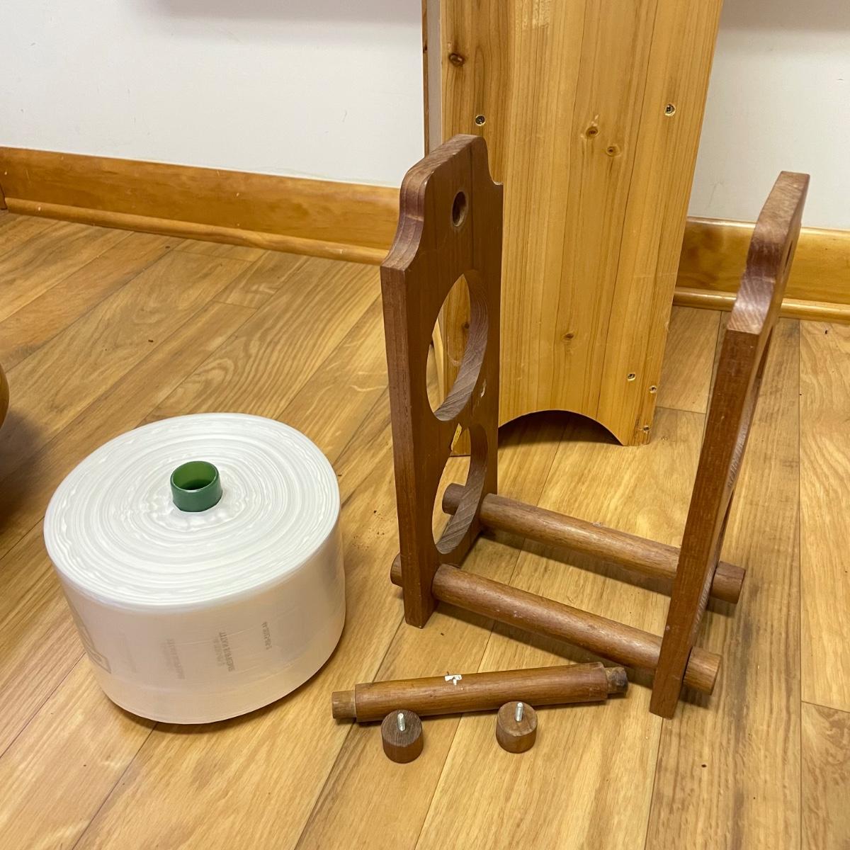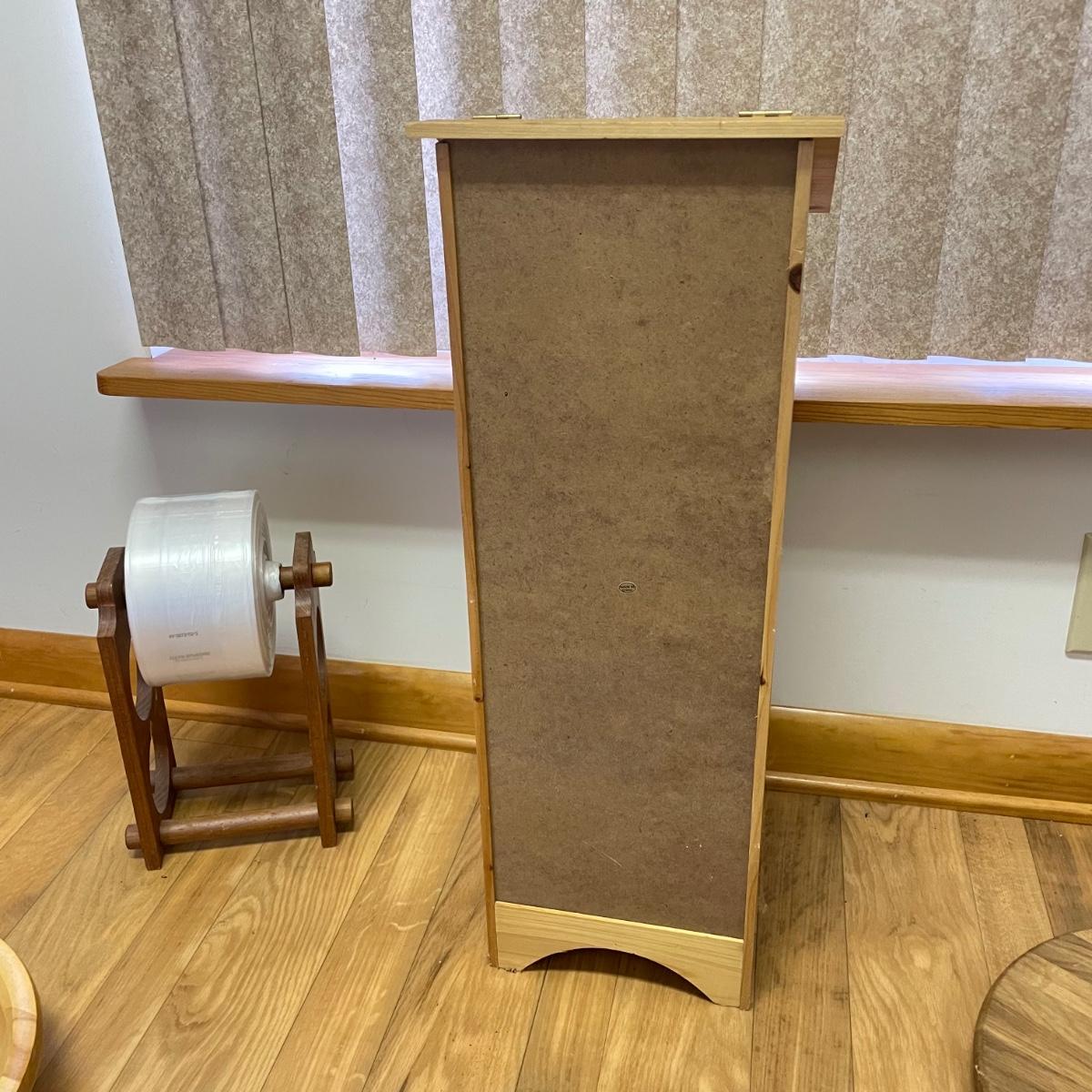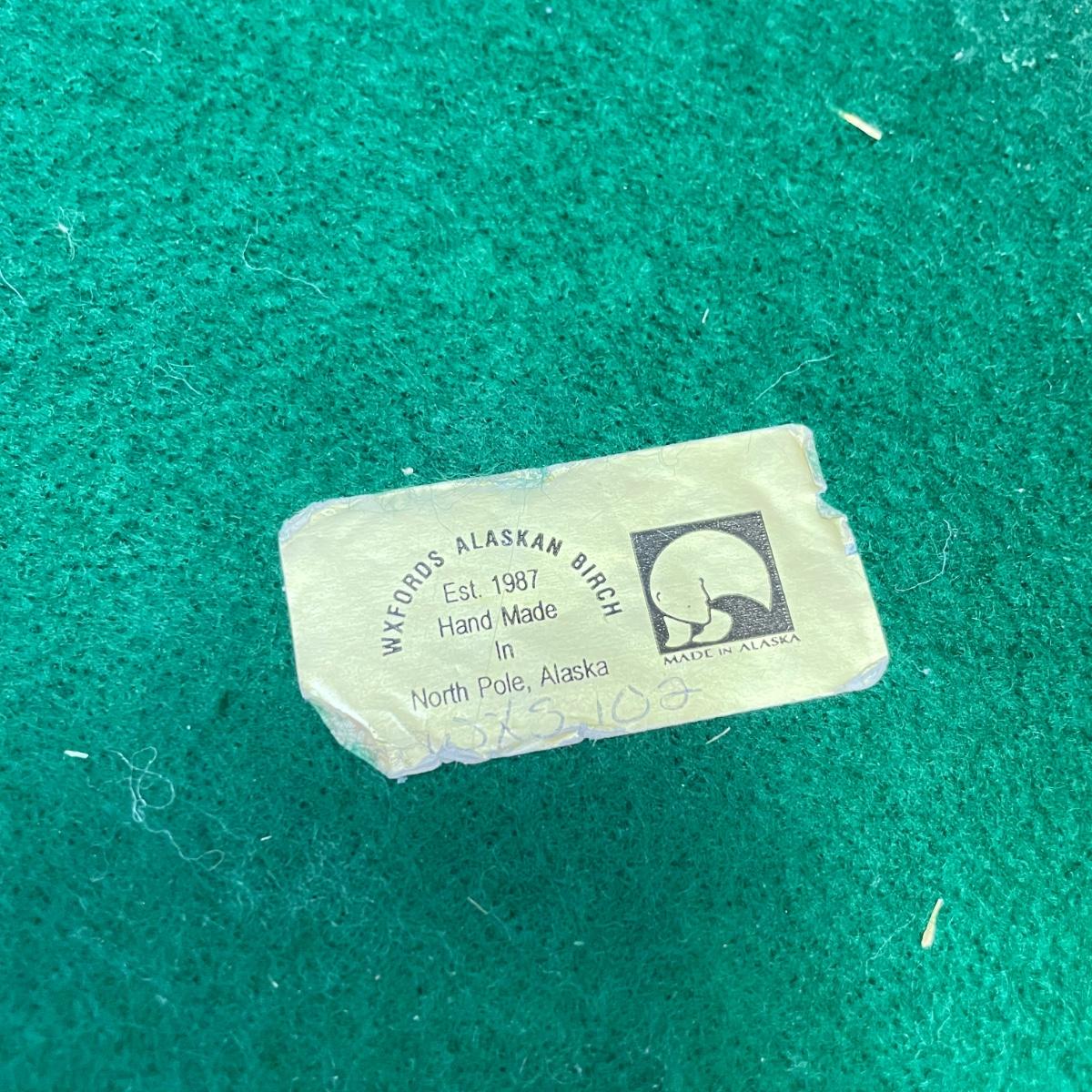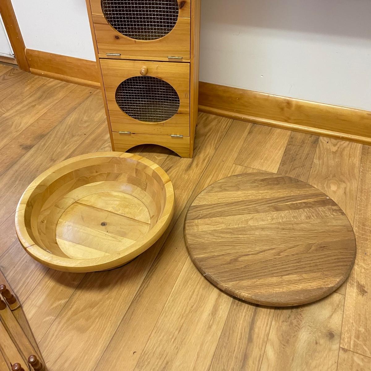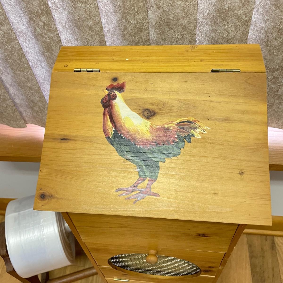 Six useful and decorative wooden items. A rooster painted on a decorative potato box, it is fairly lightweight and has a crack in the middle door on the outside only. This measures 8” x 10” x 27”H. Another fun item is a rack with a roll of disposable vegetable bags (bags included), this rack is also sized well to hold a toilet paper roll. There is also a a bowl with a sticker from North Pole Alaska, WXfords Alaskan Birch (12.5”D) and a Lazy Susan from The Original Walnut Bowl Factory Store. The bowl has WX marked in the center and a couple small spots with worn finish. Lastly, an adjustable wall-mounted mug rack and a wooden plate display shelf. See images. Local pick up only.