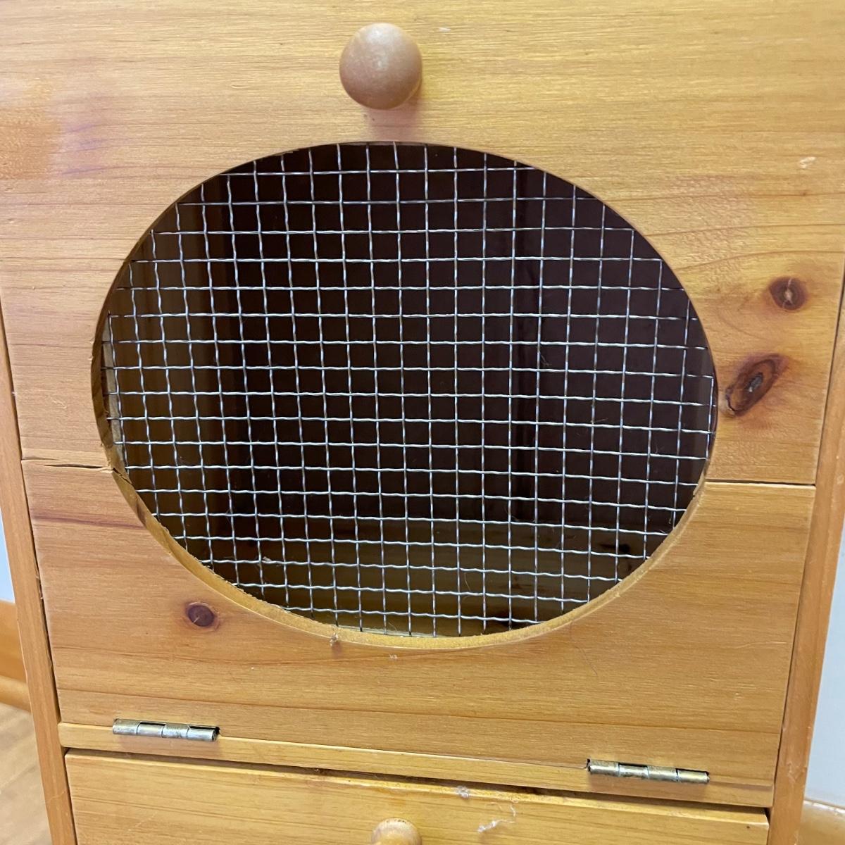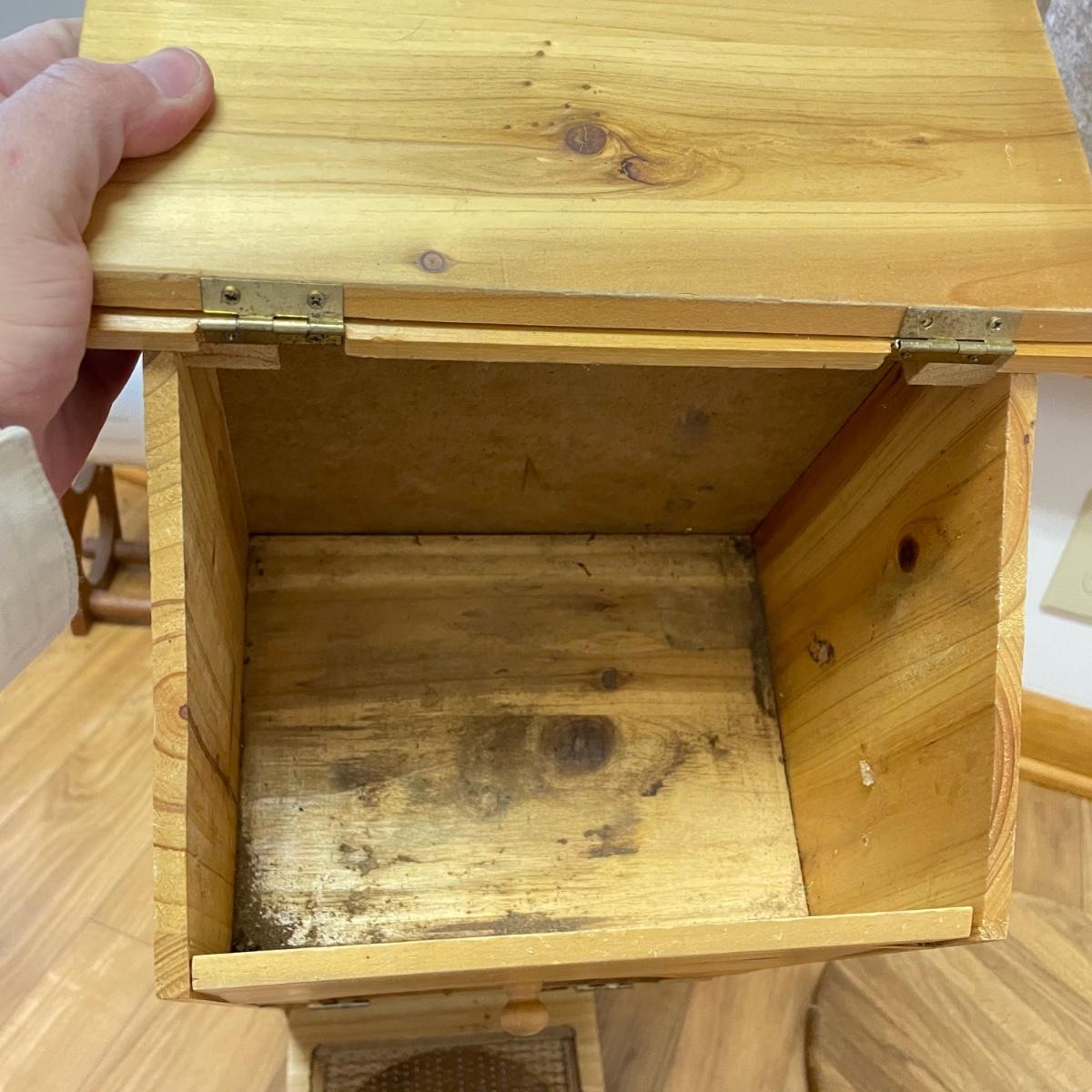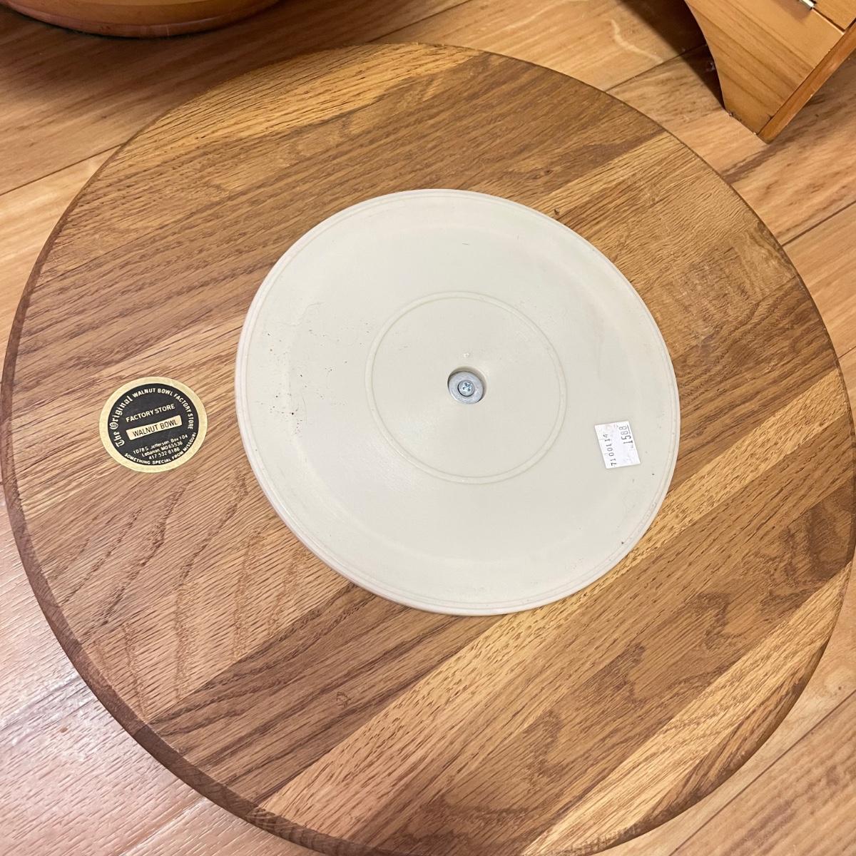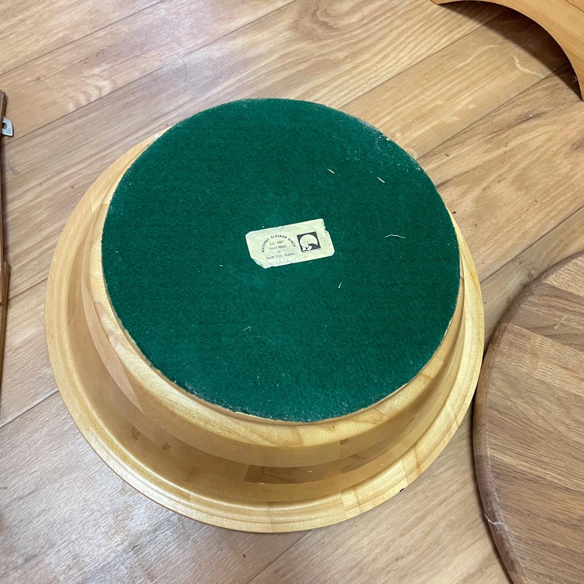 Six useful and decorative wooden items. A rooster painted on a decorative potato box, it is fairly lightweight and has a crack in the middle door on the outside only. This measures 8” x 10” x 27”H. Another fun item is a rack with a roll of disposable vegetable bags (bags included), this rack is also sized well to hold a toilet paper roll. There is also a a bowl with a sticker from North Pole Alaska, WXfords Alaskan Birch (12.5”D) and a Lazy Susan from The Original Walnut Bowl Factory Store. The bowl has WX marked in the center and a couple small spots with worn finish. Lastly, an adjustable wall-mounted mug rack and a wooden plate display shelf. See images. Local pick up only.