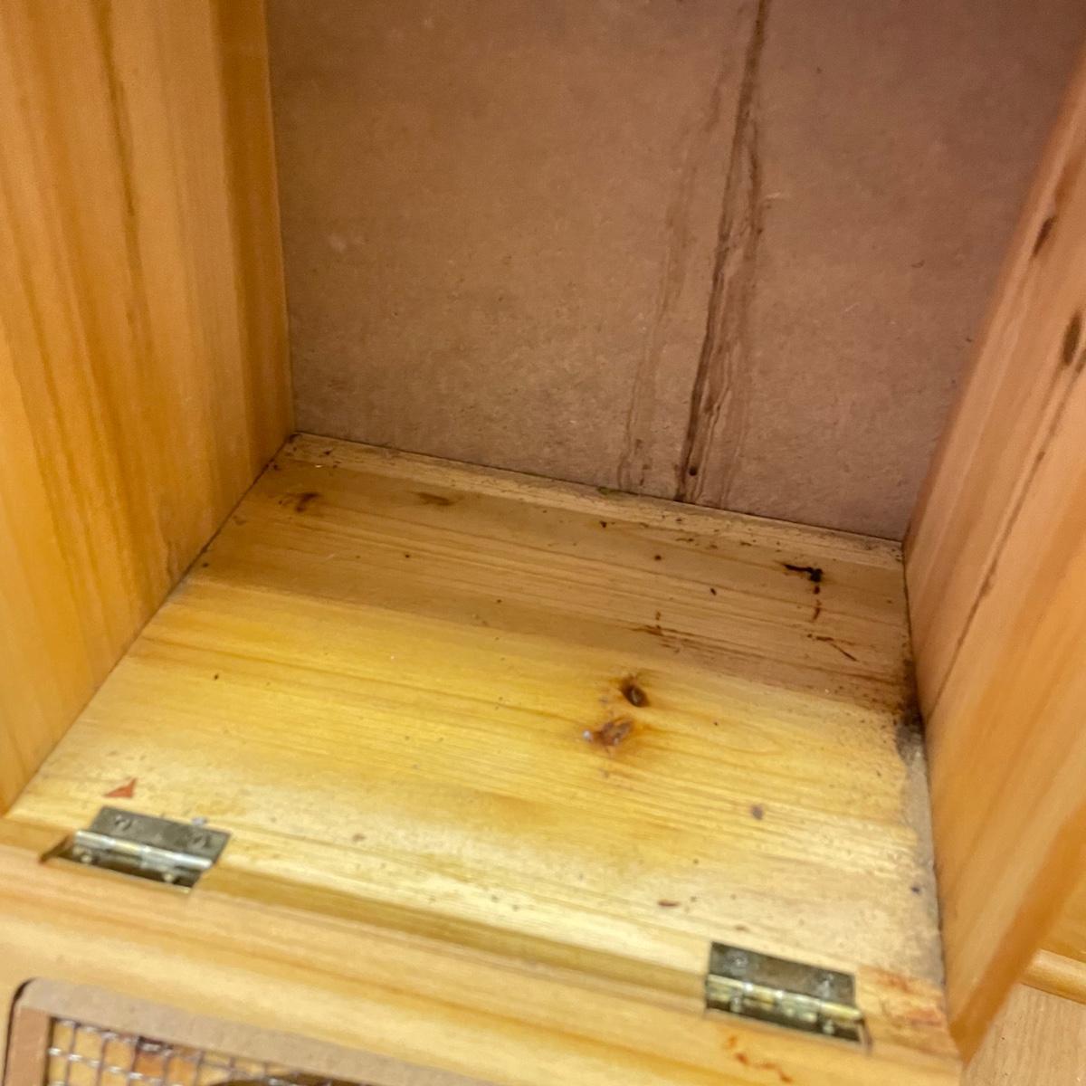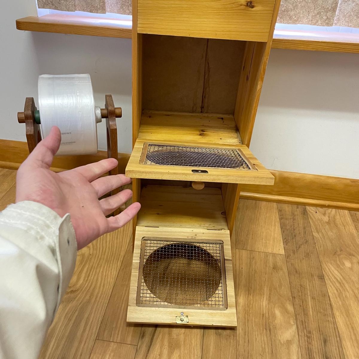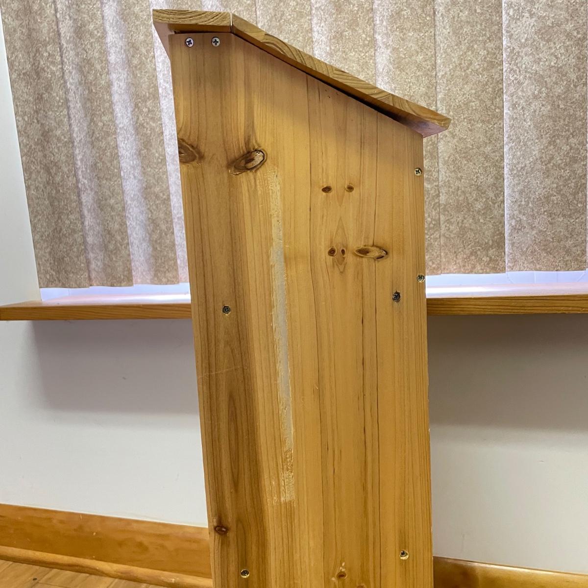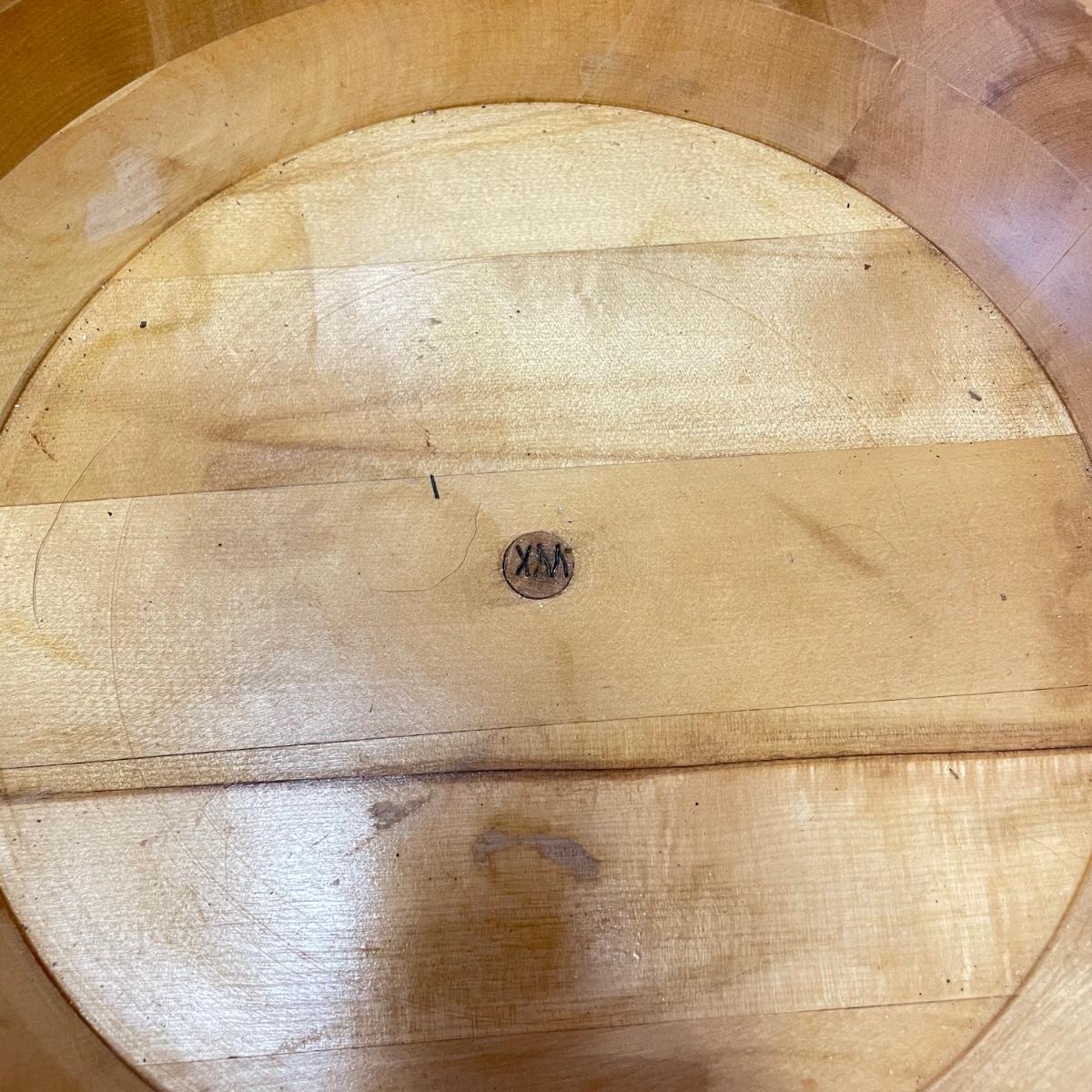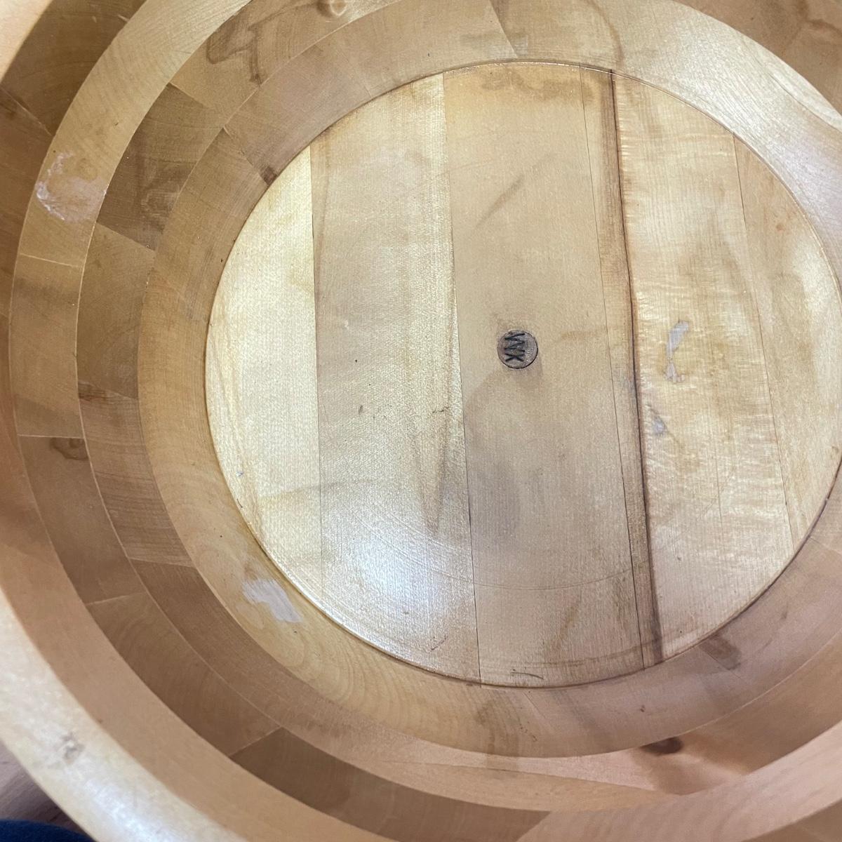 Six useful and decorative wooden items. A rooster painted on a decorative potato box, it is fairly lightweight and has a crack in the middle door on the outside only. This measures 8” x 10” x 27”H. Another fun item is a rack with a roll of disposable vegetable bags (bags included), this rack is also sized well to hold a toilet paper roll. There is also a a bowl with a sticker from North Pole Alaska, WXfords Alaskan Birch (12.5”D) and a Lazy Susan from The Original Walnut Bowl Factory Store. The bowl has WX marked in the center and a couple small spots with worn finish. Lastly, an adjustable wall-mounted mug rack and a wooden plate display shelf. See images. Local pick up only.