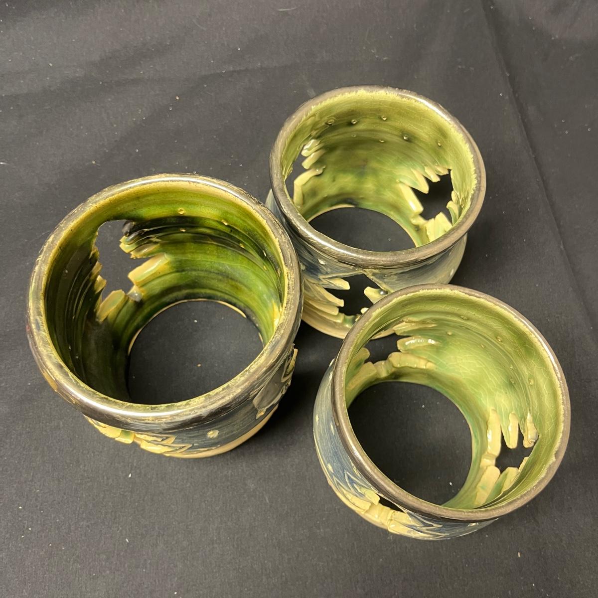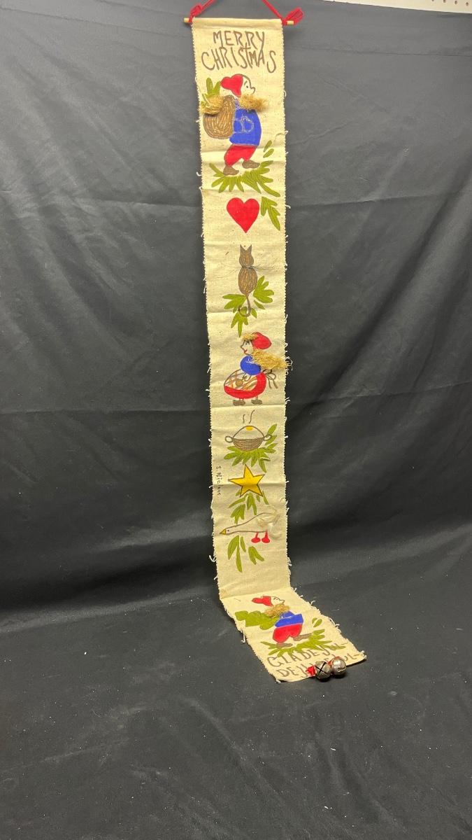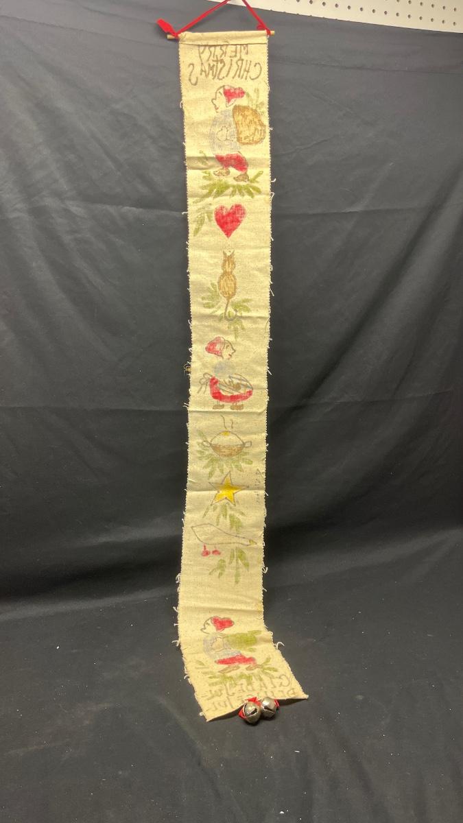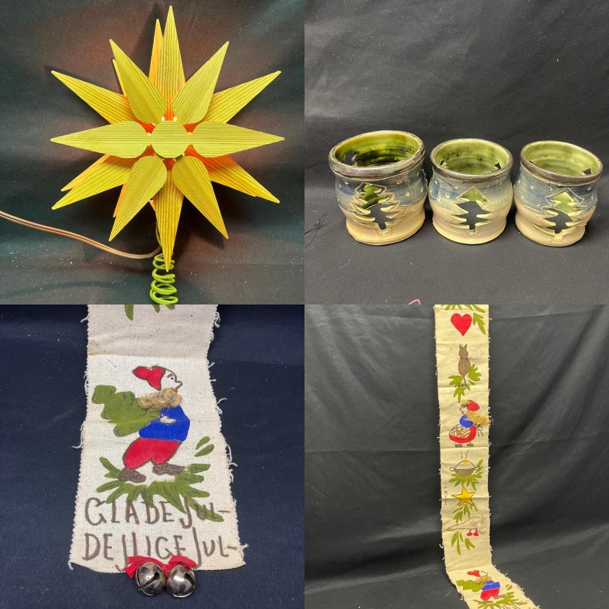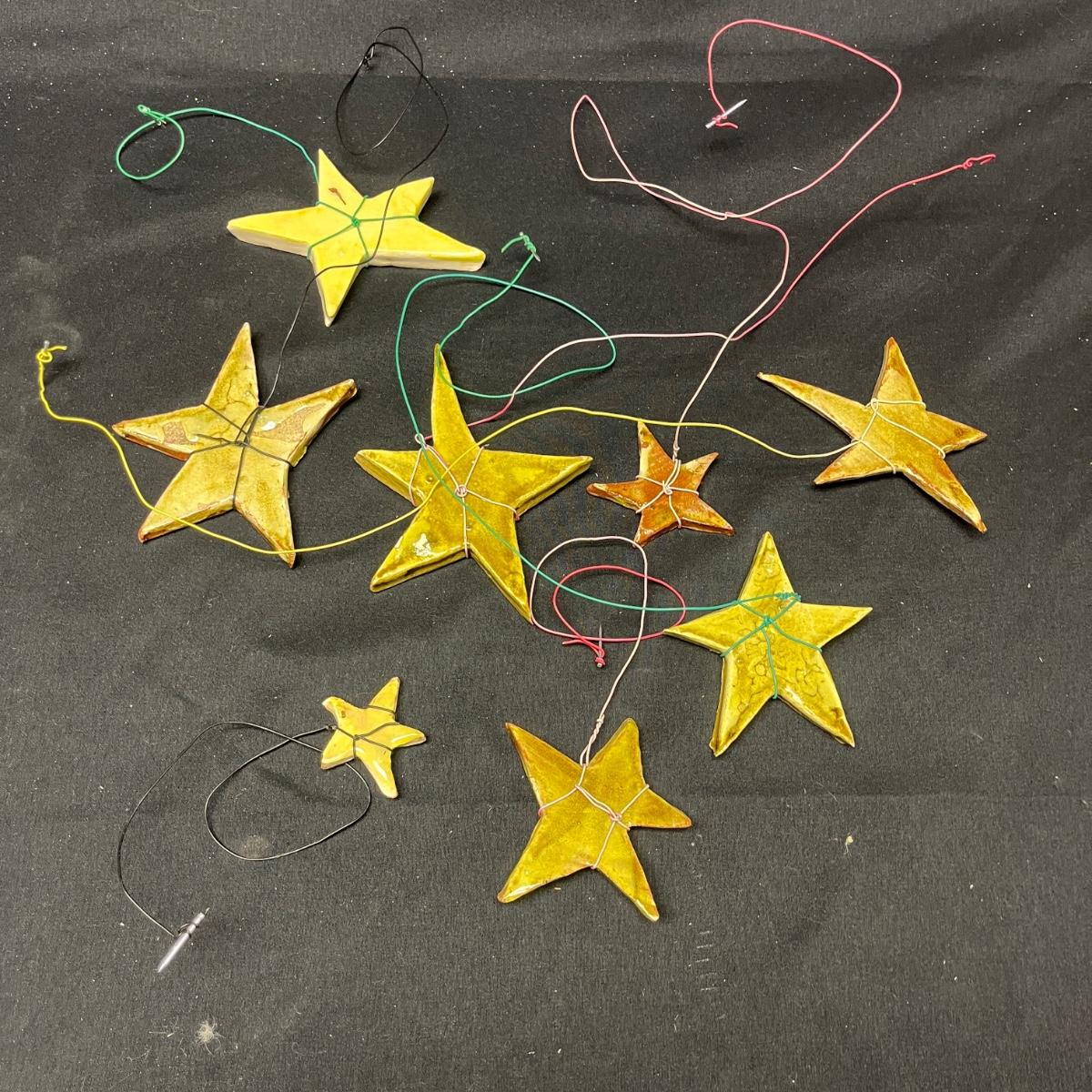 Lot includes a lighted wooden tree topper that powered on when plugged in, eight ceramic star ornaments, three ceramic candle surrounds, and a fabric Christmas wall hanging. Tree topper measures 9" x 3.5" x 12"H and has an inline on off switch.