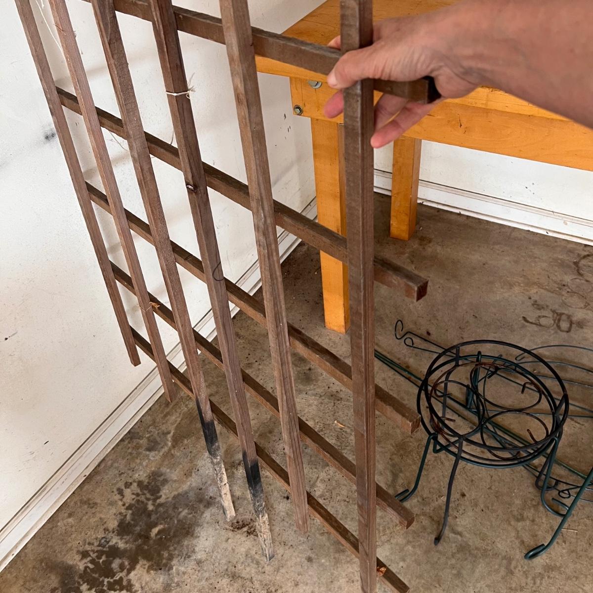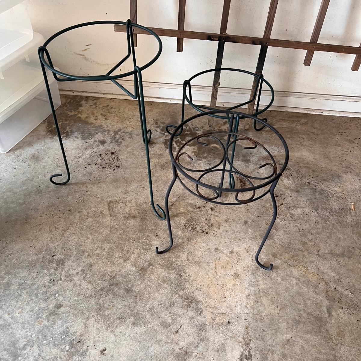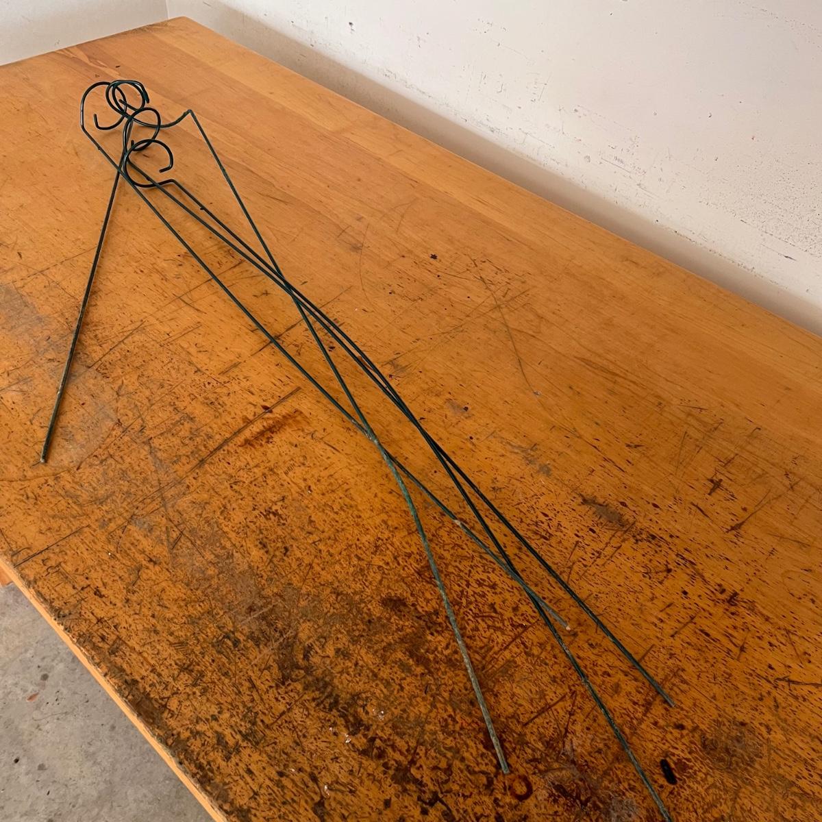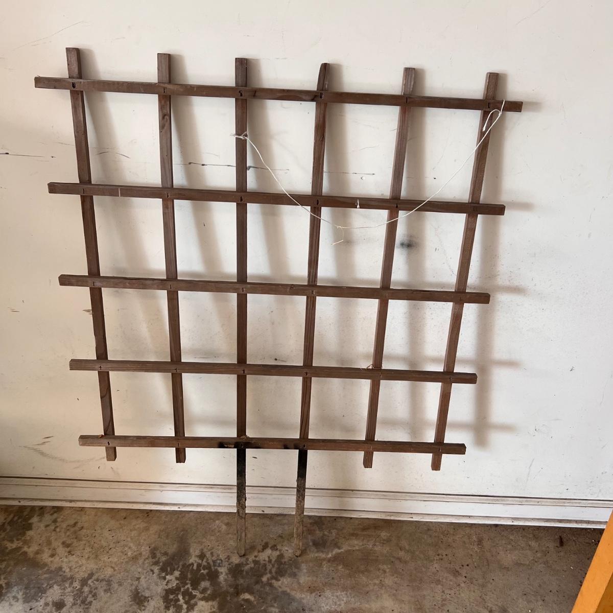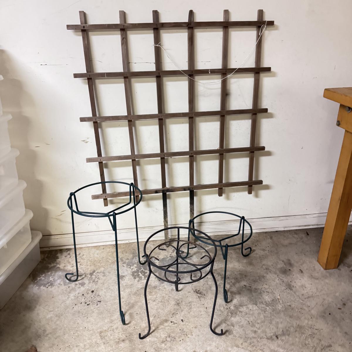This wooden plant trellis measures 36” x 48”H. One black and two green plant pot stands are rubber coated metal as are the various plant stakes. Tallest stand measures 12”D x 20”H.