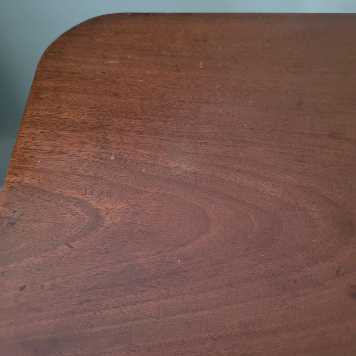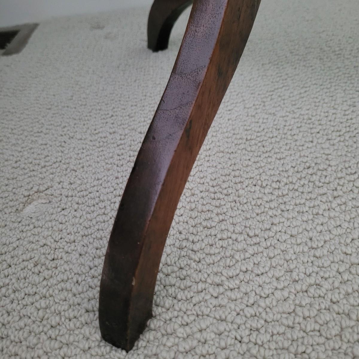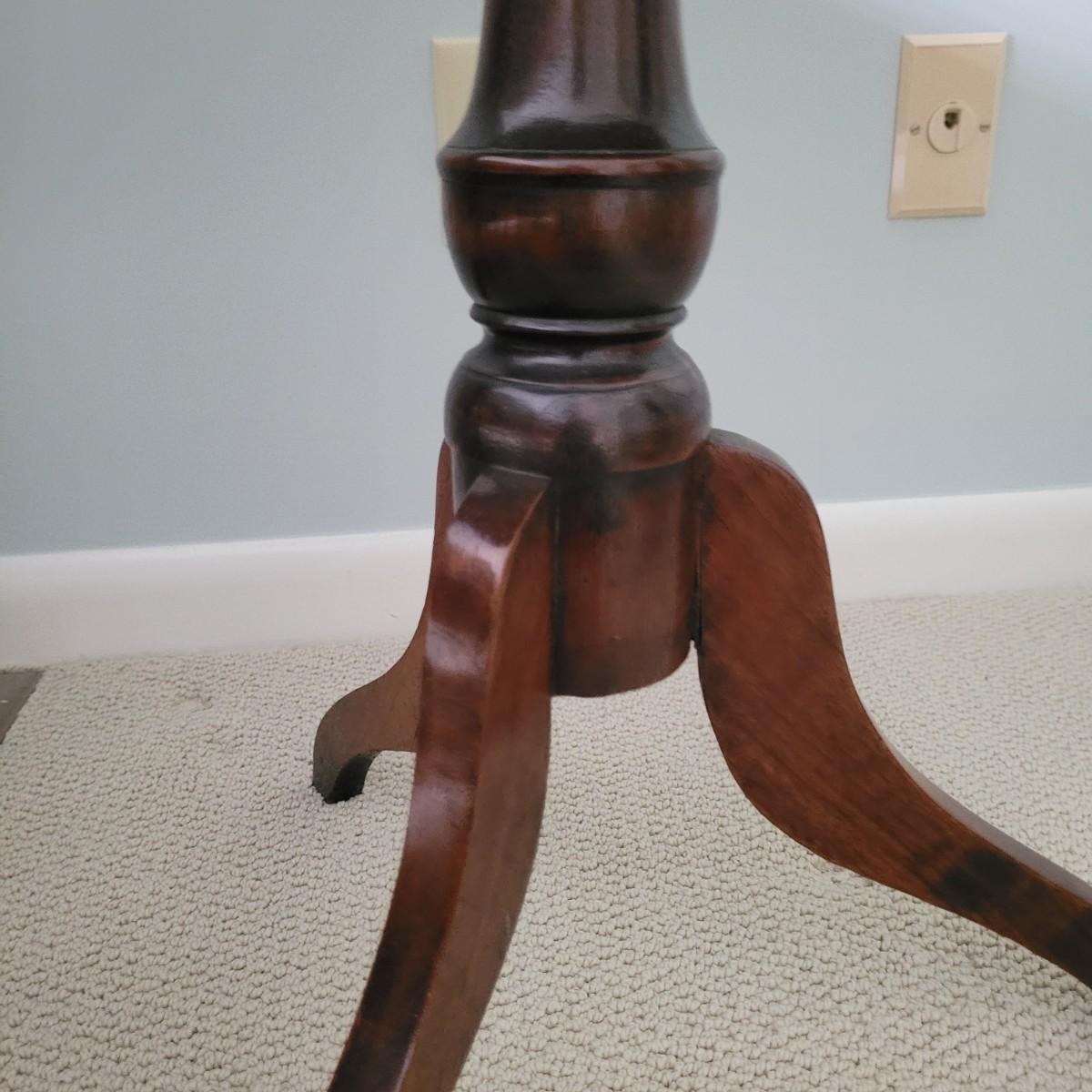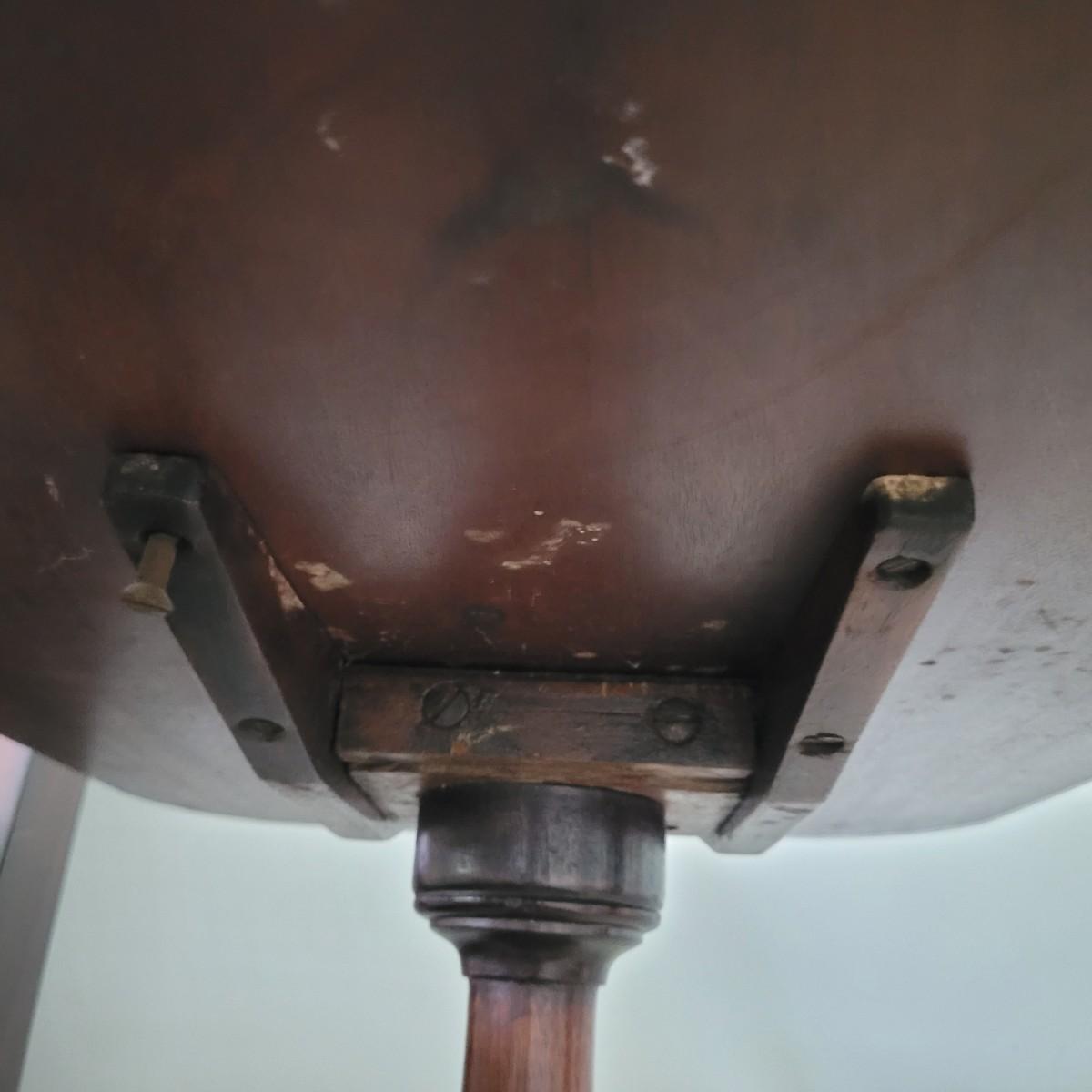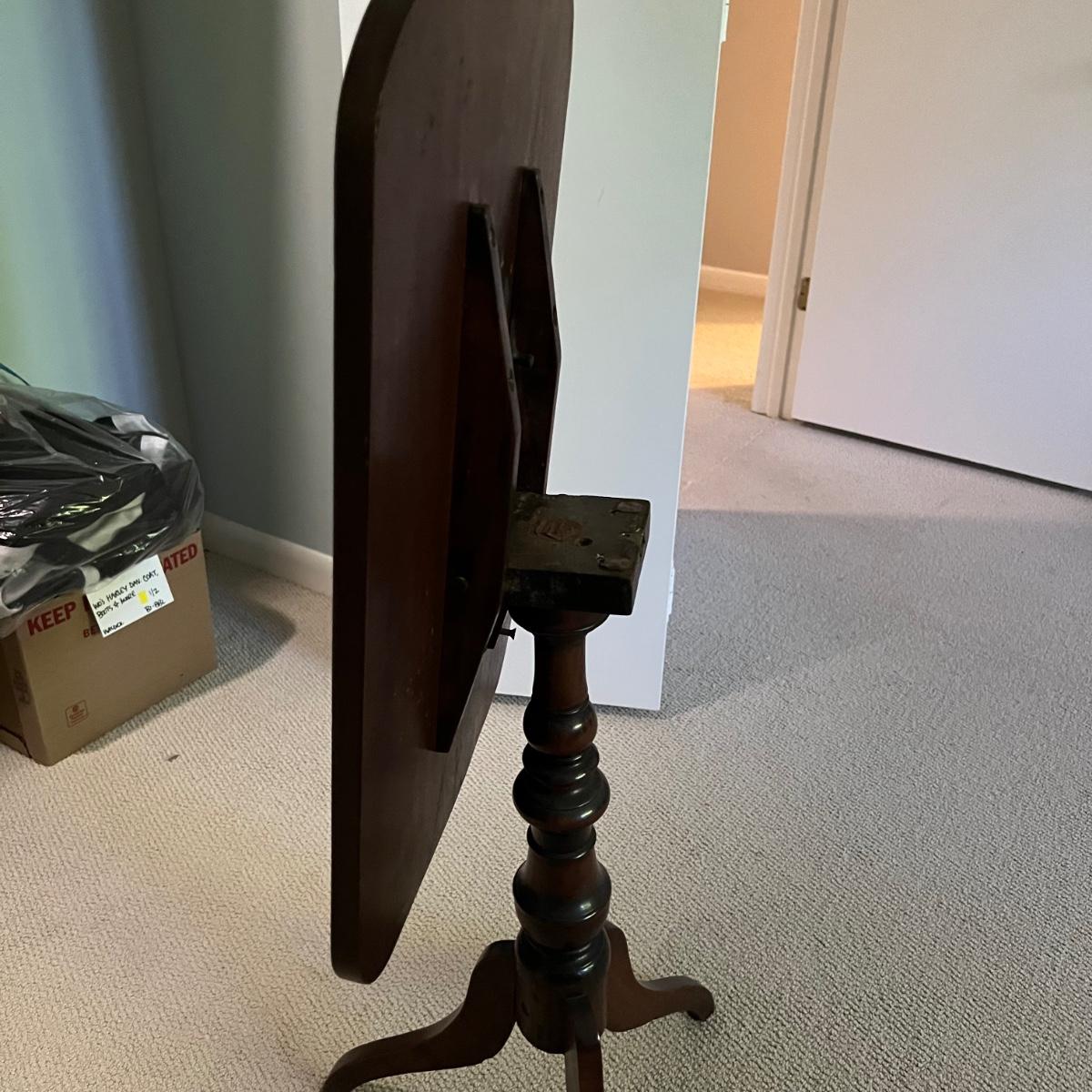 This simple yet elegant wooden tripod side table makes a nice addition to any room in the home. The mechanism on the bottom allows the table to tilt completely vertically as shown in photo. Some scuffs and marks (see photos). Measures approximately 24" x 18" x 28"H. Local pickup only.