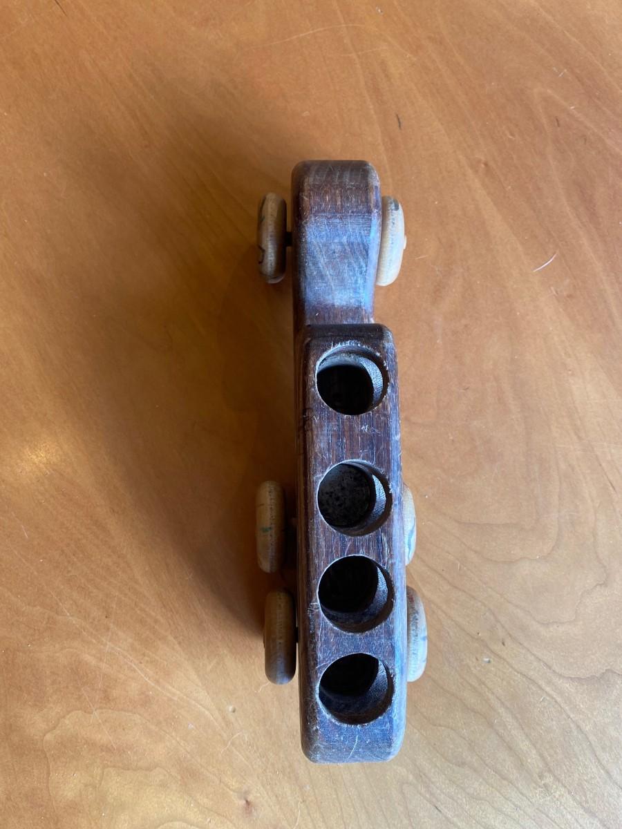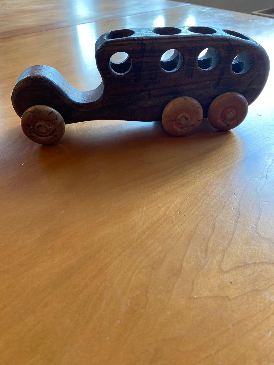 Handmade wooden toy truck or bus. Has 4 seats for peg dolls/figurines to fit into. Peg dolls not included. A durable toy that has endured two rough and tough boys.