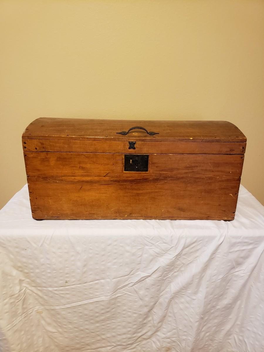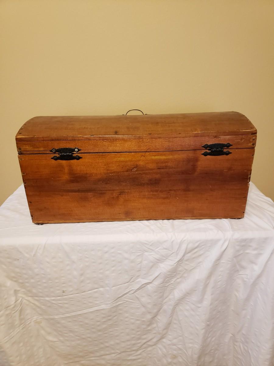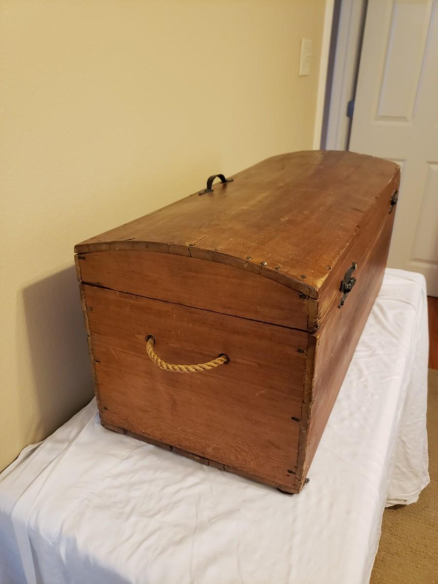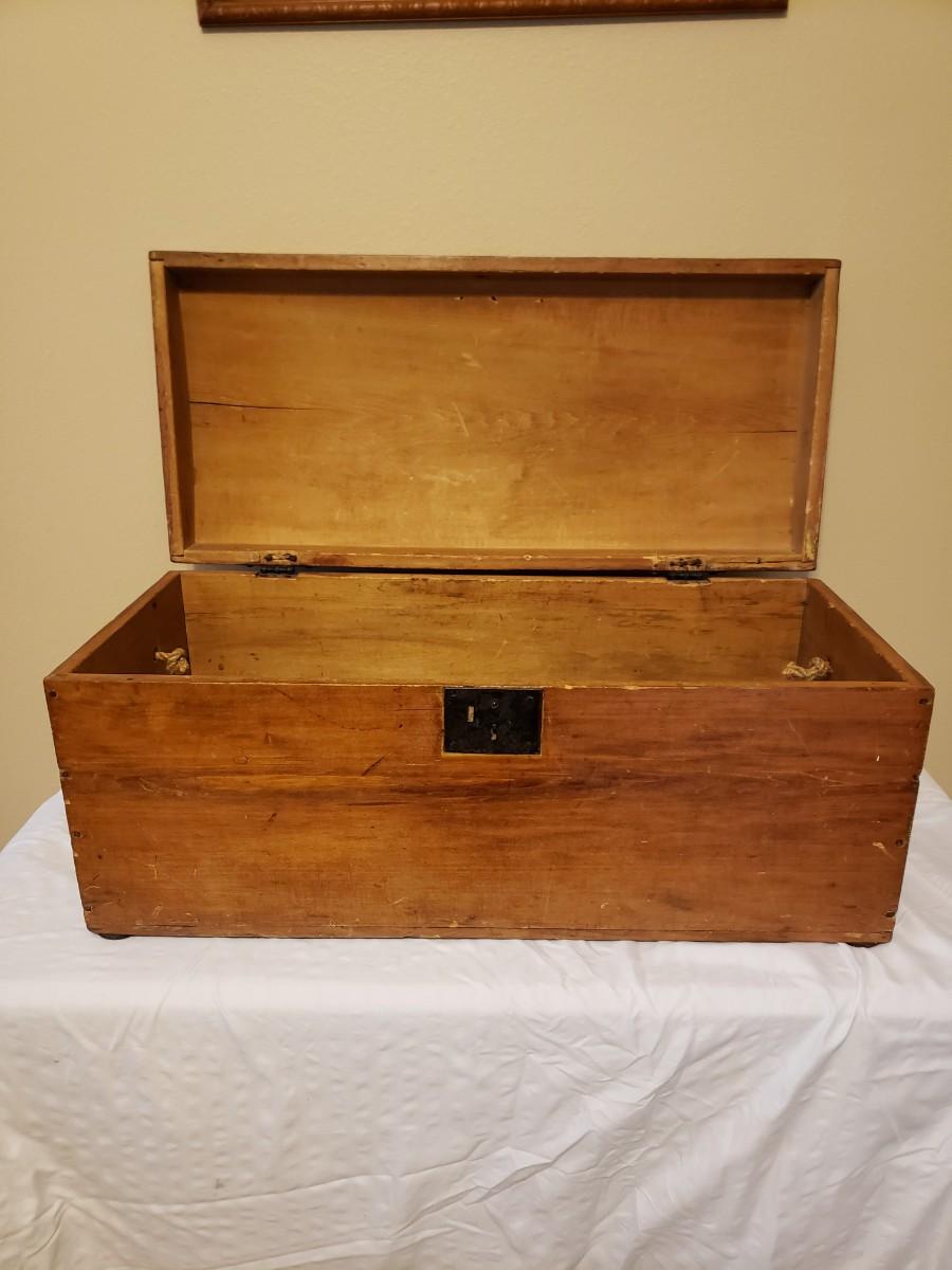 Wooden truck with rope handles. 13"H x 27"W x 12"D. Missing hinge on lock.