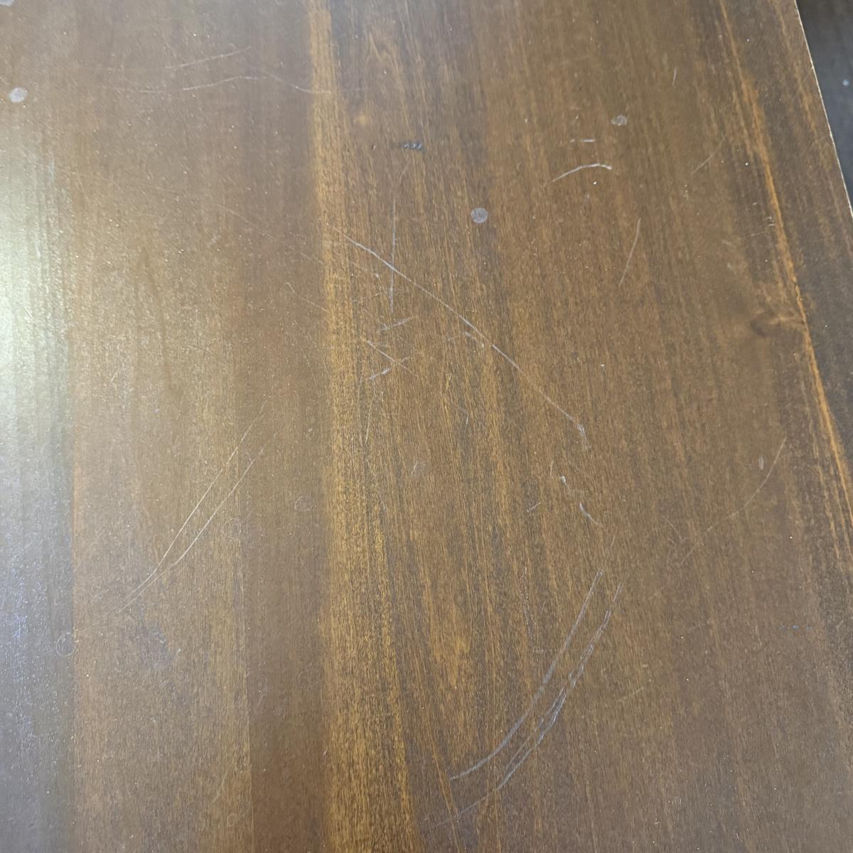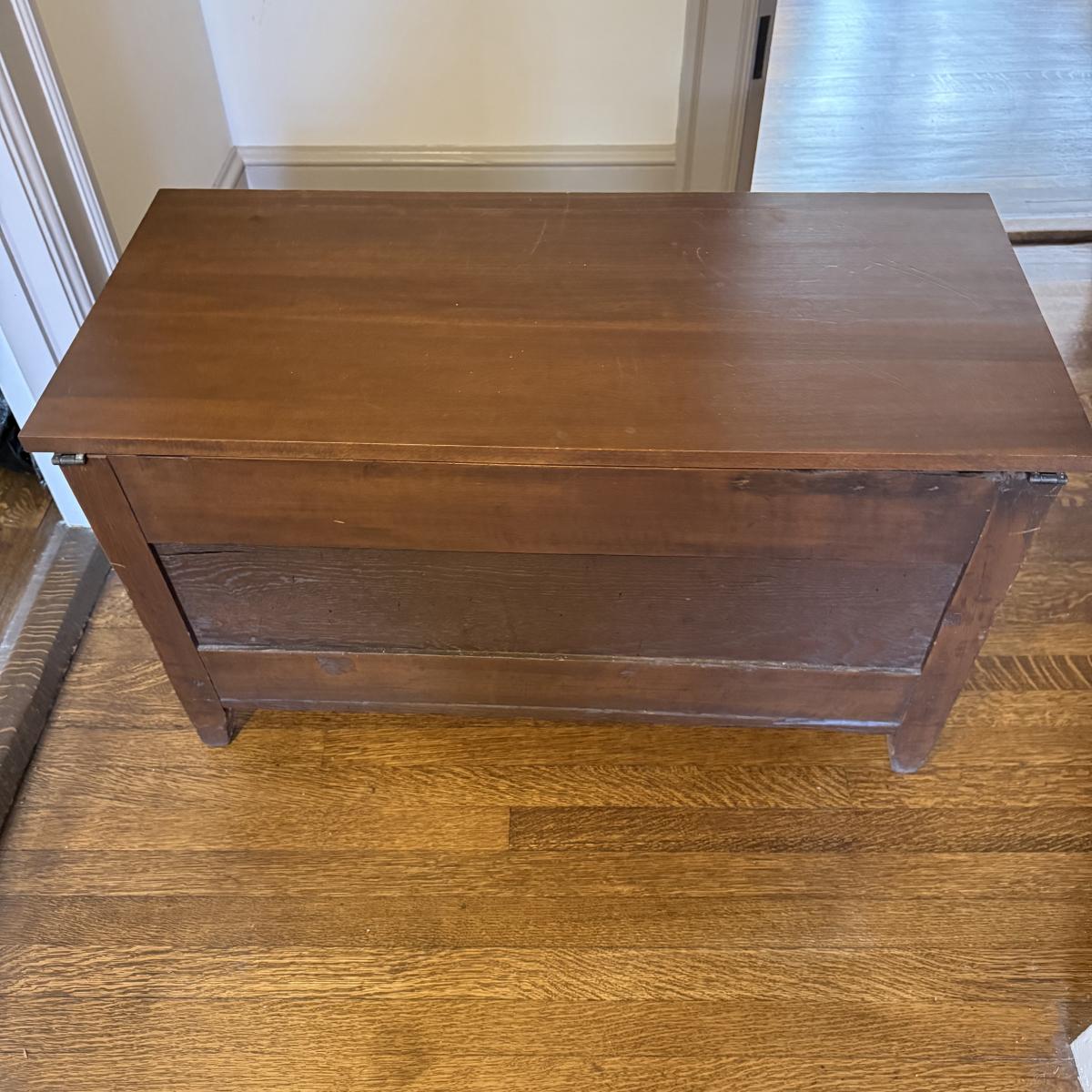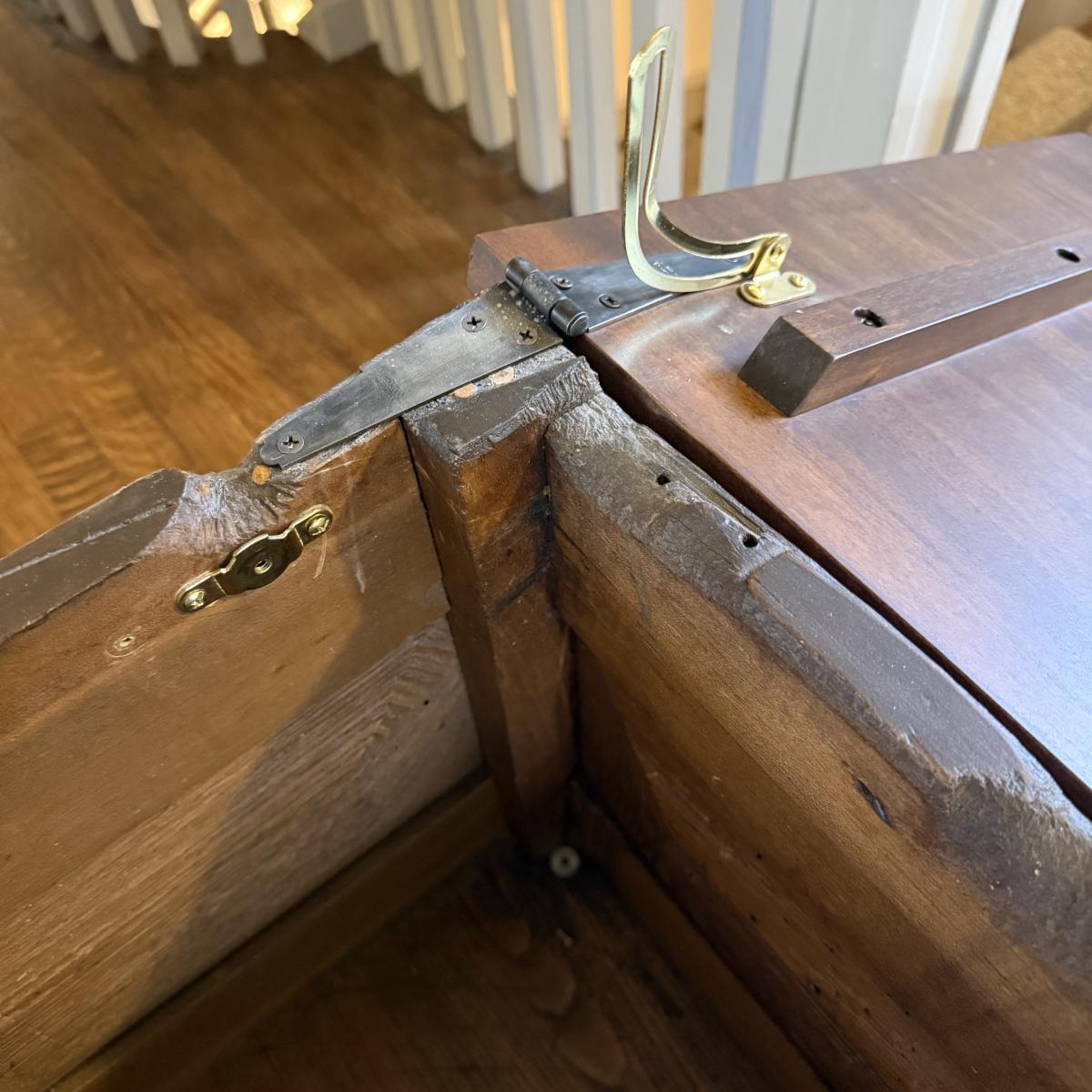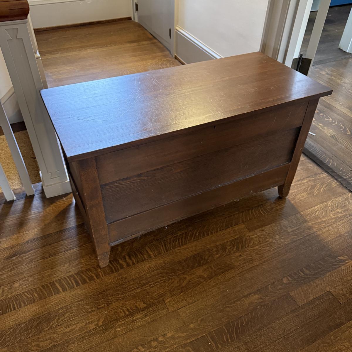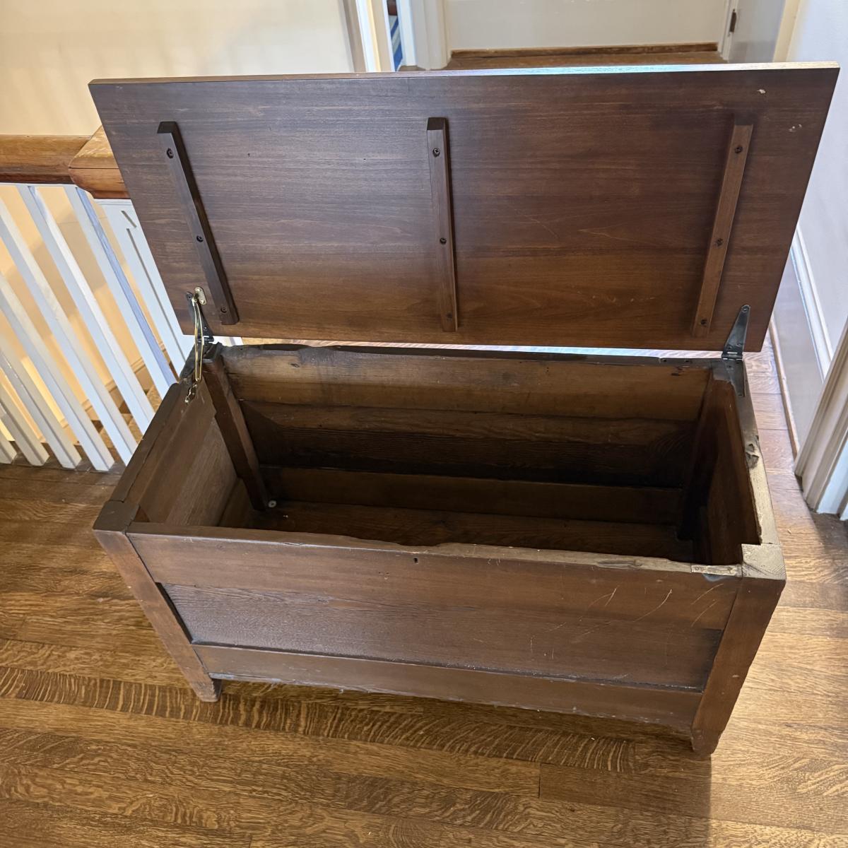 This lot contains a dark wooden trunk. This trunk opens via the lid on hinges. It measures 38” x 17.25” x 22”H. It does appear that at some point someone tried to install a hinge so it would stay open at a 90 degree angle but that has since broken, see pictures for details. There are some minor scuffs/scrapes see pictures for details. Local pick up only. Local pickup only. Winning bidder must bring assistance to help move and load this item due to its weight and/or size.