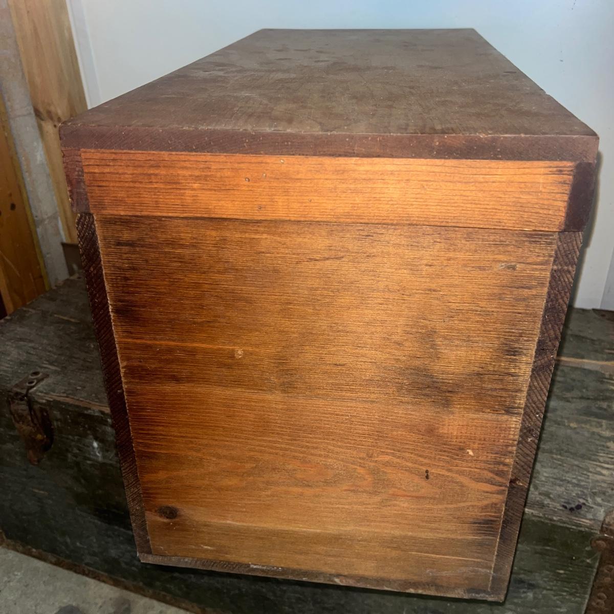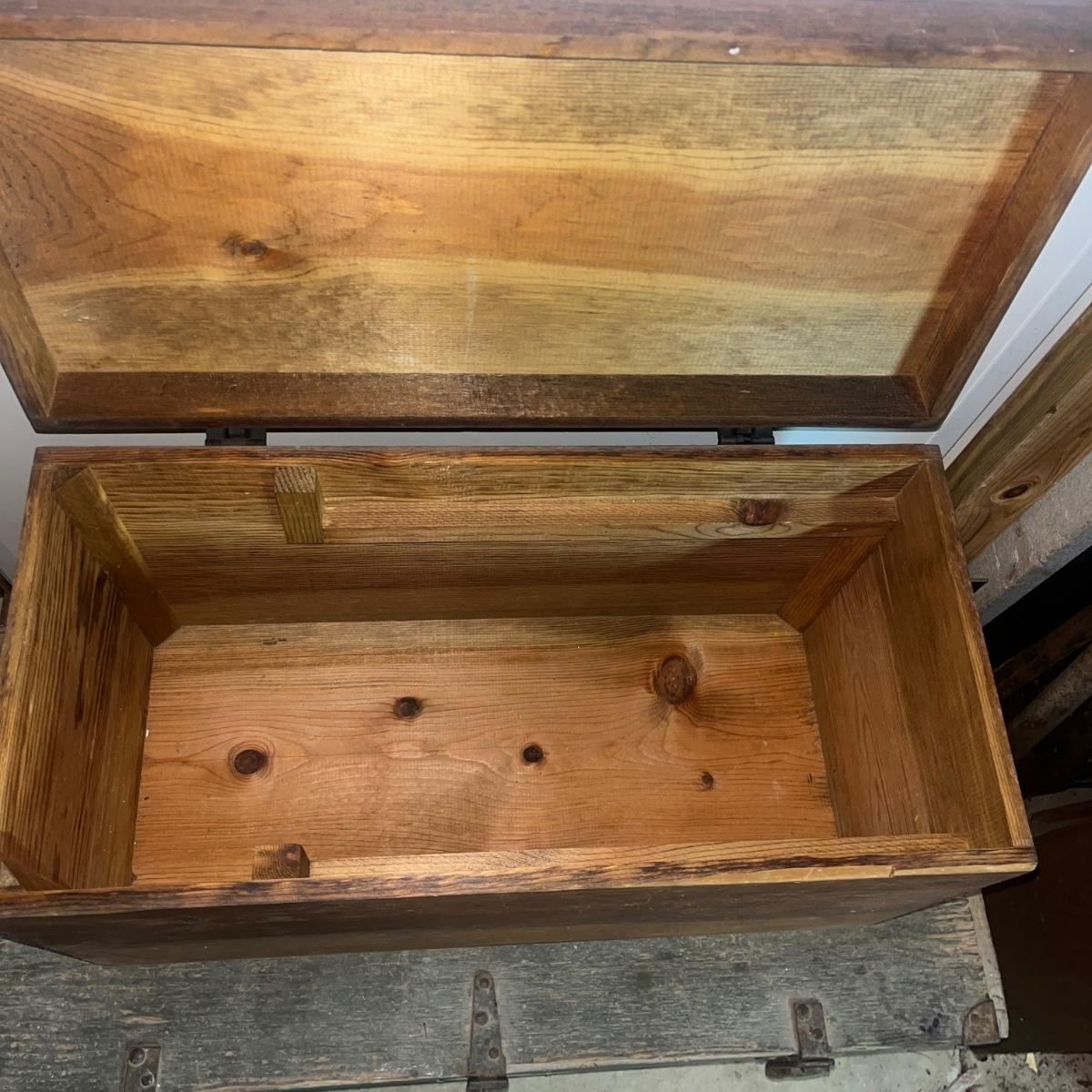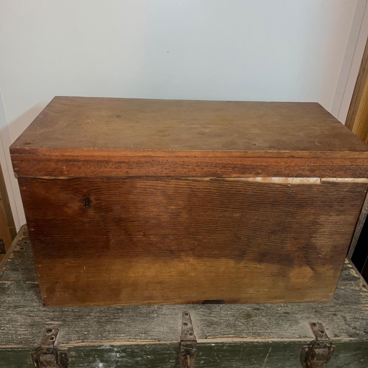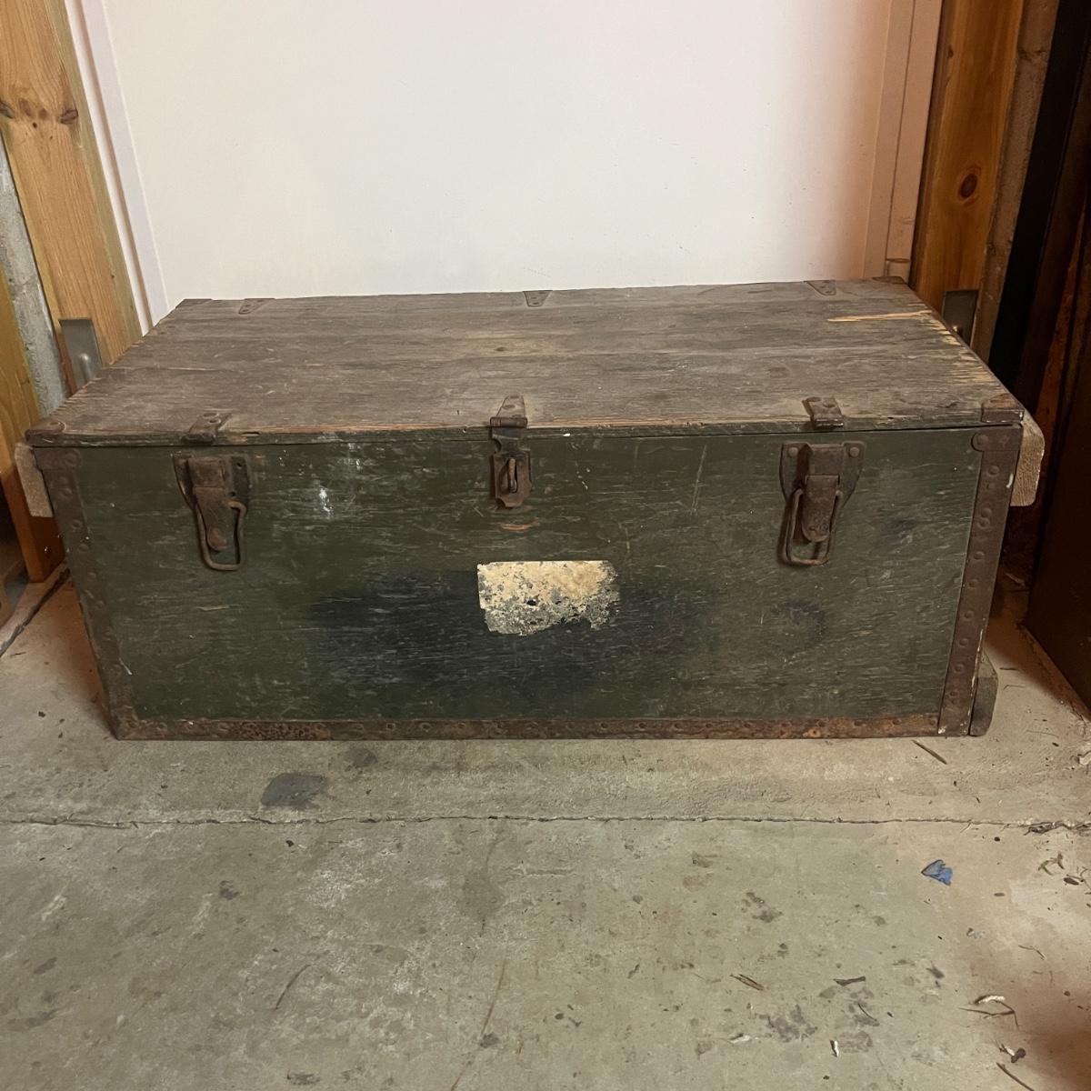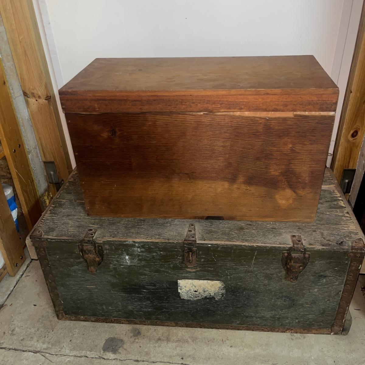 Lot includes a painted wooden trunk and a wooden box. Trunk measures 33” x 16” x 13”H.