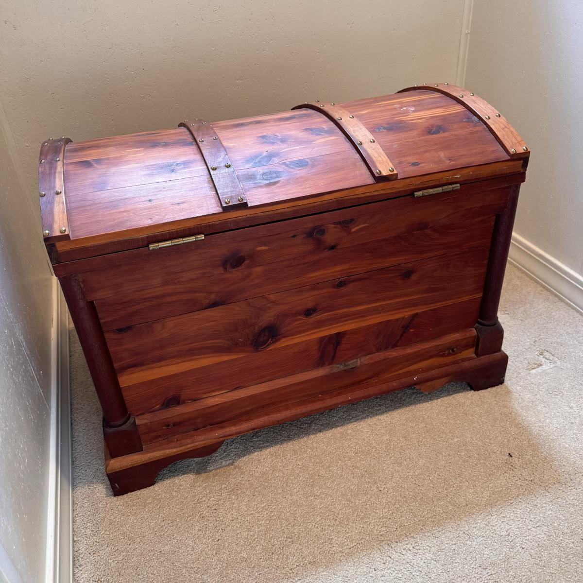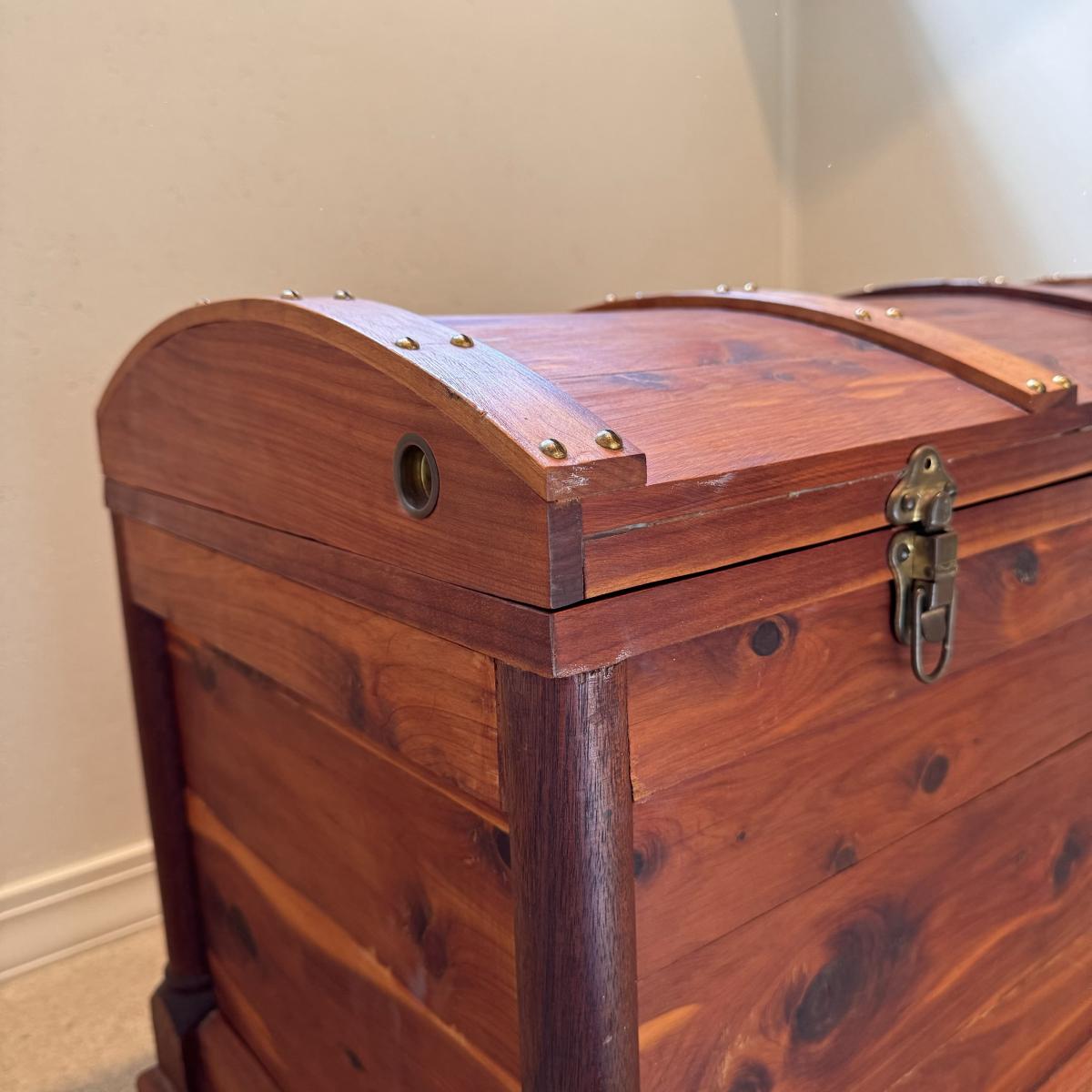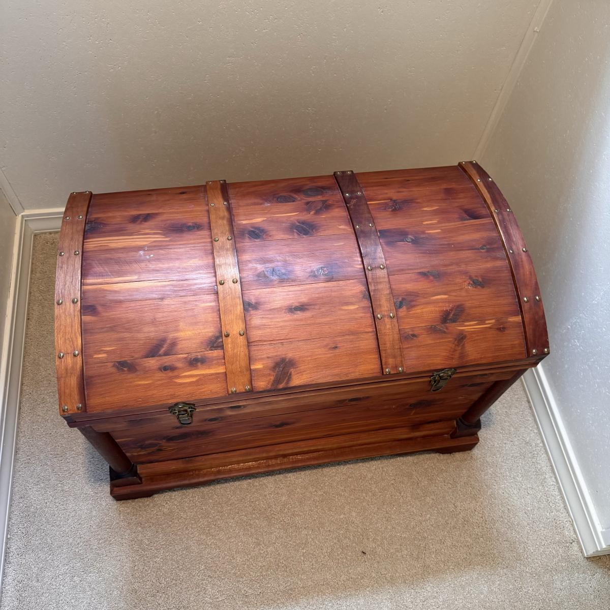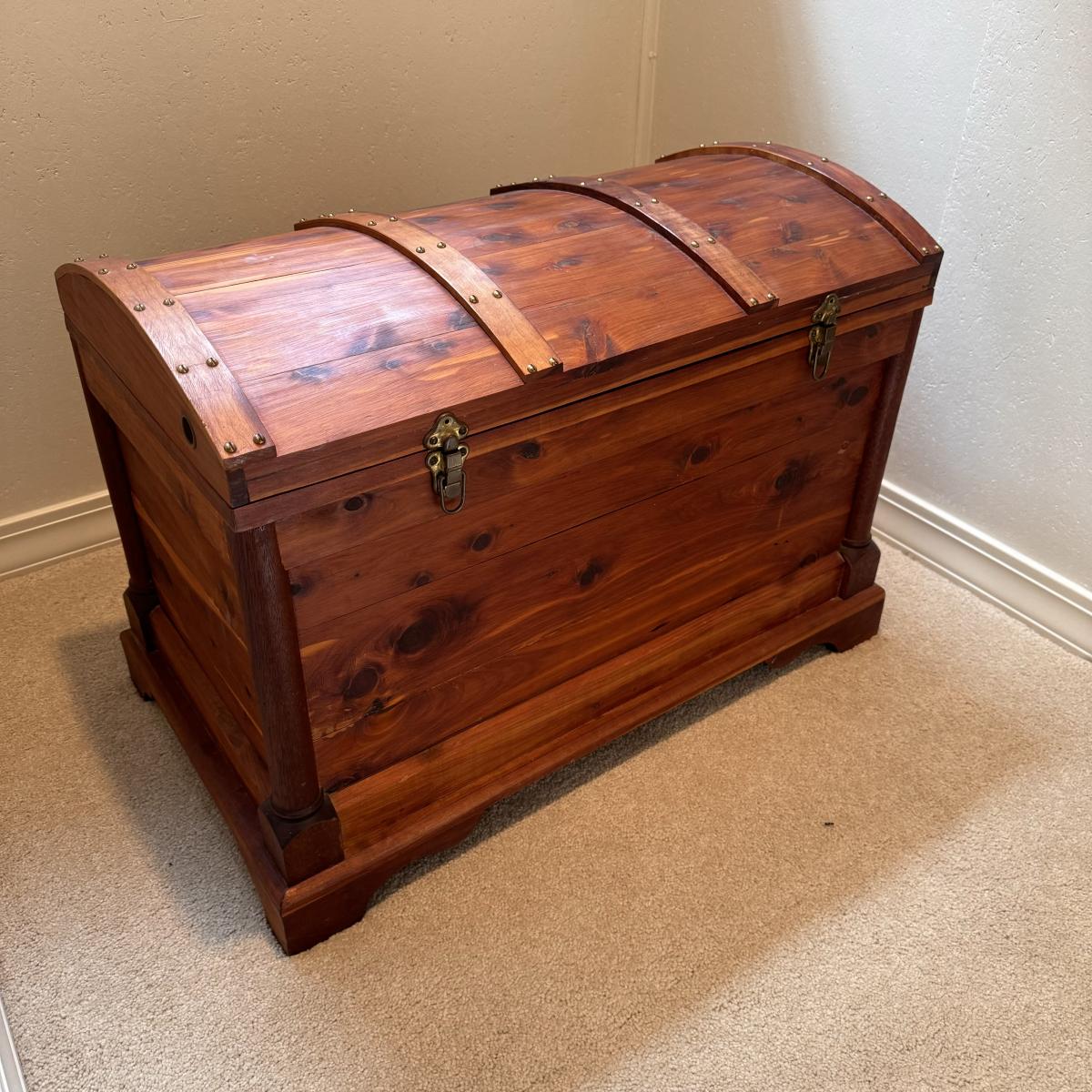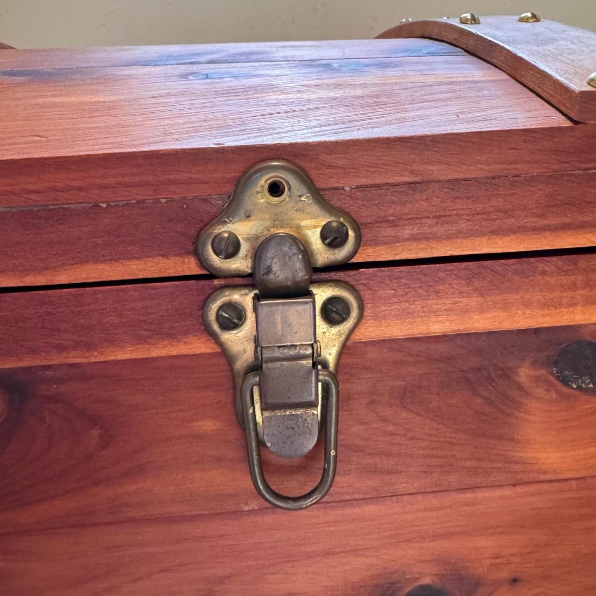This lot includes one beautiful wooden trunk with a domed top. The trunk is all wood with brass features. It latches in two places on the front. There is one white paint stain on the top of the trunk - see picture included. It measures 29” x 17” x 21.5”H. Local pickup only.