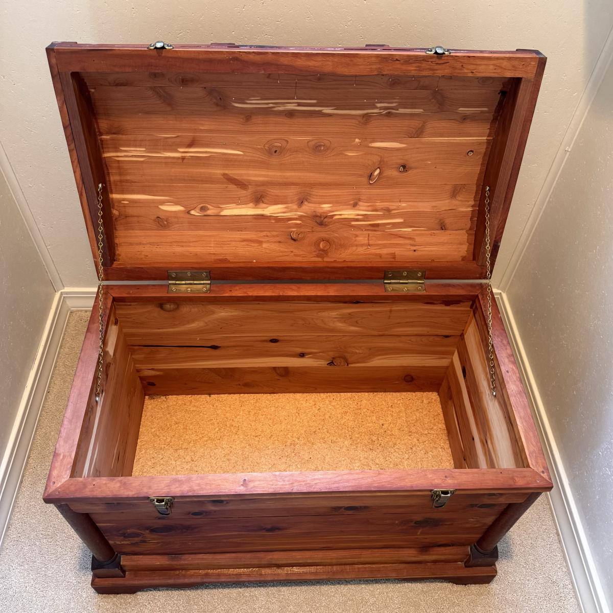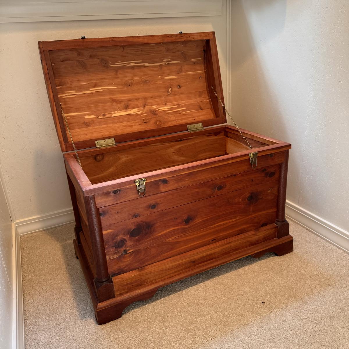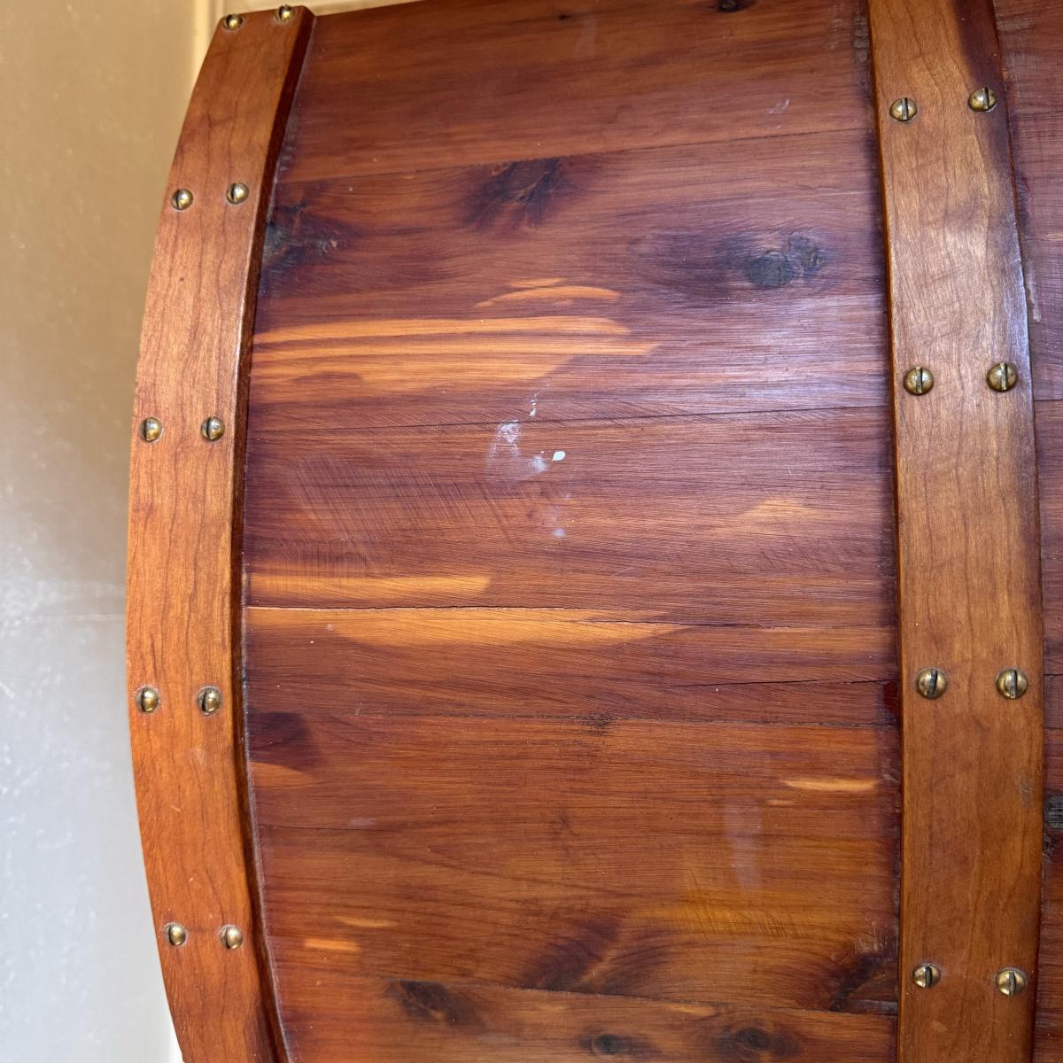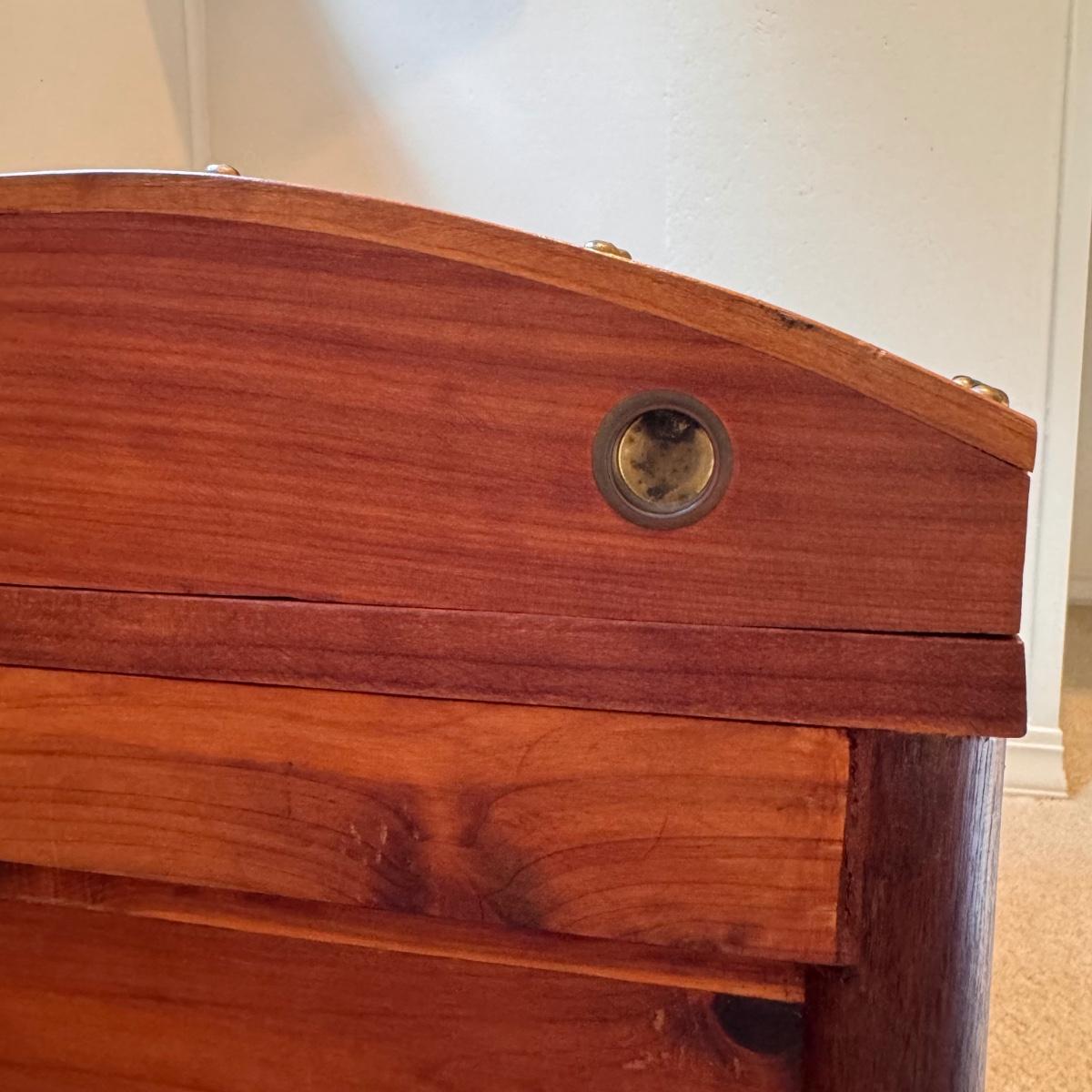 This lot includes one beautiful wooden trunk with a domed top. The trunk is all wood with brass features. It latches in two places on the front. There is one white paint stain on the top of the trunk - see picture included. It measures 29” x 17” x 21.5”H. Local pickup only.
