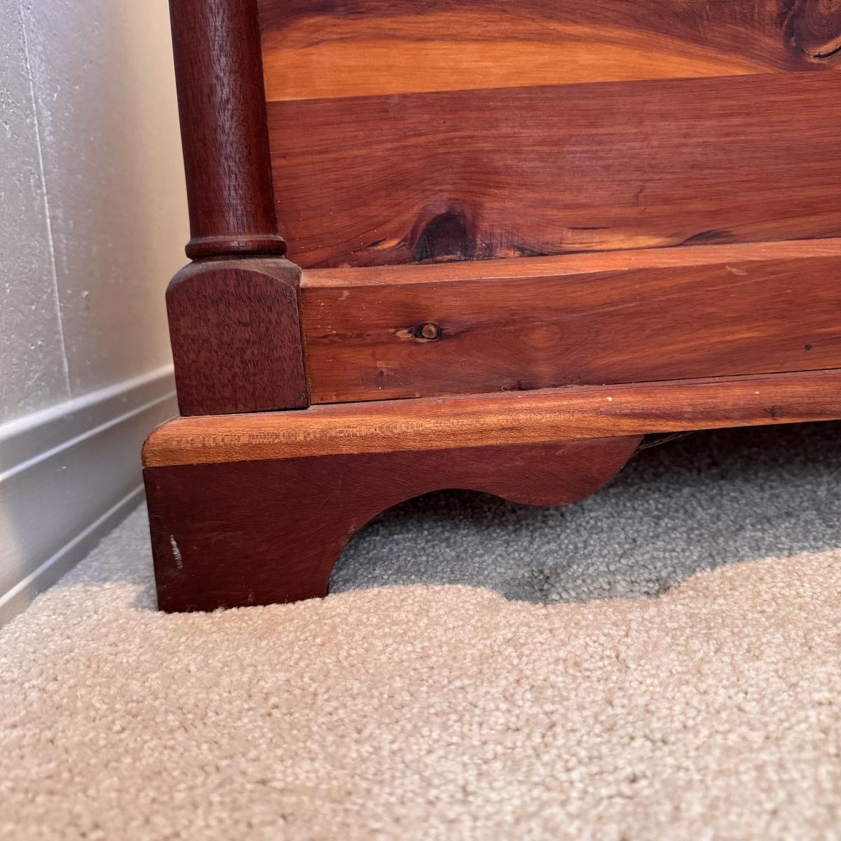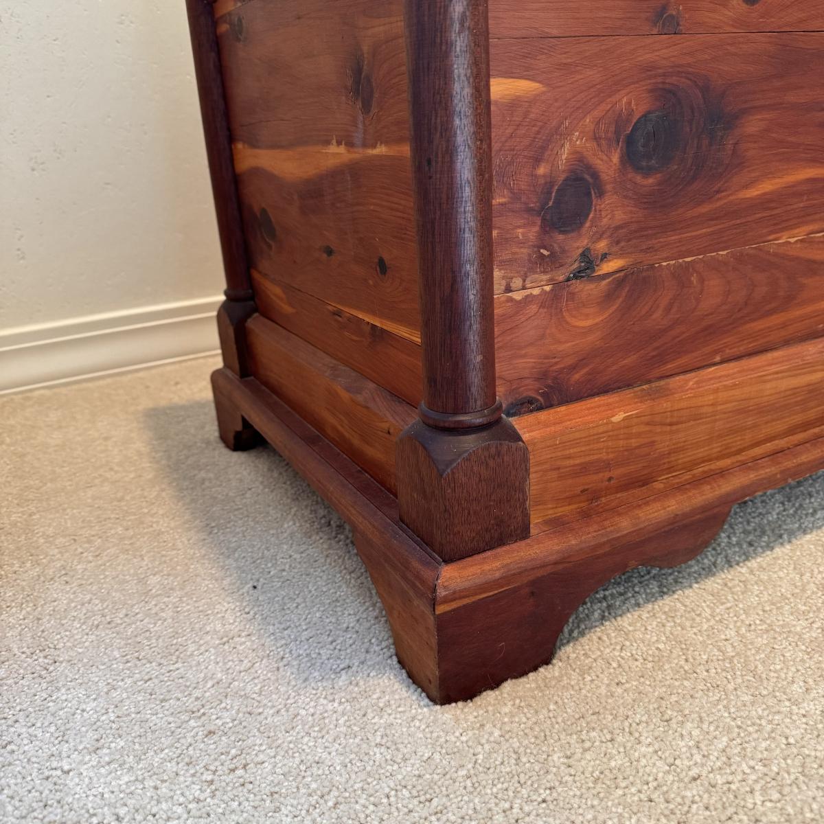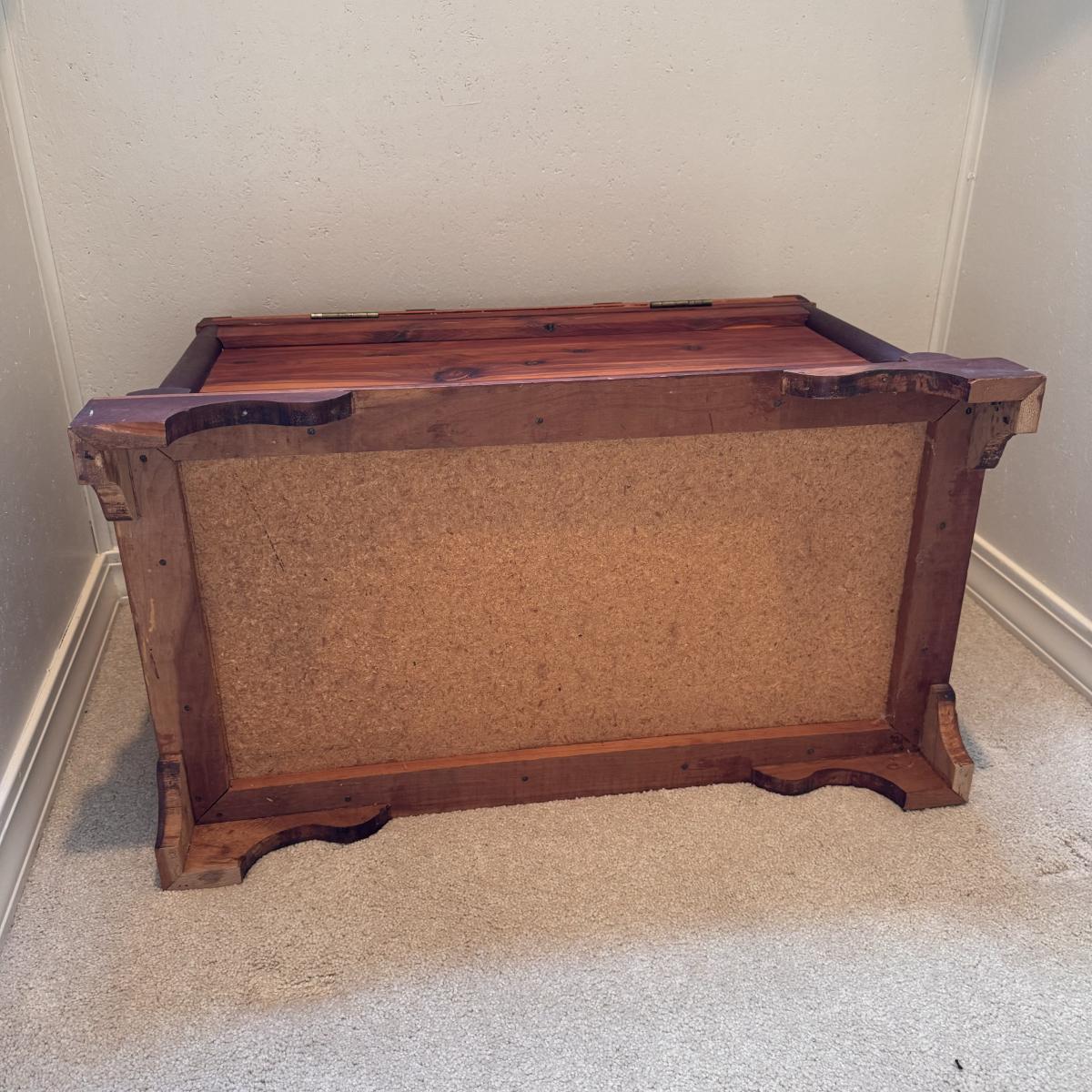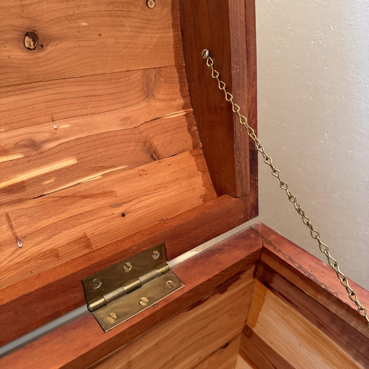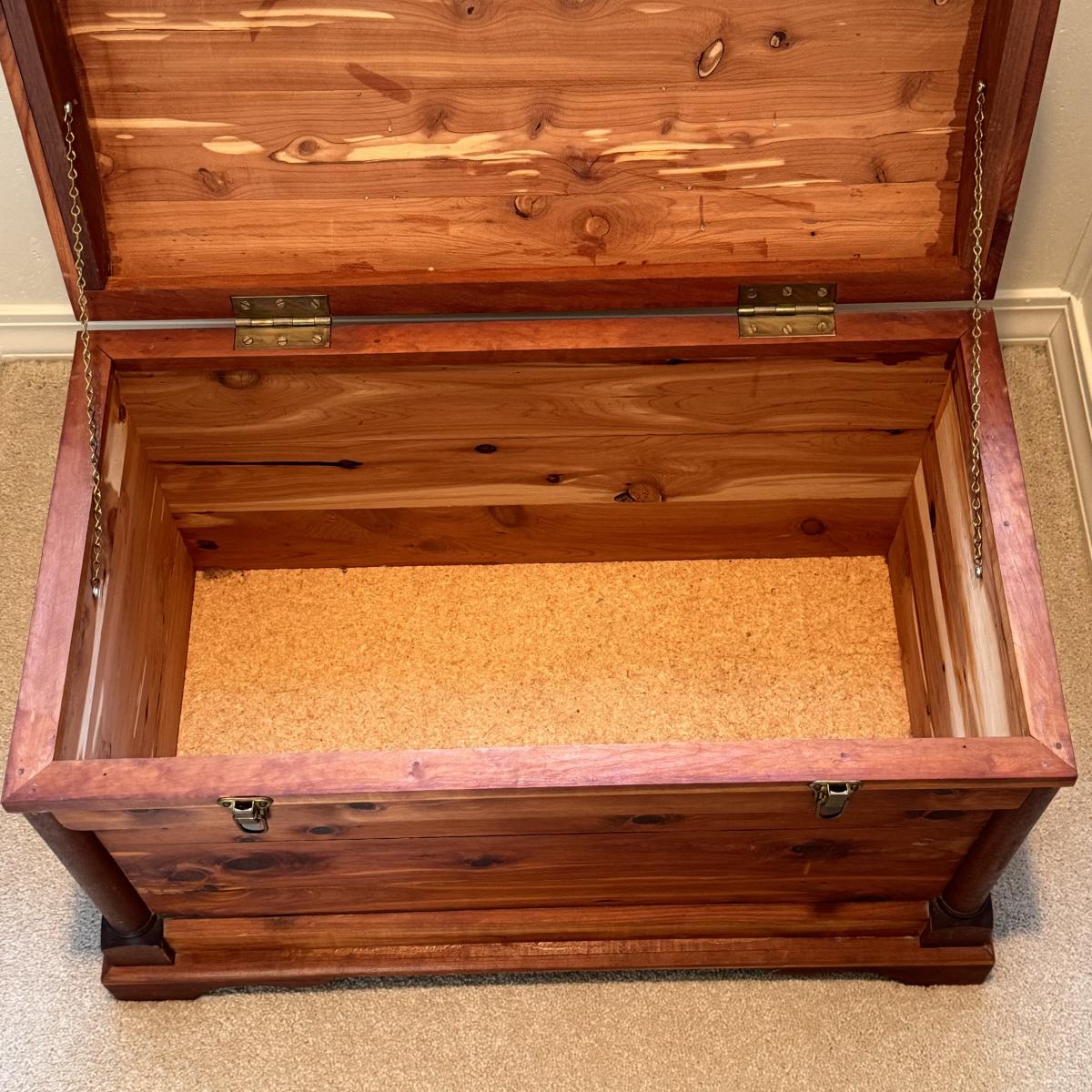 This lot includes one beautiful wooden trunk with a domed top. The trunk is all wood with brass features. It latches in two places on the front. There is one white paint stain on the top of the trunk - see picture included. It measures 29” x 17” x 21.5”H. Local pickup only.