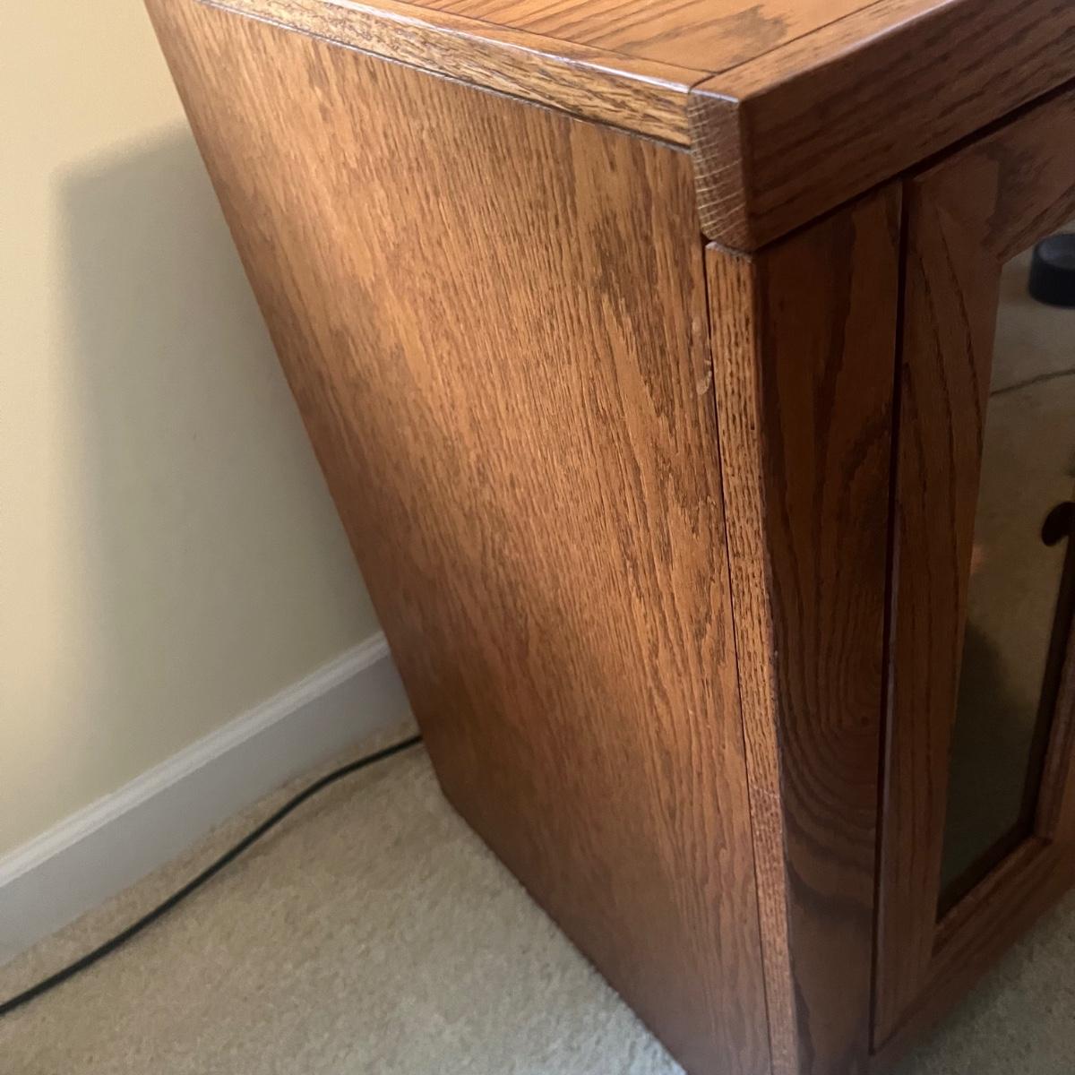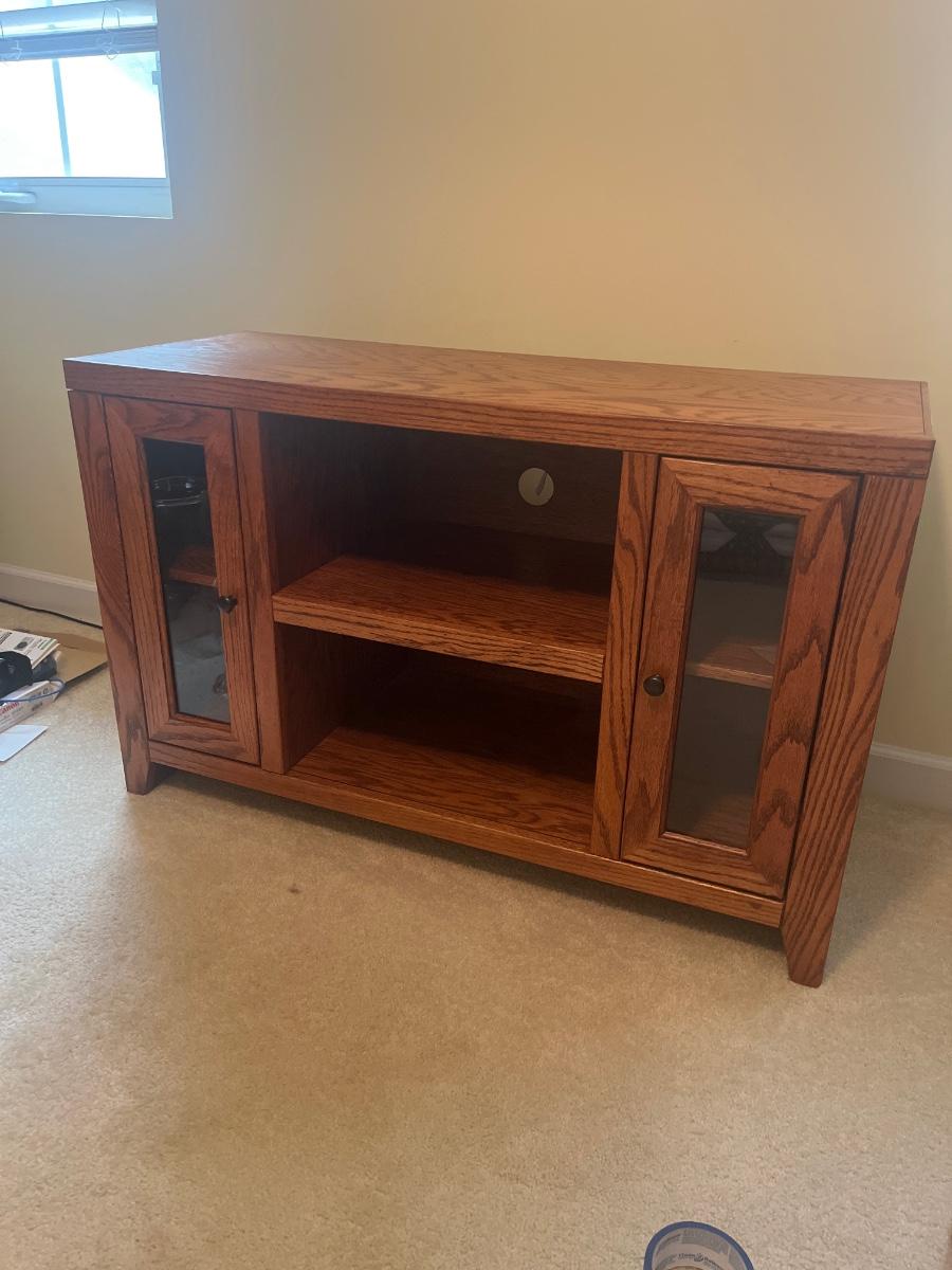 Lot includes a solid wood TV stand that appears to be oak. It has two side cabinets with glass fronts and open shelving in the center. Cabinet measures 42” x 16.5” x 26.5”H. Local Pickup Only. Stand is up one flight of stairs. Winning bidder must bring assistance to help move and load this item due to its weight and/or size.