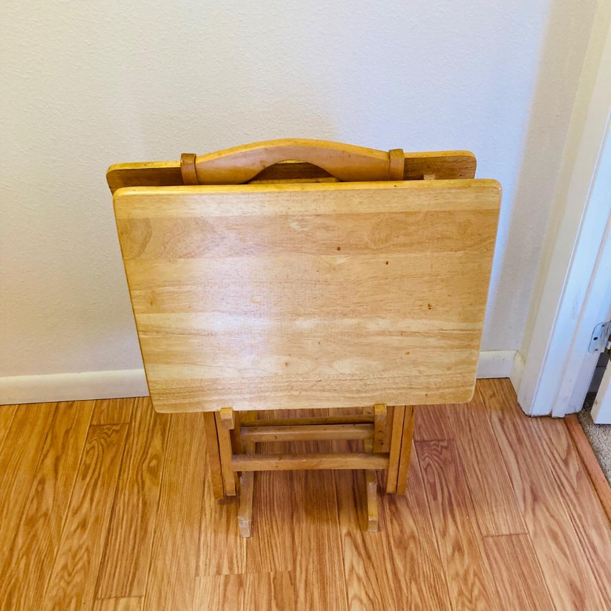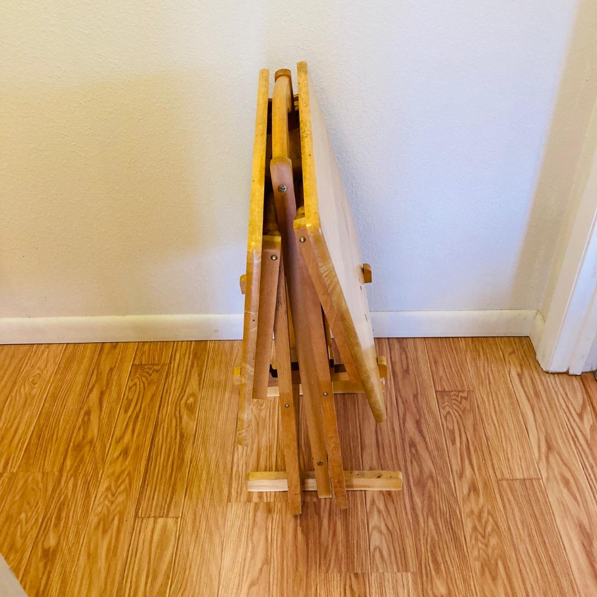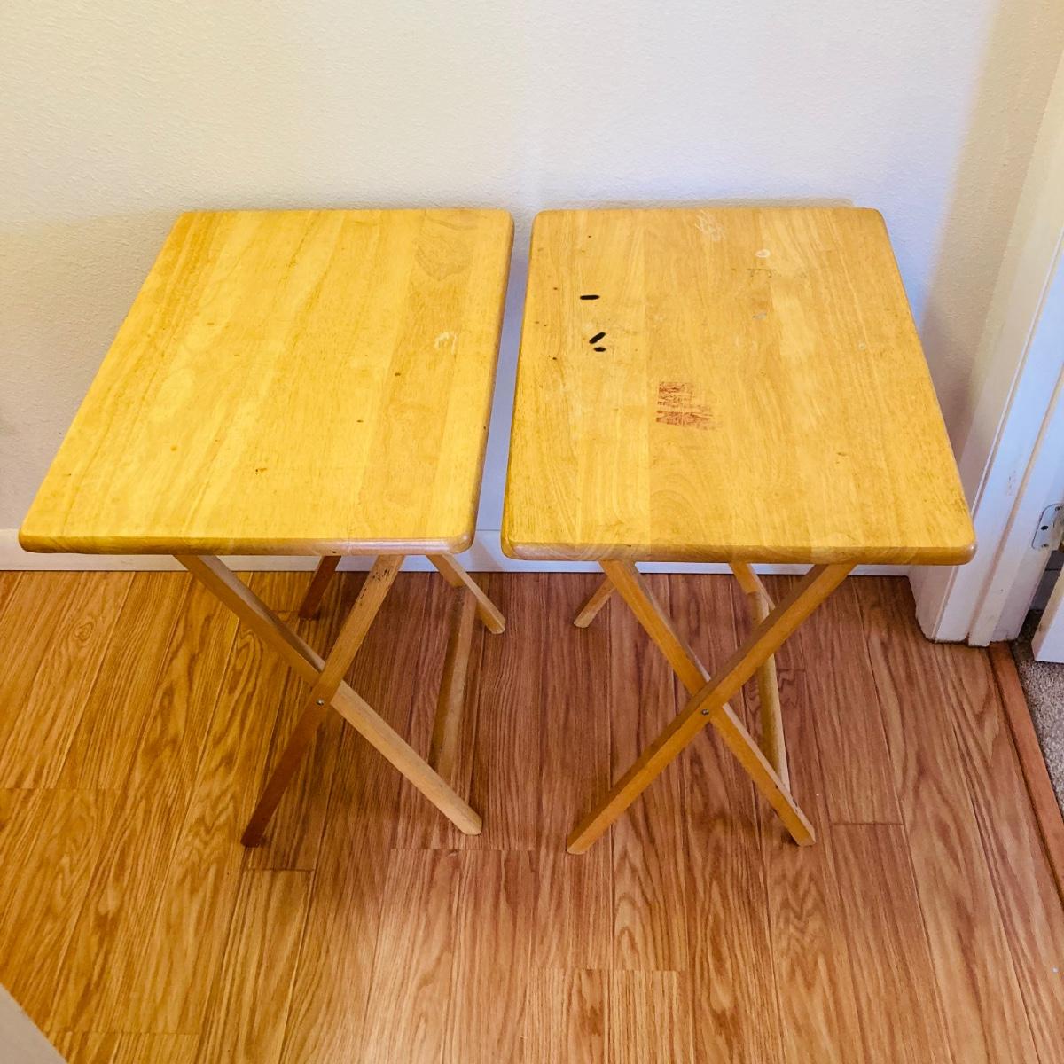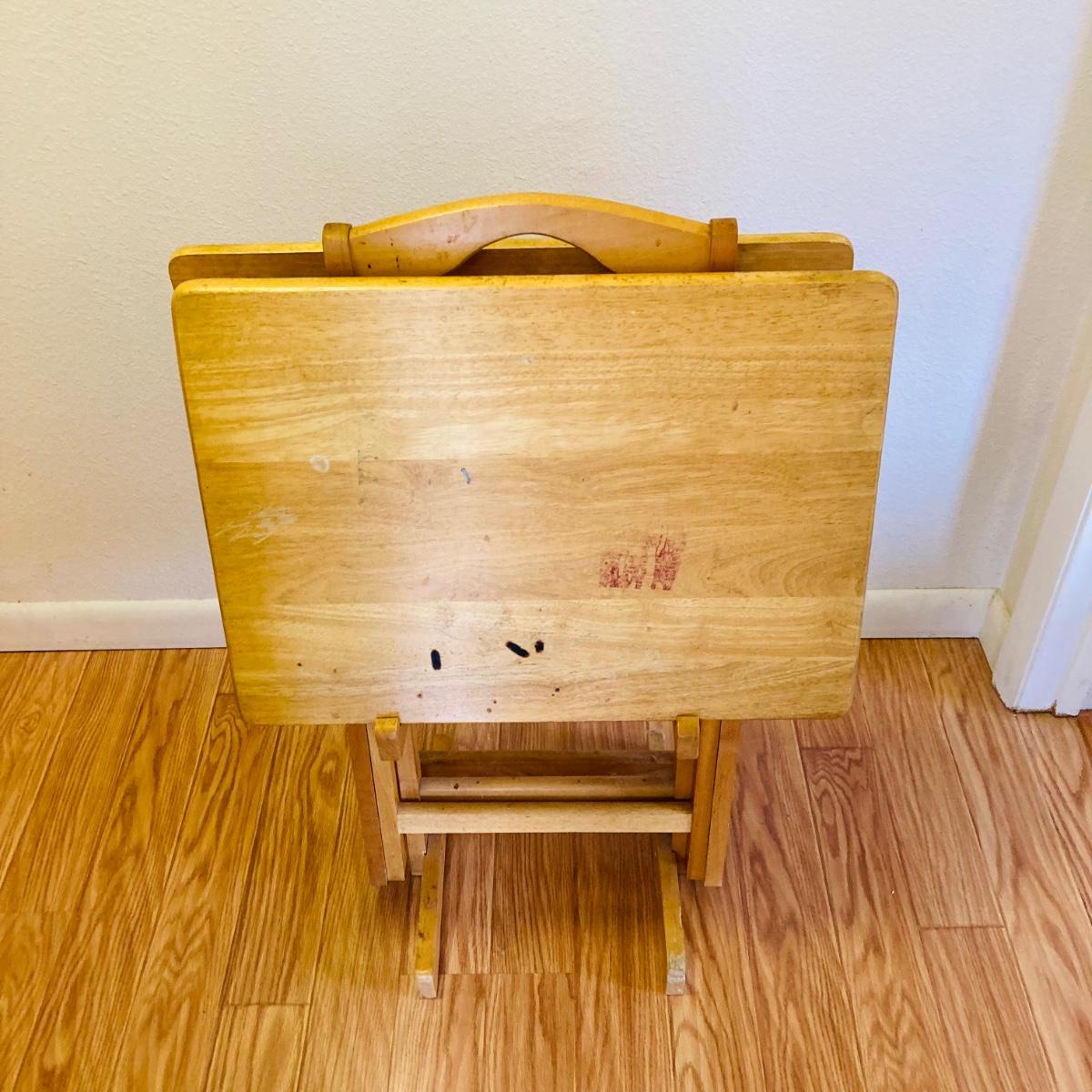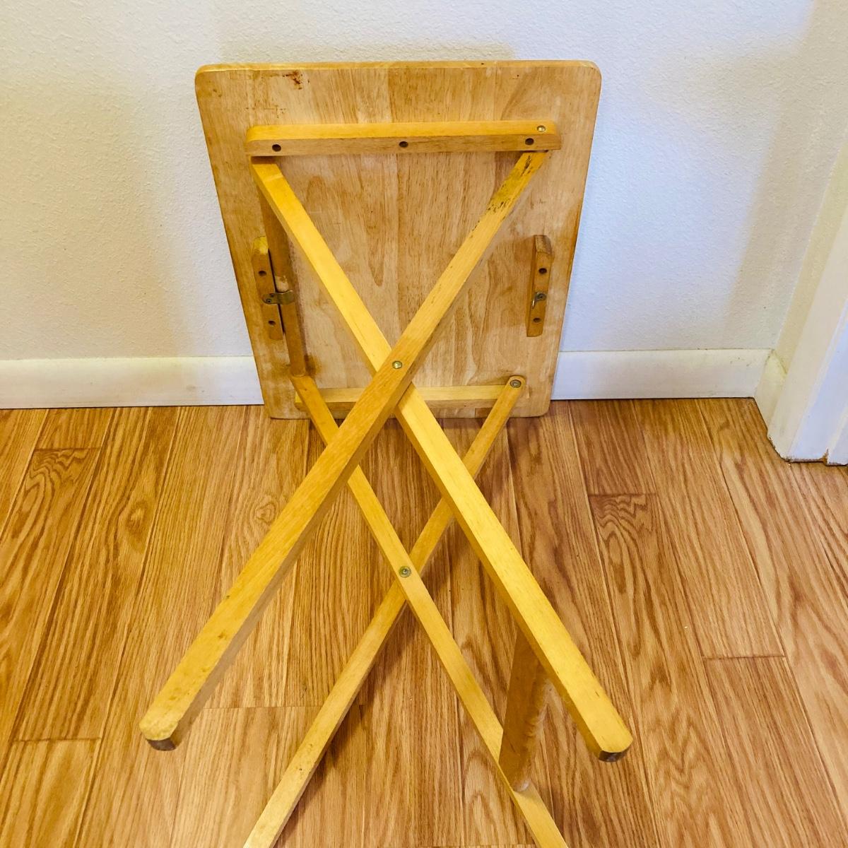 Blonde wooden TV trays. Set of two with matching stand. These measure 22”L x 16”W x 26”H. One stand in good shape and the other has a few stains as shown in photo.