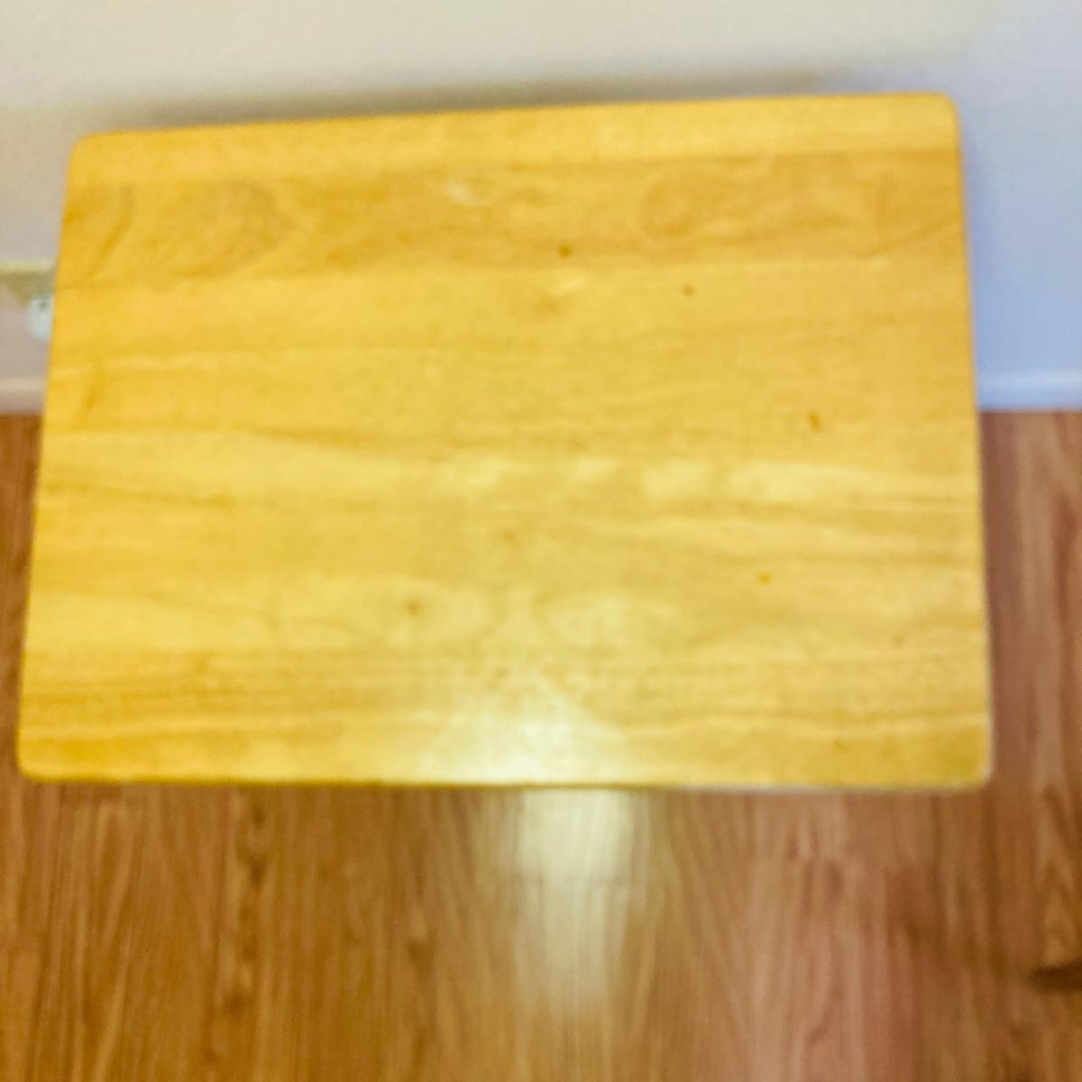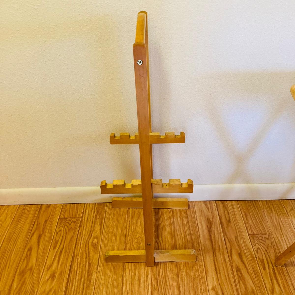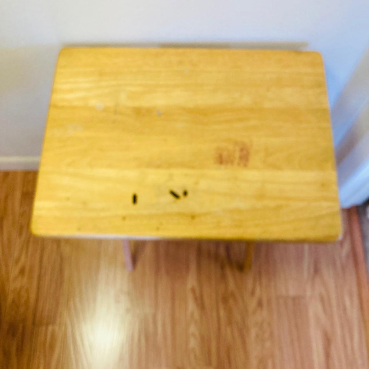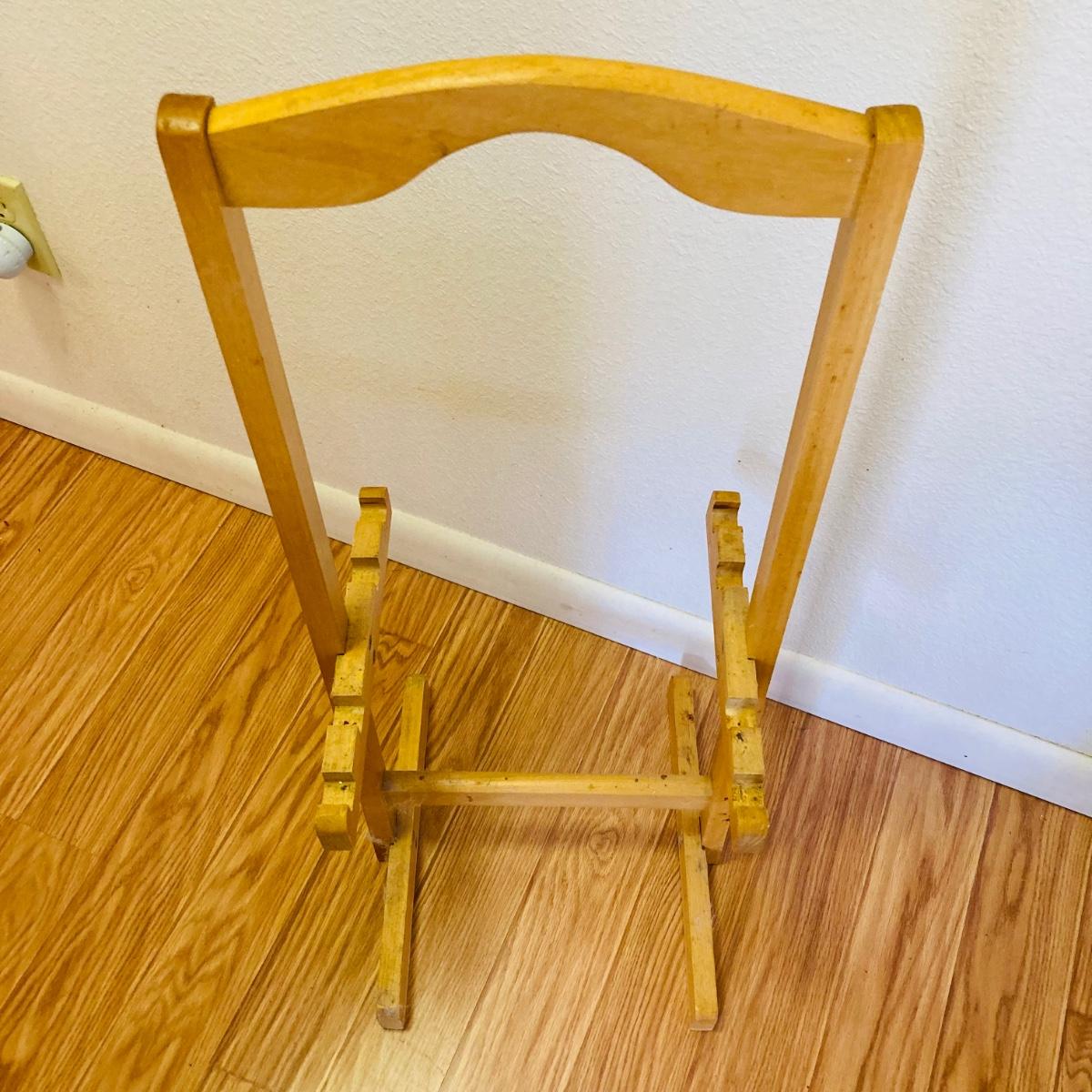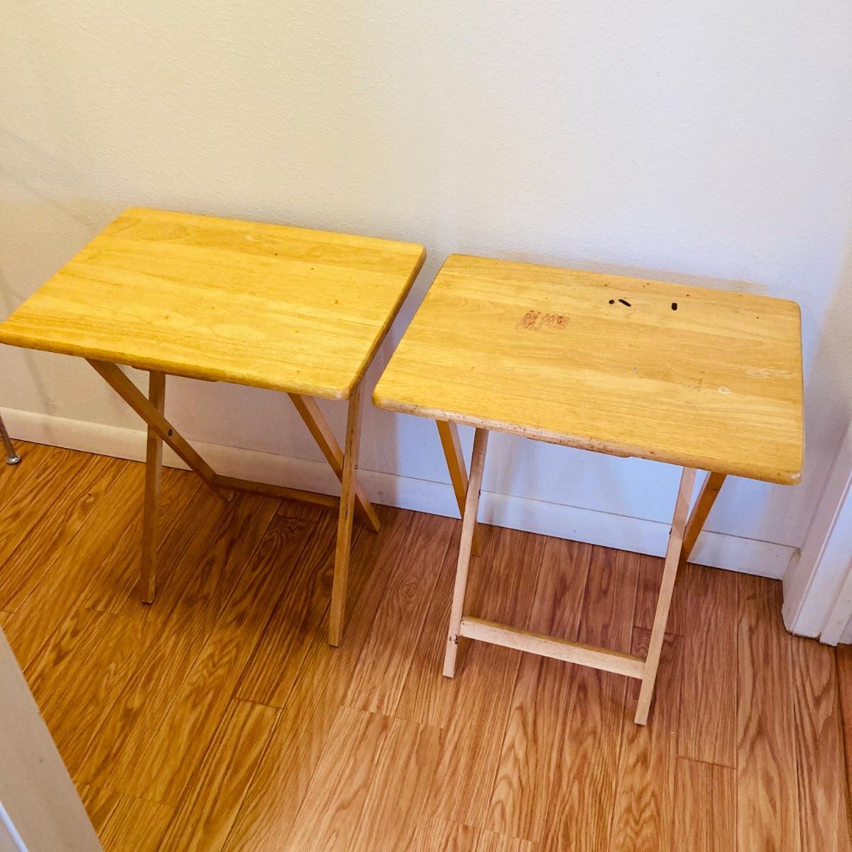 Blonde wooden TV trays. Set of two with matching stand. These measure 22”L x 16”W x 26”H. One stand in good shape and the other has a few stains as shown in photo.
