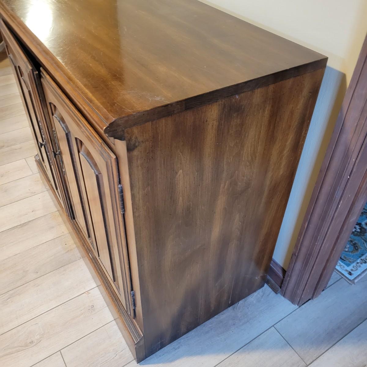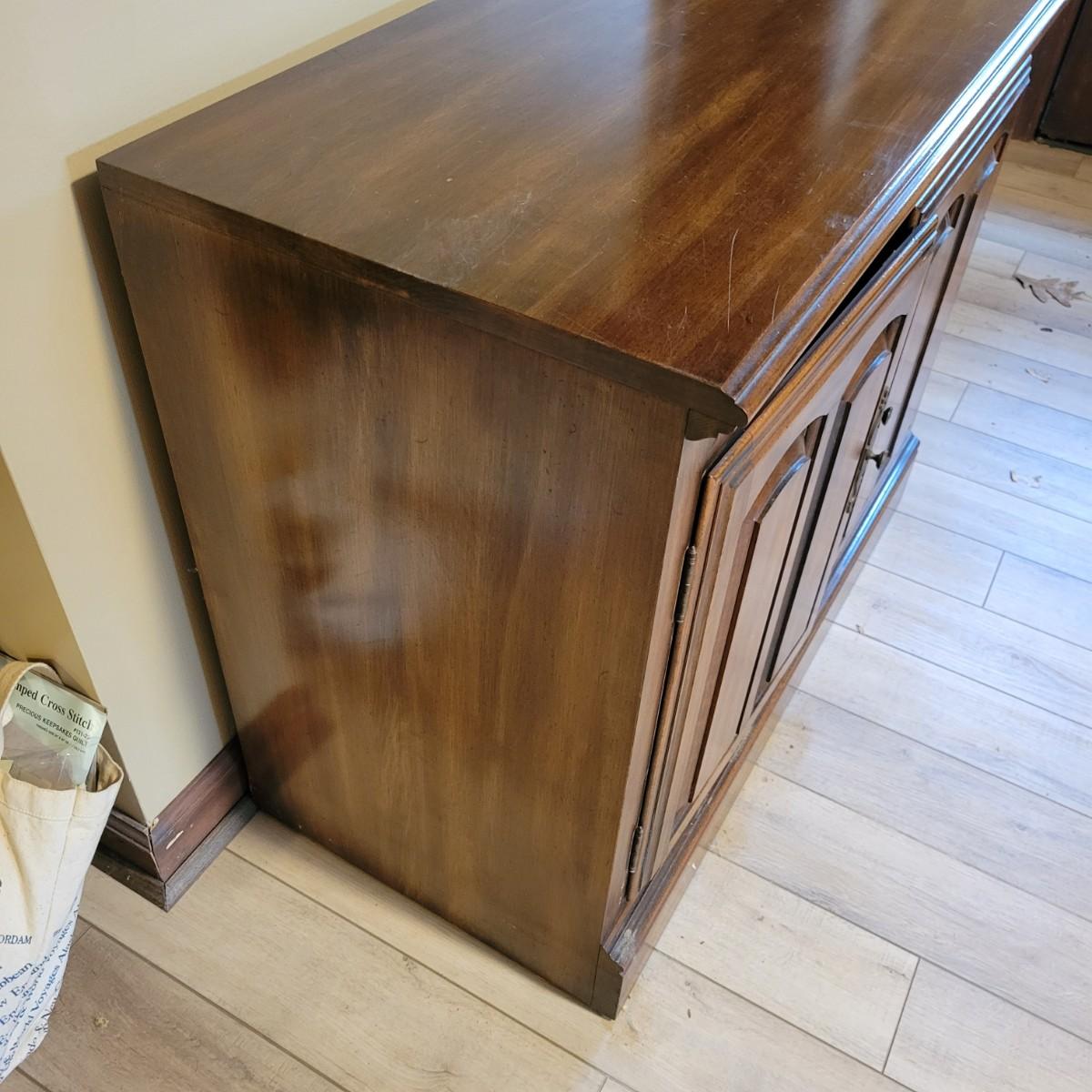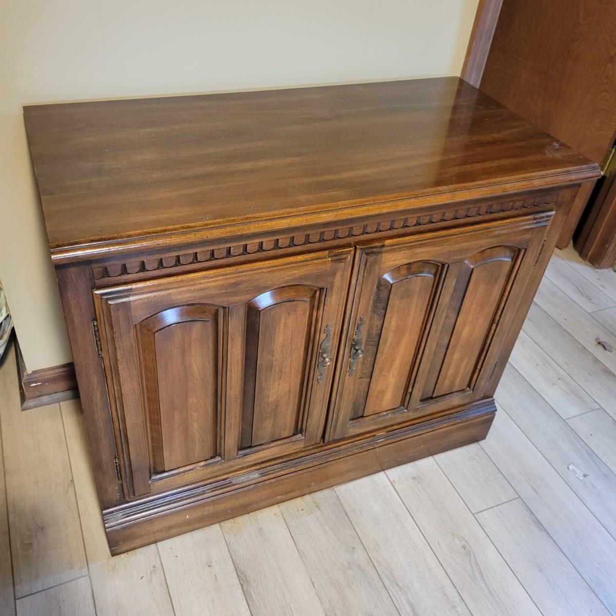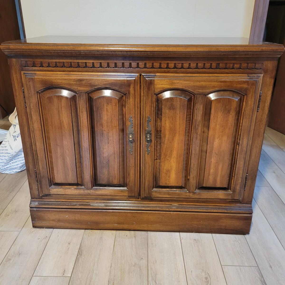 A wooden two door cabinet that measures approximately 34" x 17" x 28.5"H. There are some minor scratches and blemishes on its top. Local pickup only