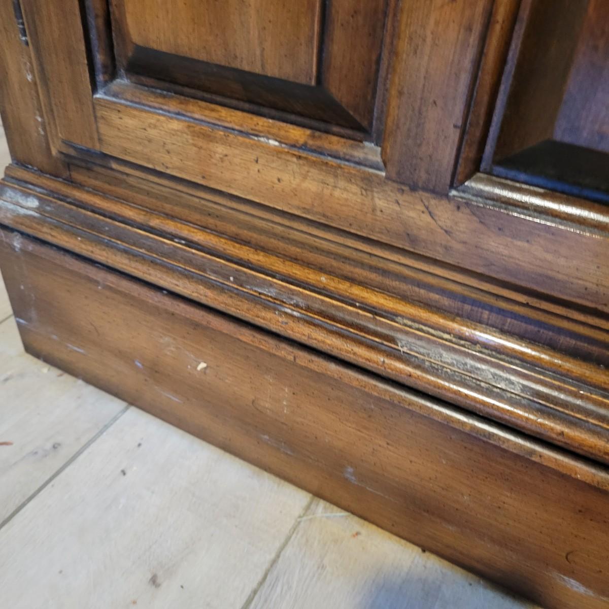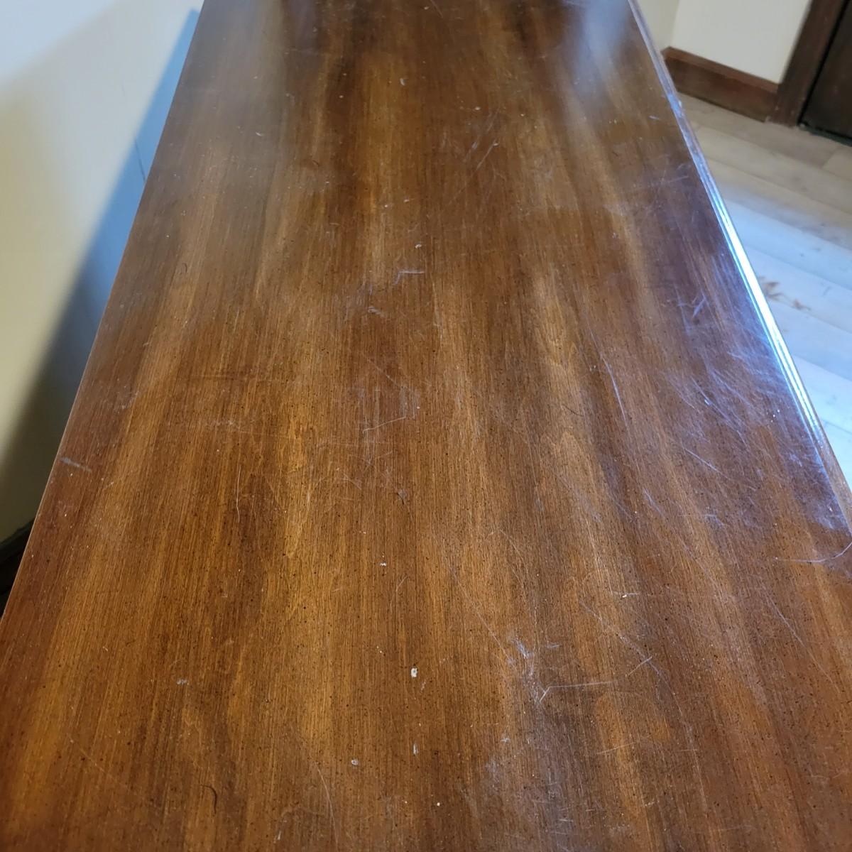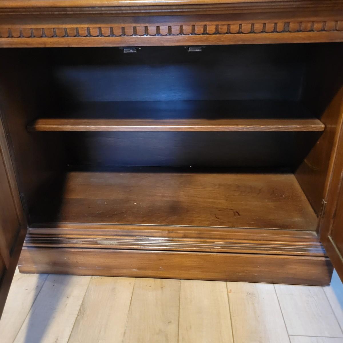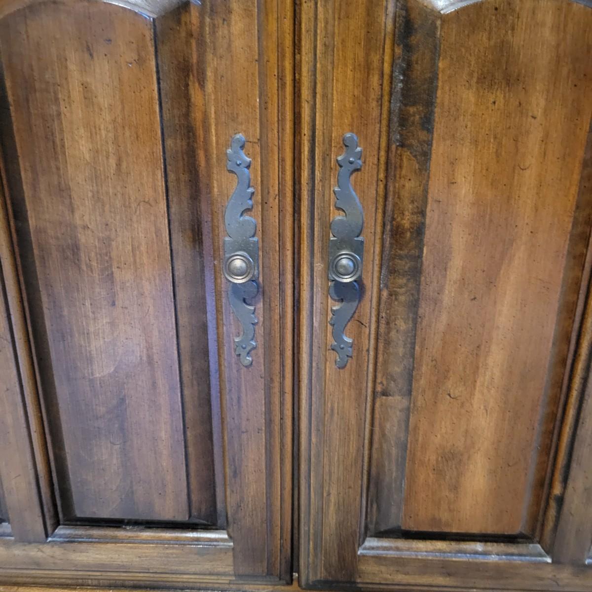 A wooden two door cabinet that measures approximately 34" x 17" x 28.5"H. There are some minor scratches and blemishes on its top. Local pickup only