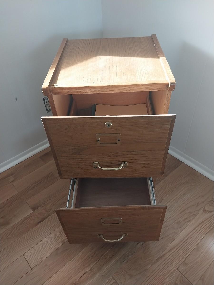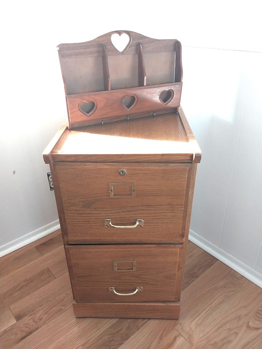 WOODEN TWO DRAWER FILING CABINET AND HANGING LETTER HOLDER