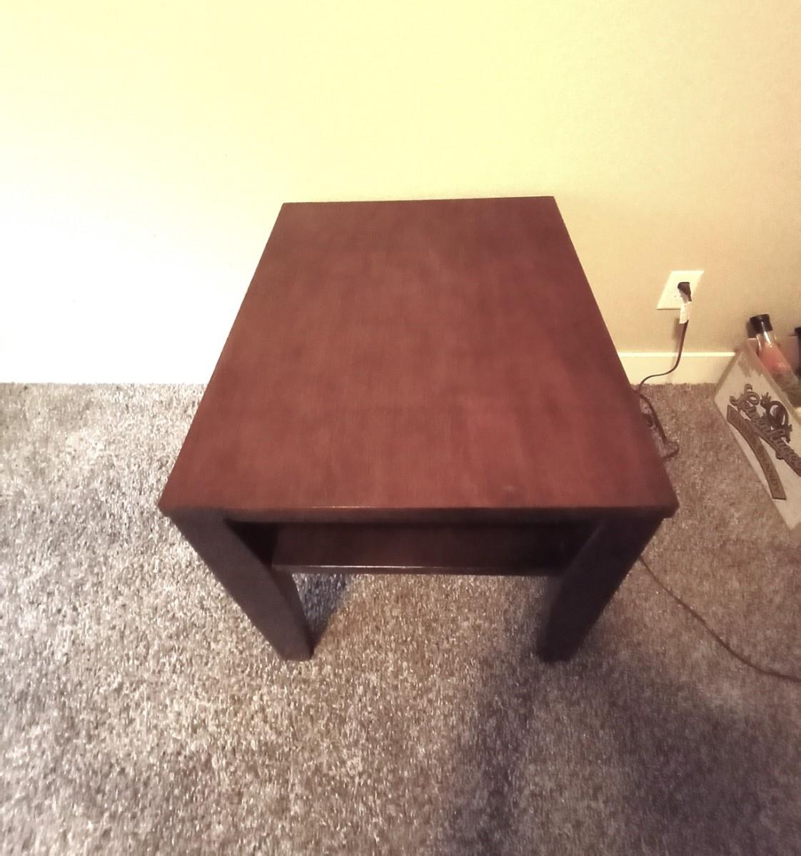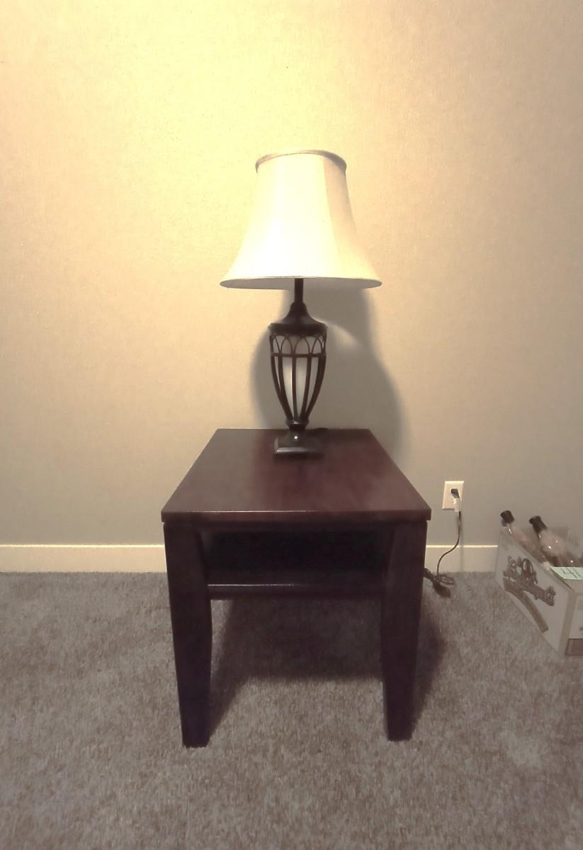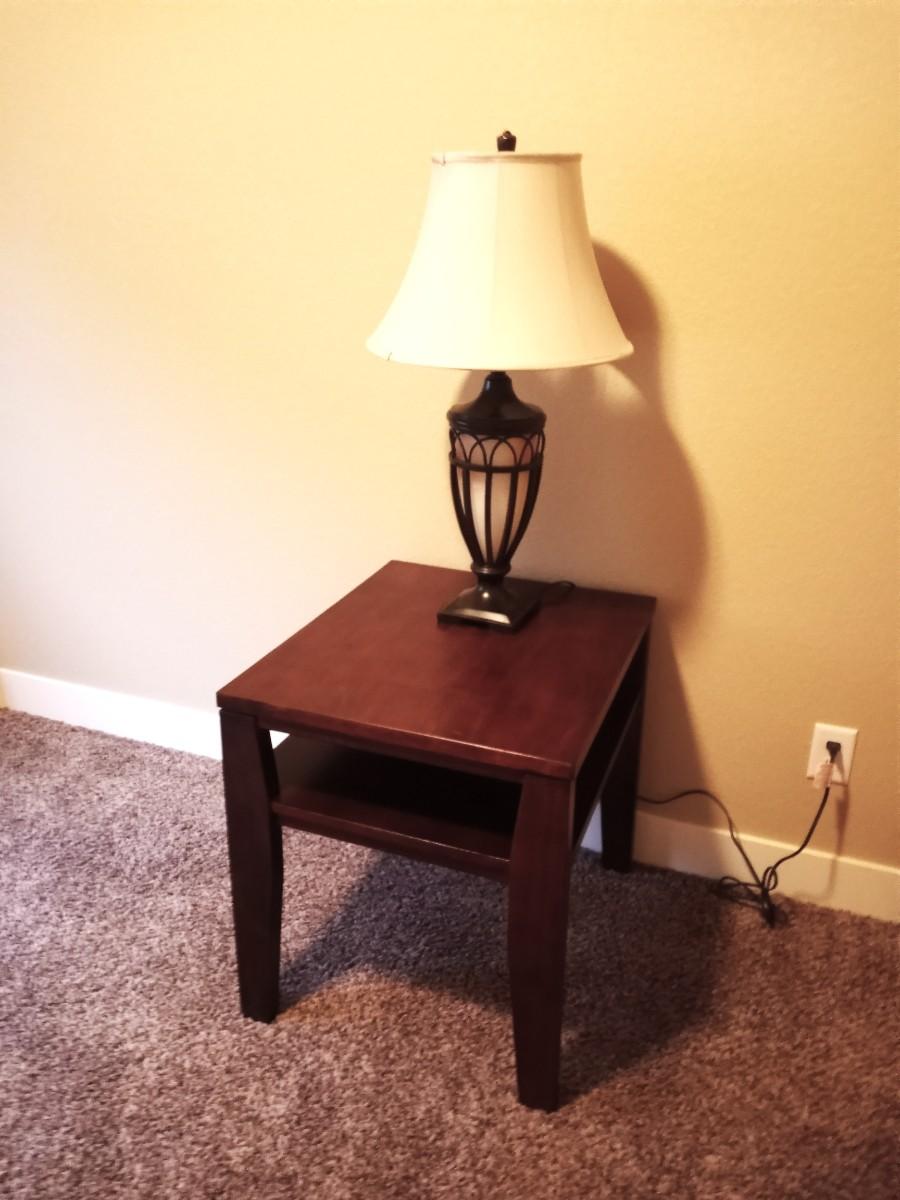 WOODEN TWO TIER SIDE TABLE 22X26 AND DOUBLE LIGHTED METAL LAMP APPROX. 31" TALL USE THE TOP LIGHT/BOTTOM/ OR BOTH