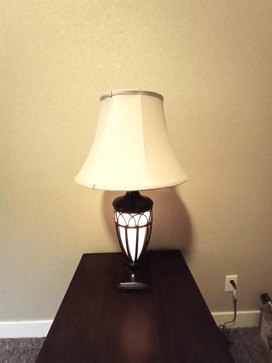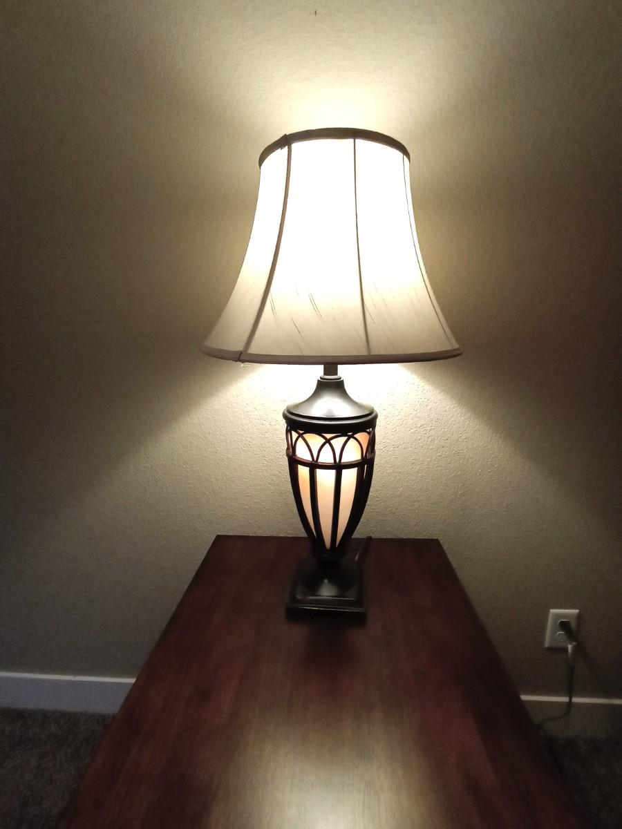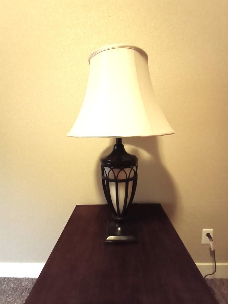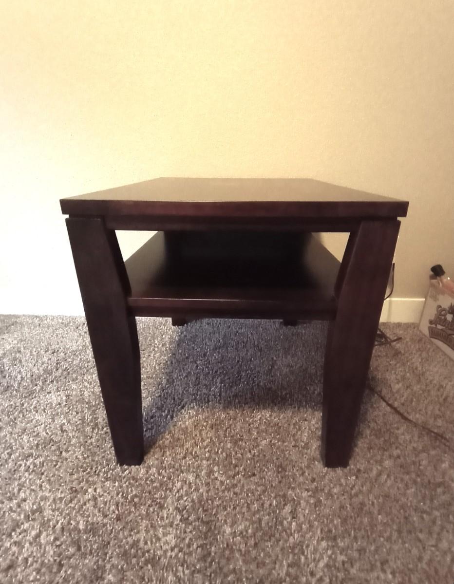 WOODEN TWO TIER SIDE TABLE 22X26 AND DOUBLE LIGHTED METAL LAMP APPROX. 31" TALL USE THE TOP LIGHT/BOTTOM/ OR BOTH