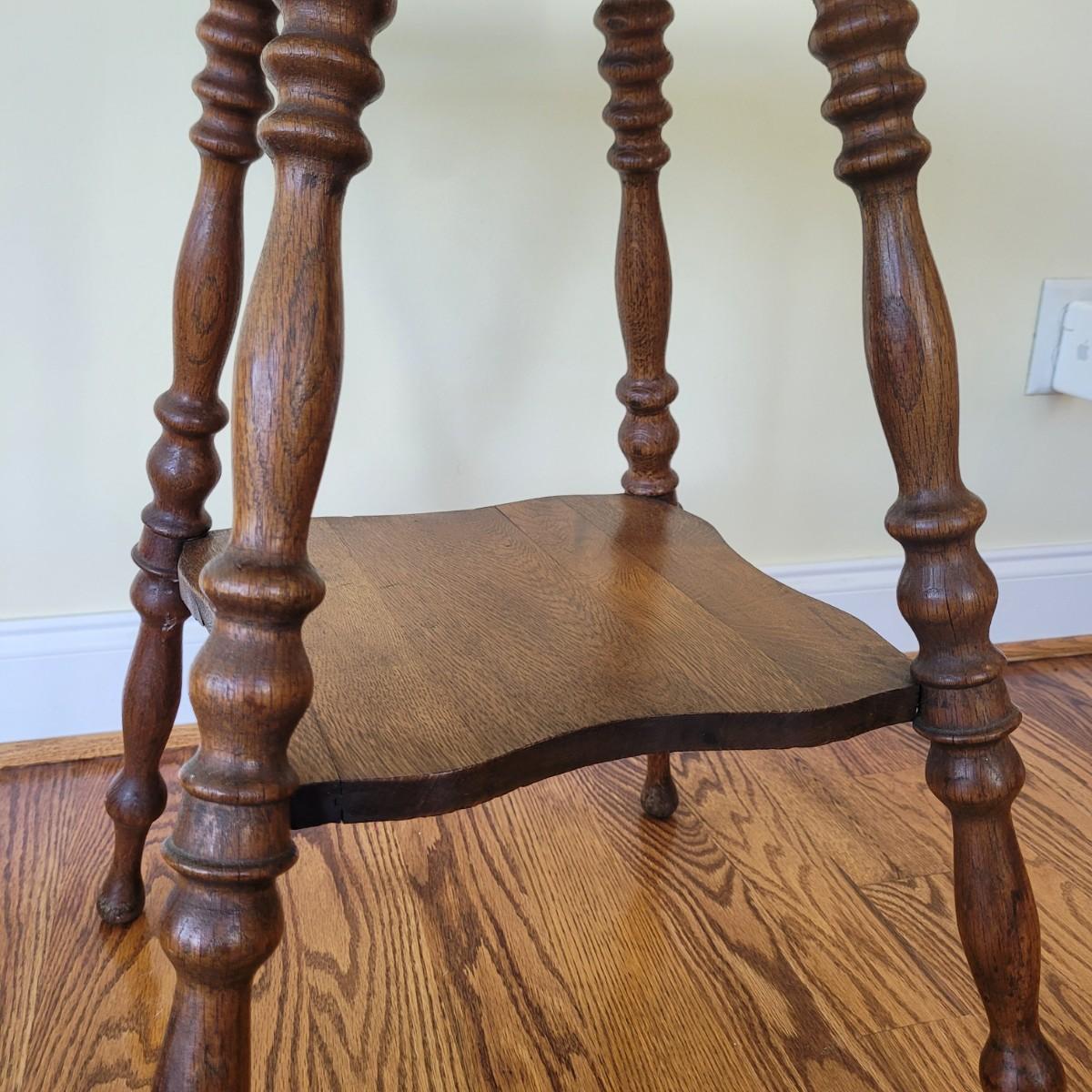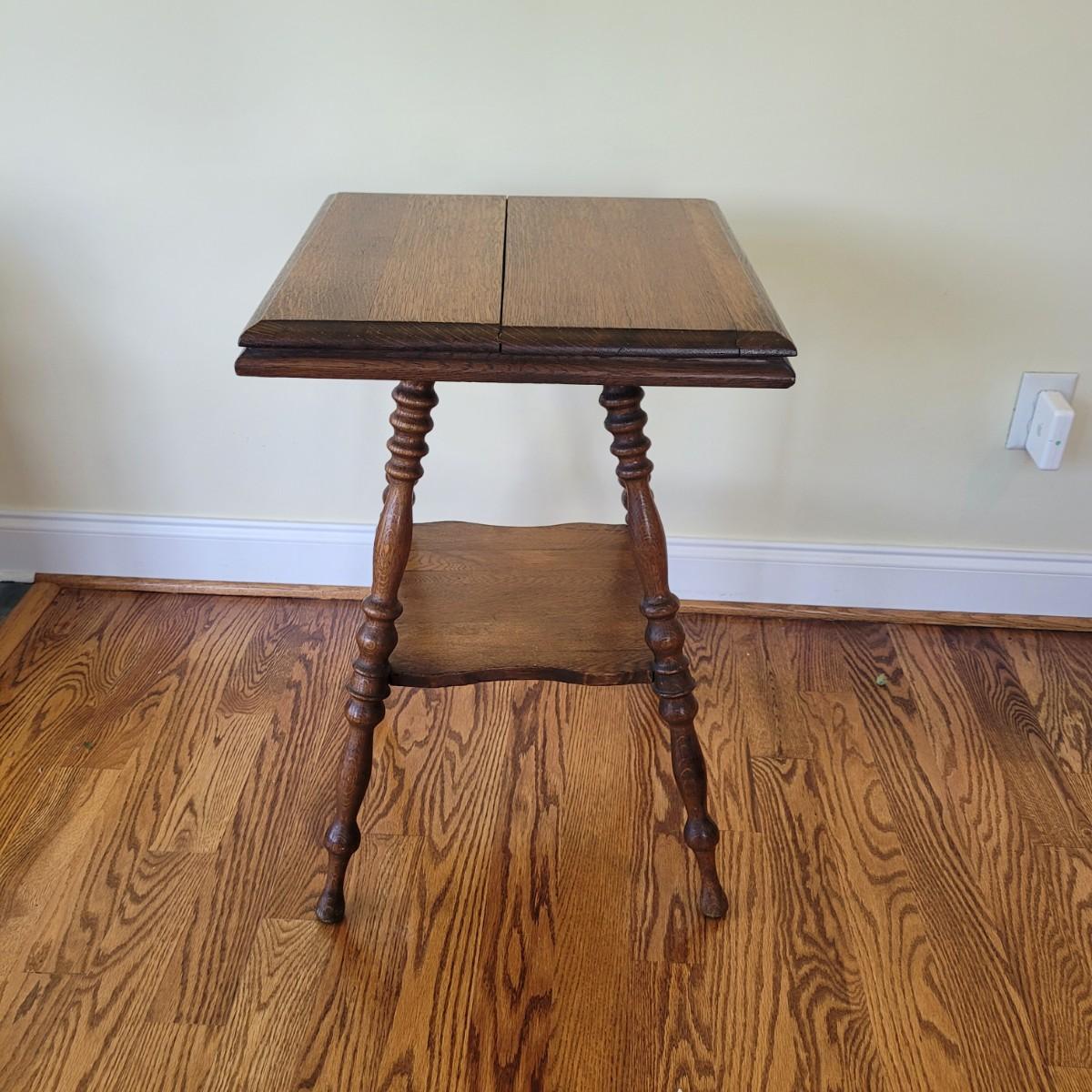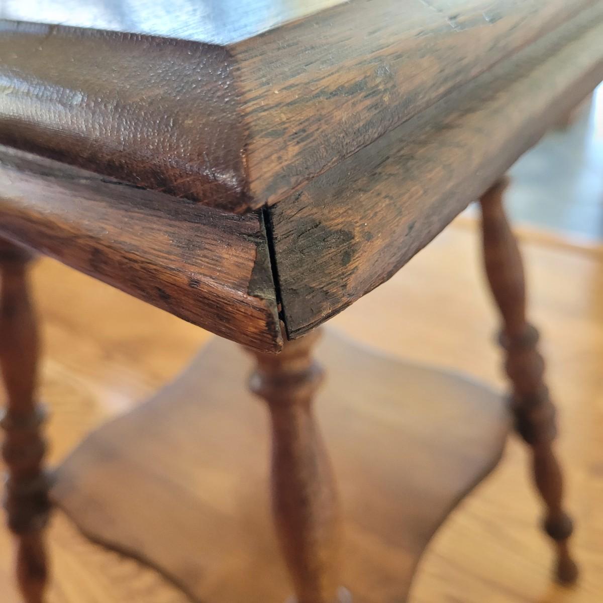 This two tiered parlor table with spindle legs has a slight wobble to it, most likely needs some tightening. Table top has a split down the middle (see photo). Measures approximately 18” x 18” x 27.5”H. Local pick up only.