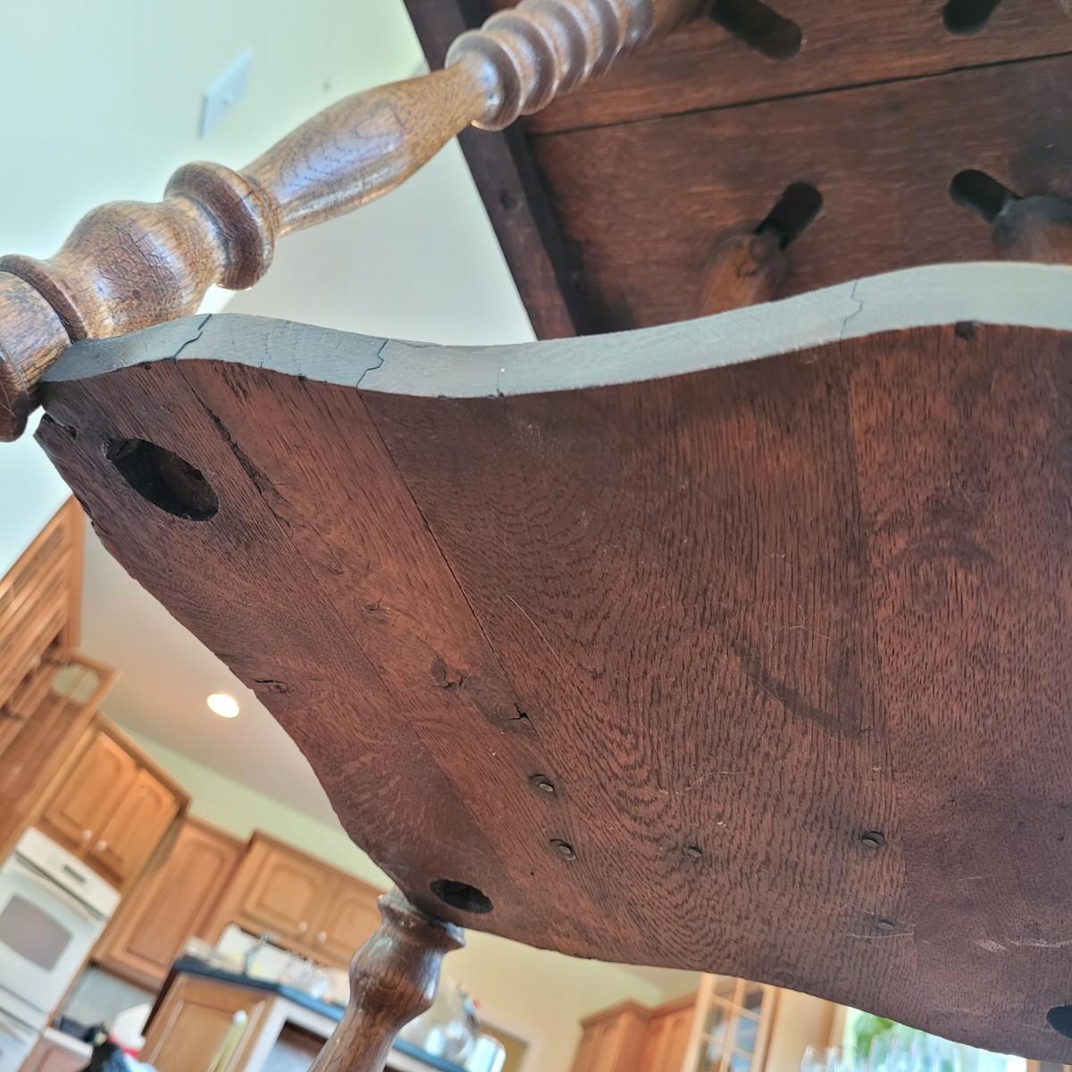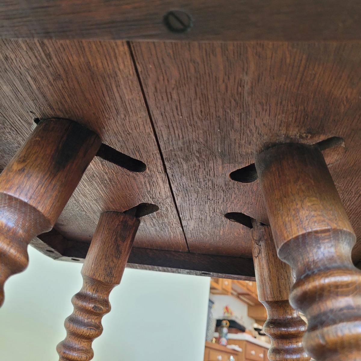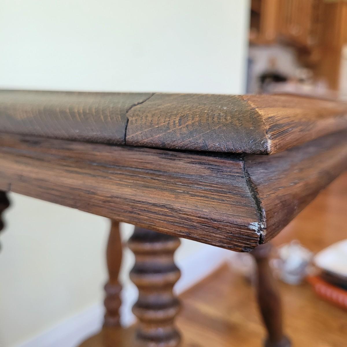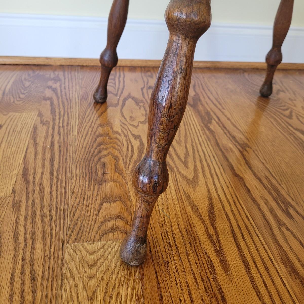 This two tiered parlor table with spindle legs has a slight wobble to it, most likely needs some tightening. Table top has a split down the middle (see photo). Measures approximately 18” x 18” x 27.5”H. Local pick up only.