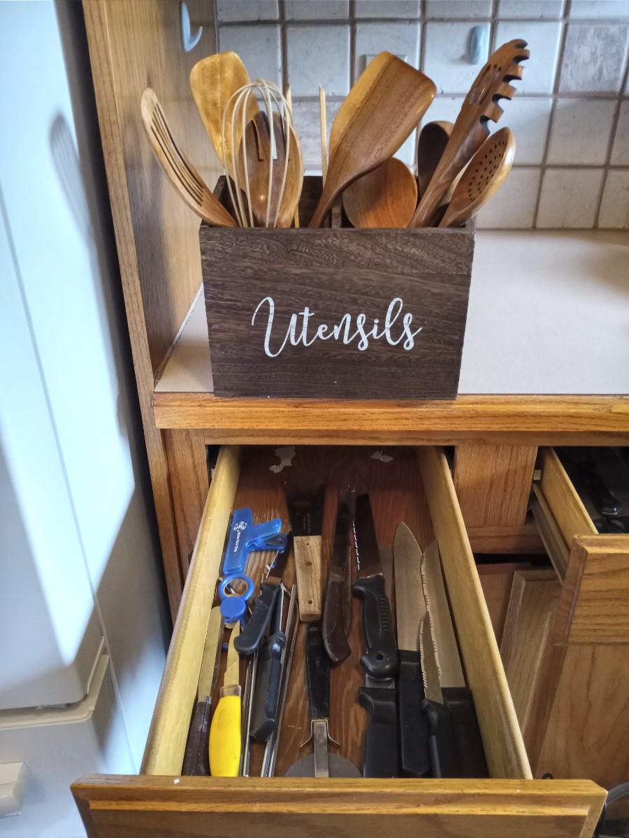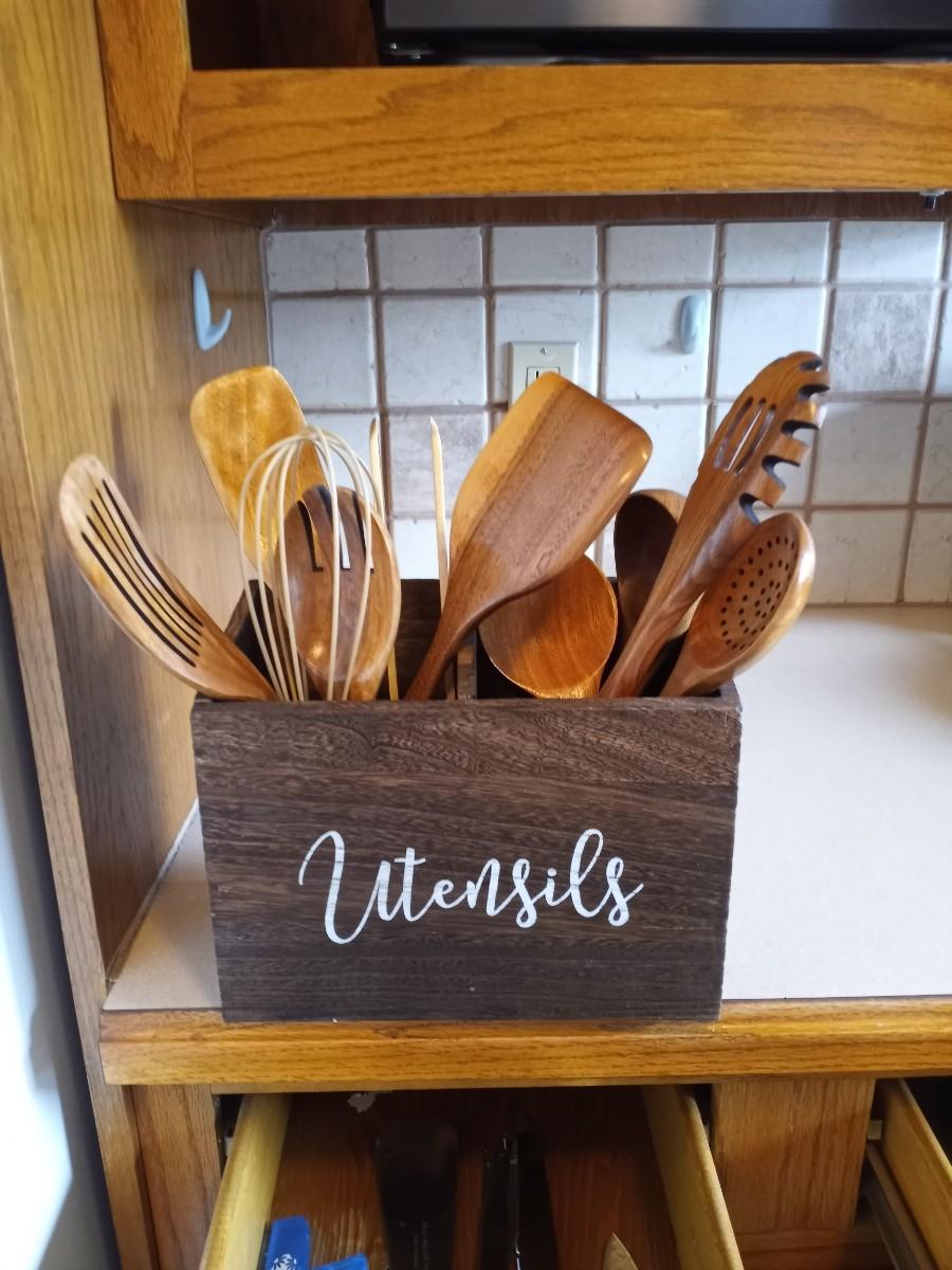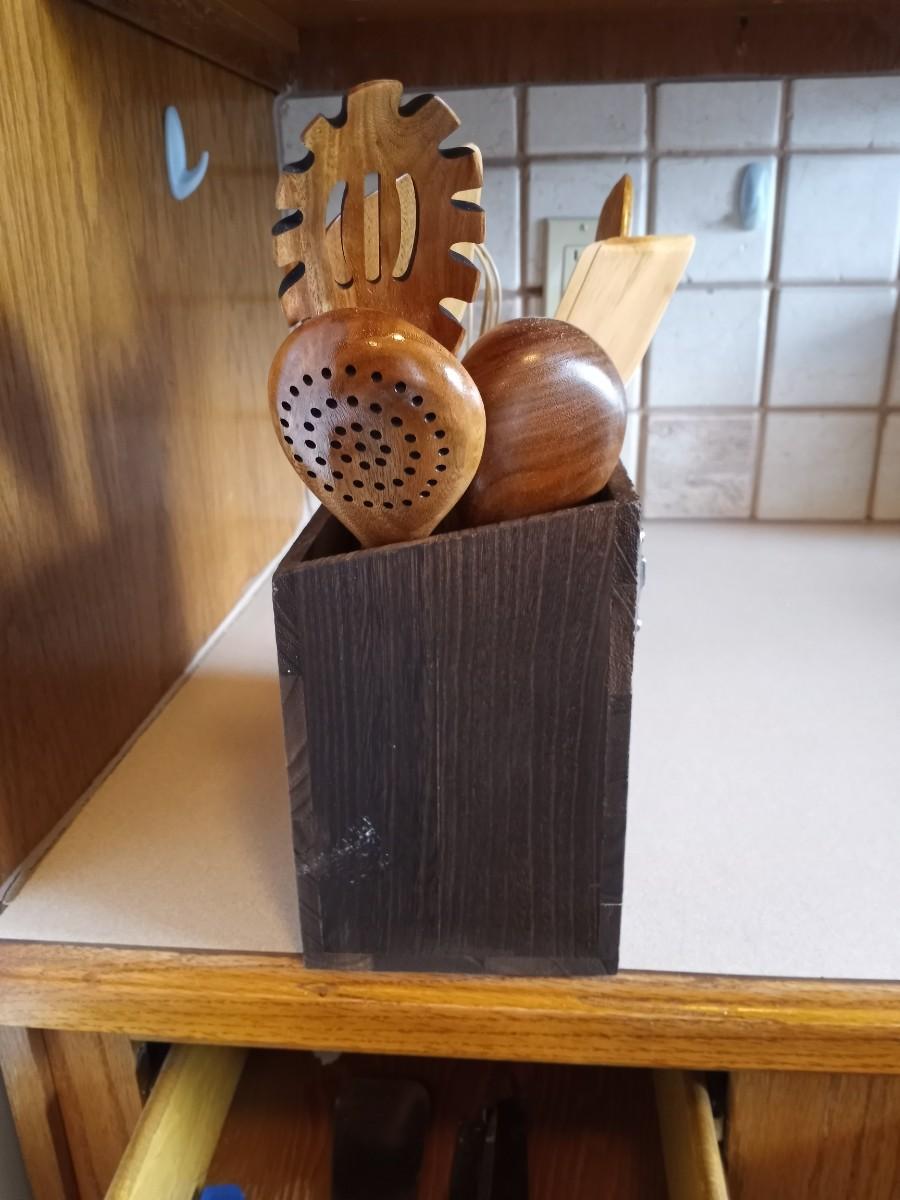 WOODEN UTENSIL HOLDER -WOOD UTENSILS-PIZZA CUTTER-AND MORE