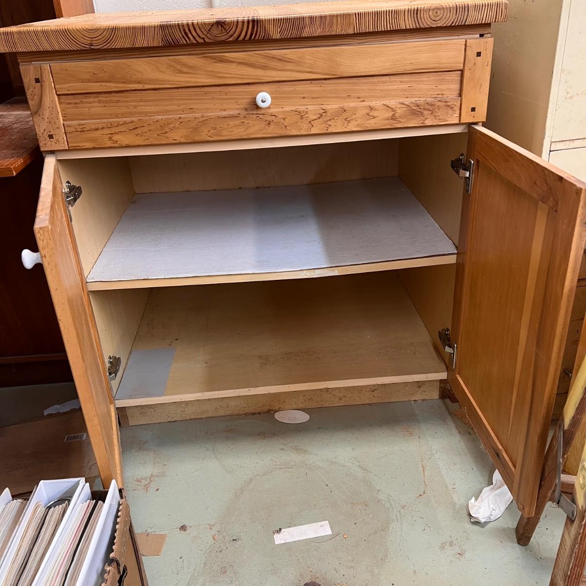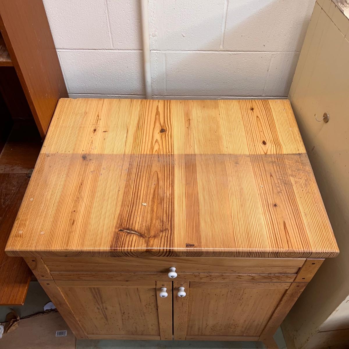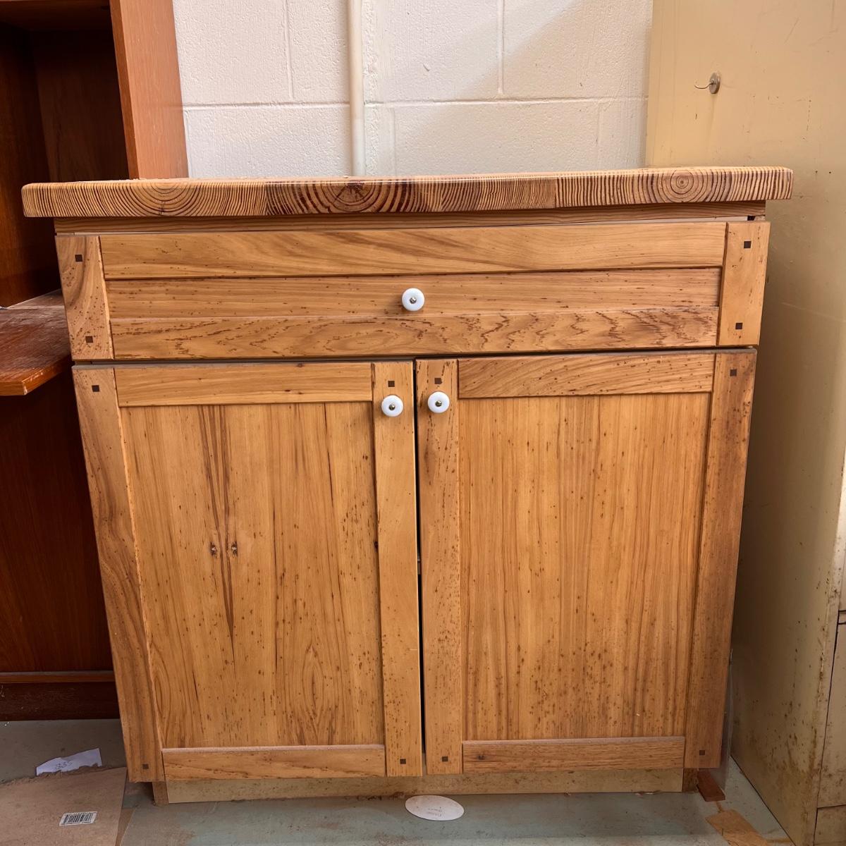This lot includes a wooden utility cabinet. The cabinet has two shelves and one drawer. It has a few stains from wear on the top - see picture included. This piece measures 34” x 25” x 36”H. Local pickup only. Winning bidder must bring assistance to help move and load this item due to its weight and/or size.