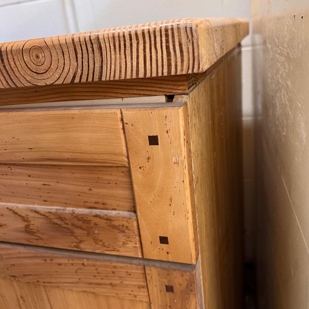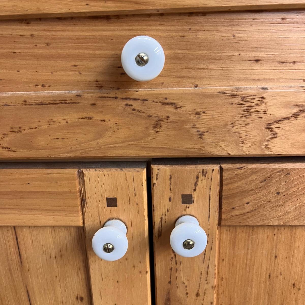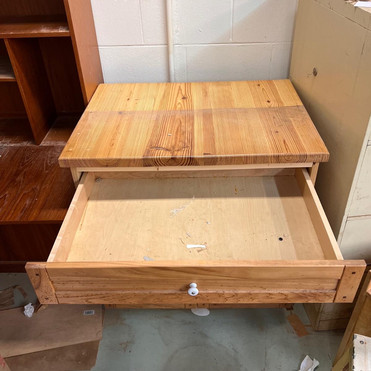 This lot includes a wooden utility cabinet. The cabinet has two shelves and one drawer. It has a few stains from wear on the top - see picture included. This piece measures 34” x 25” x 36”H. Local pickup only. Winning bidder must bring assistance to help move and load this item due to its weight and/or size.