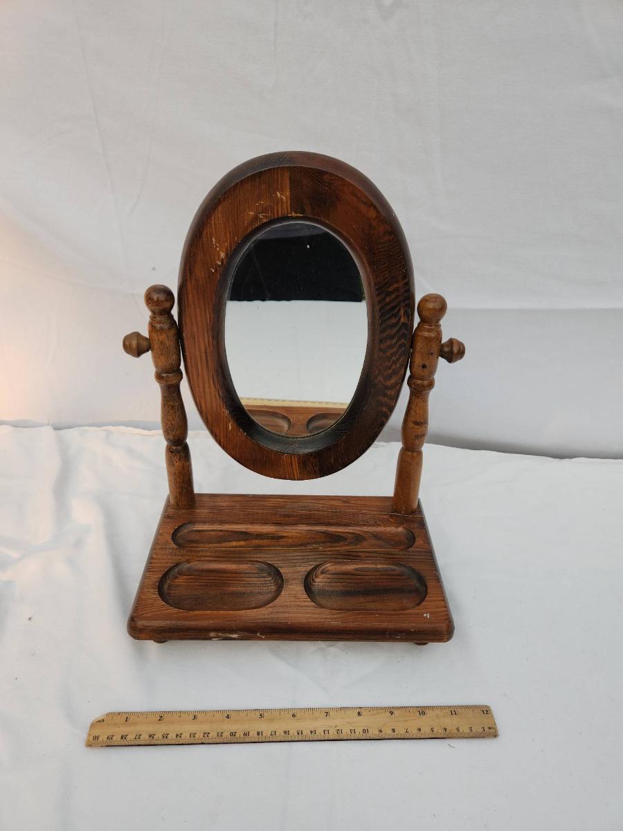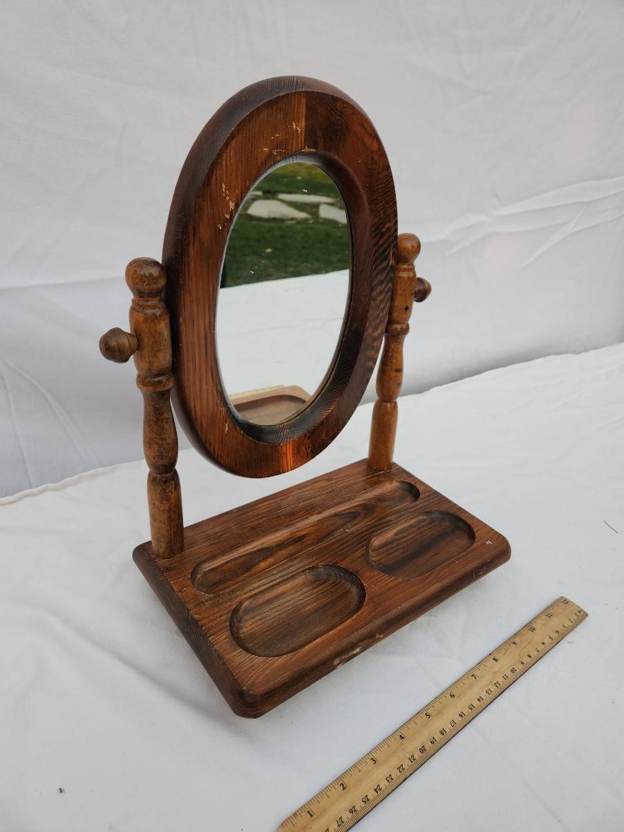 Wooden vanity mirror featuring an oval frame mounted on two turned posts. The base includes a recessed tray section with three distinct compartments for small items. The piece is freestanding and measures approximately as indicated by the ruler for scale. Mild signs of wear consistent with use and age.