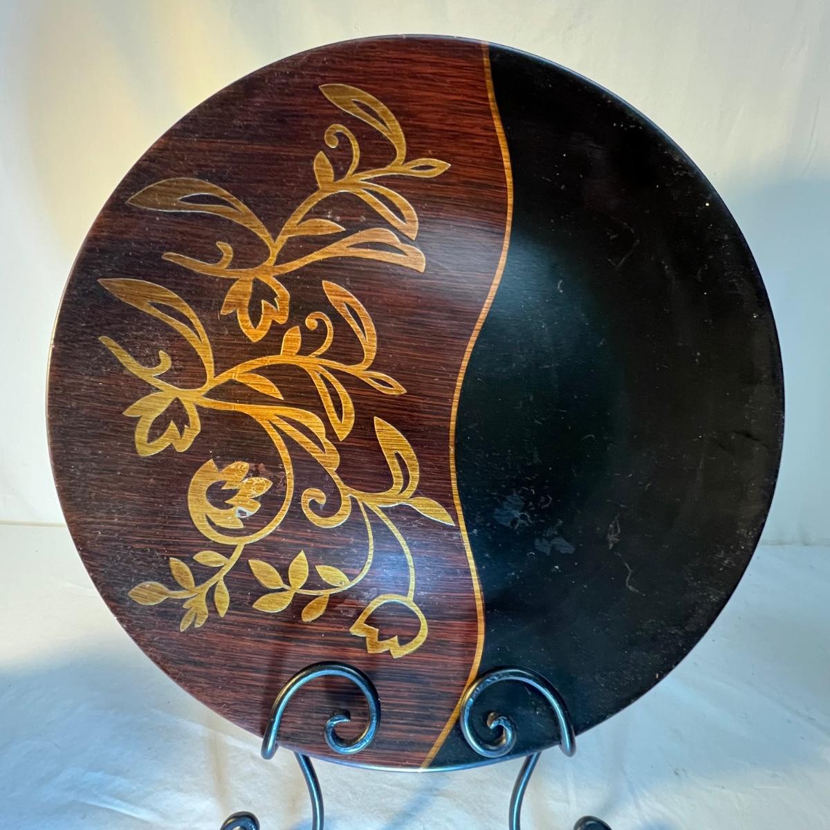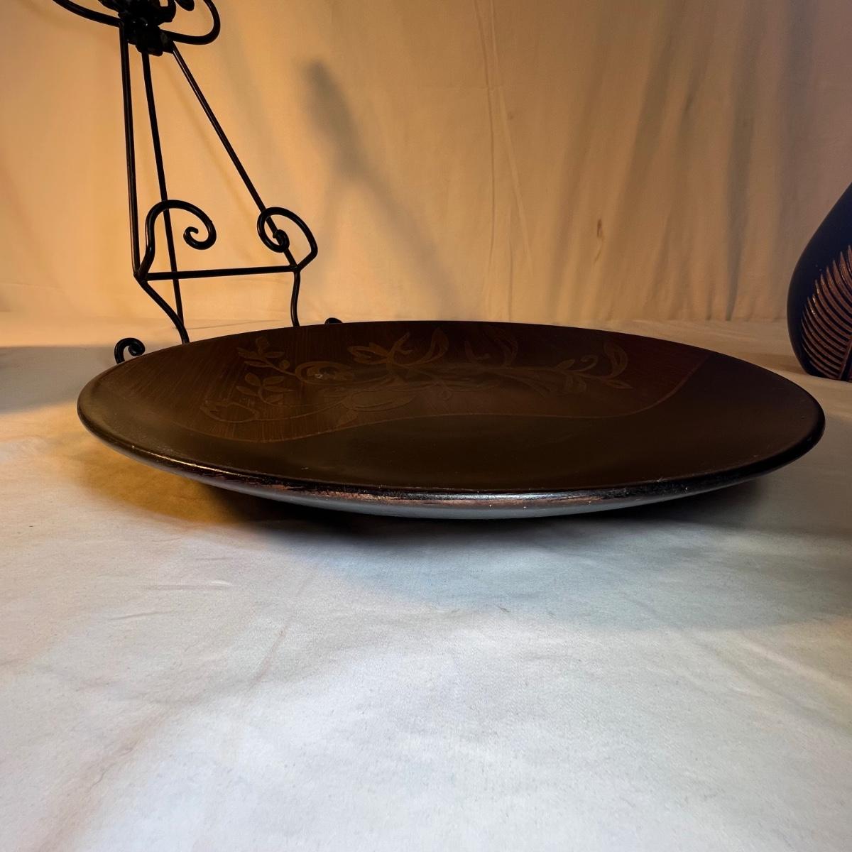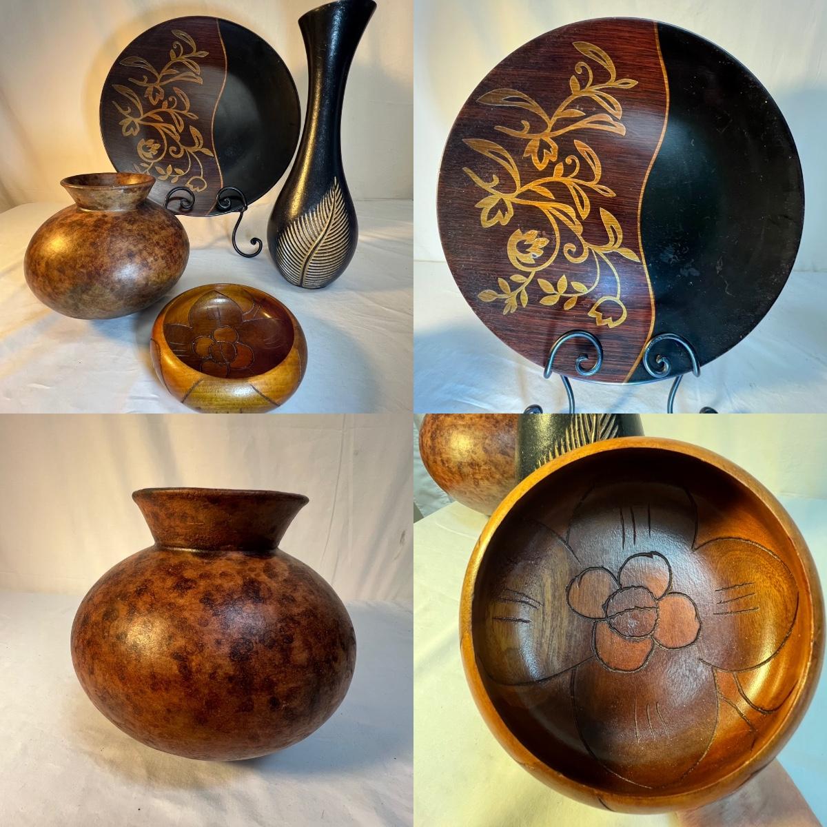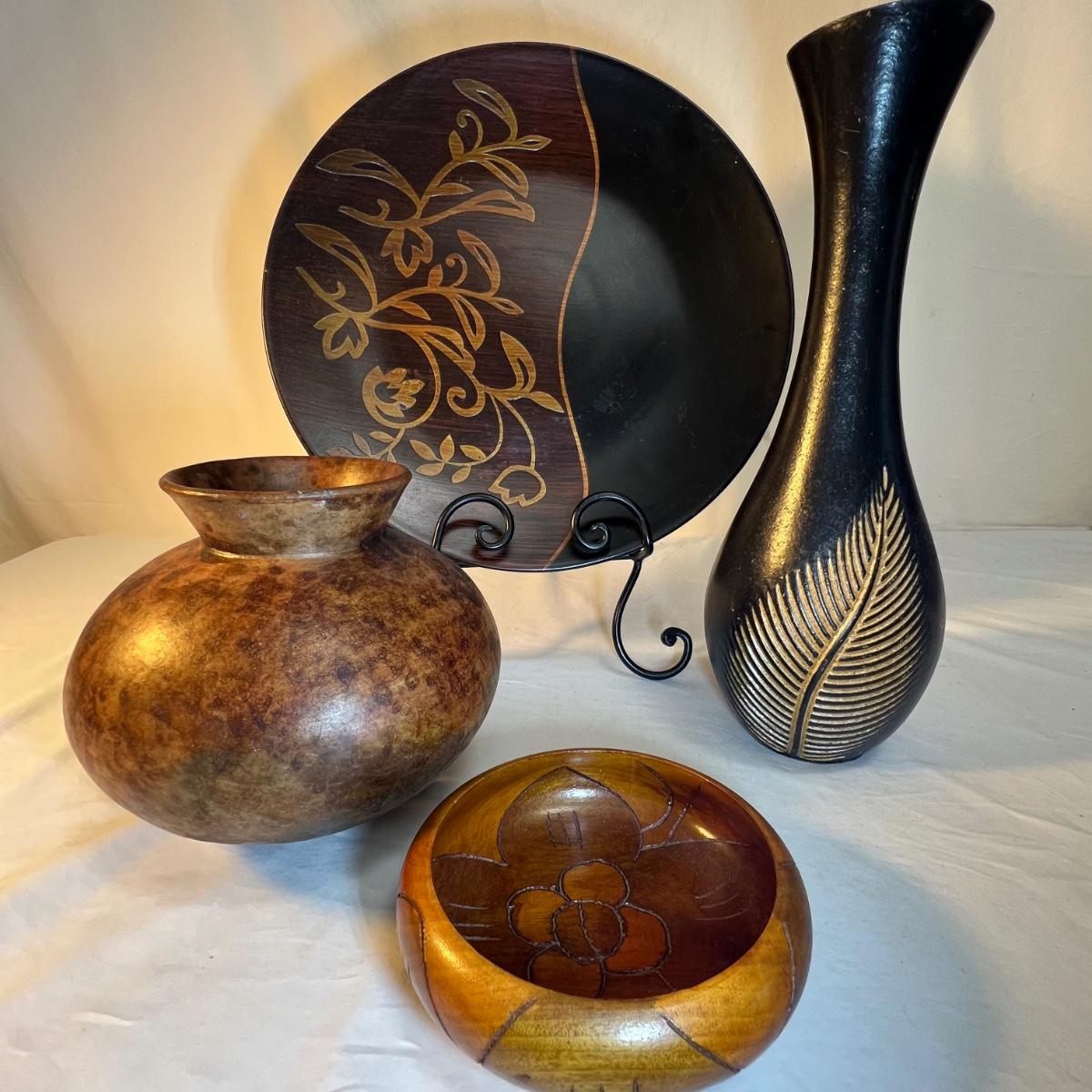 A tall black narrow necked vase and a small bowl with a carved flower design are wooden. The large decorative plate and brown vase are ceramic. The plate has a few small nicks, see images; measures 15”D x 2”H. Black metal plate stand is included.