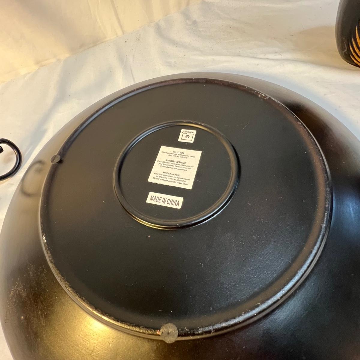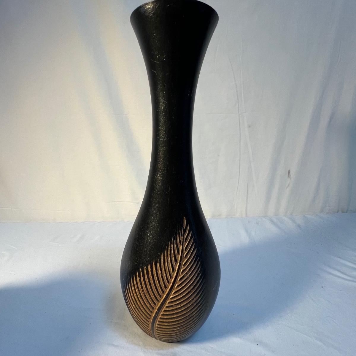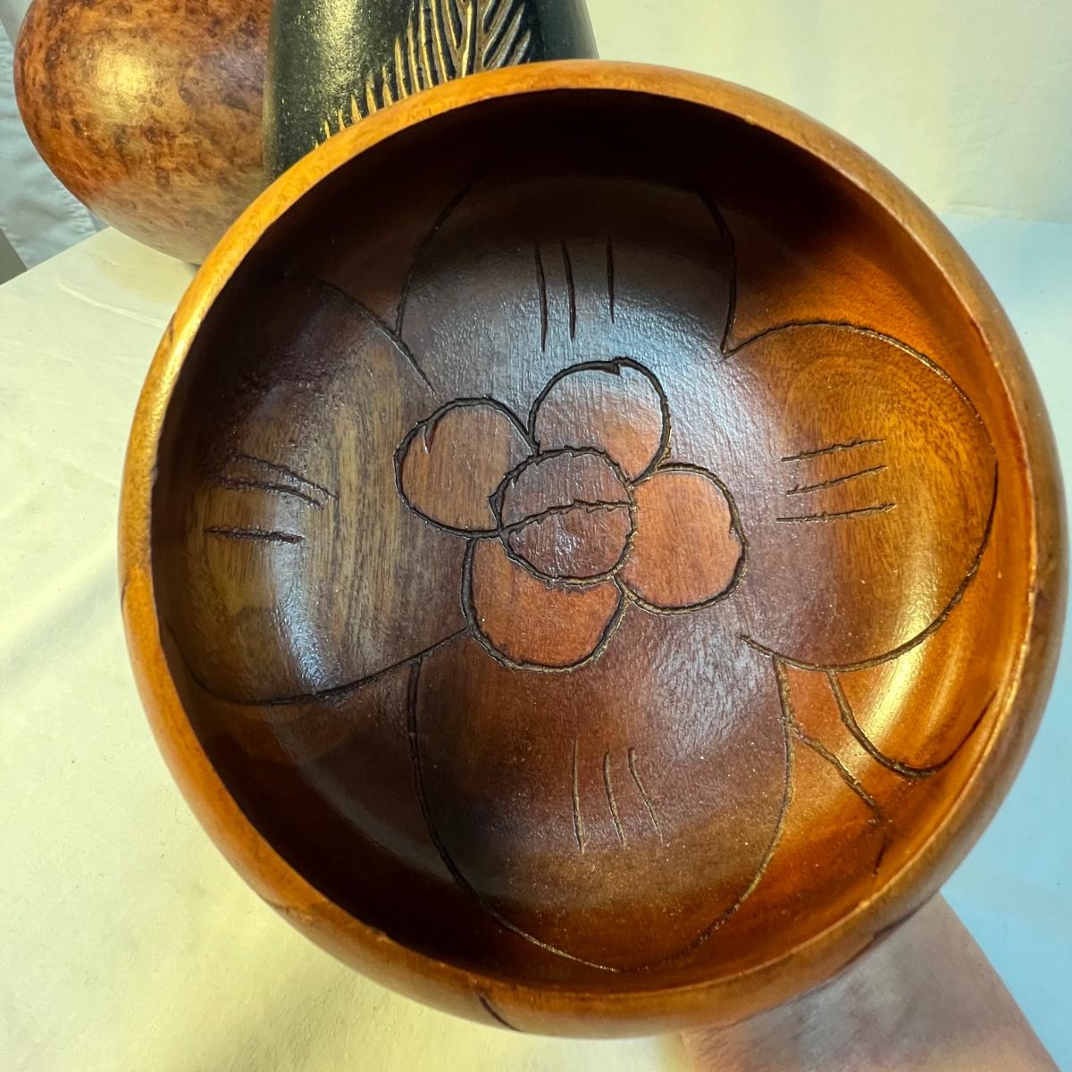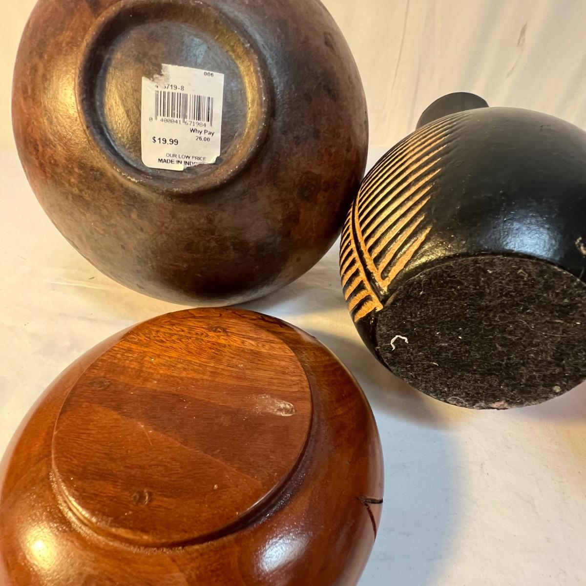 A tall black narrow necked vase and a small bowl with a carved flower design are wooden. The large decorative plate and brown vase are ceramic. The plate has a few small nicks, see images; measures 15”D x 2”H. Black metal plate stand is included.