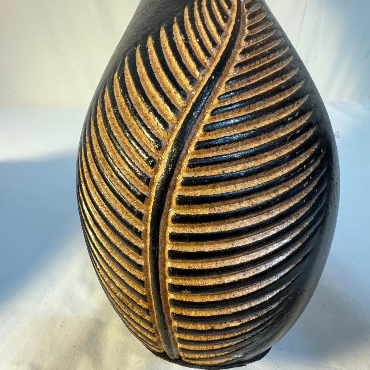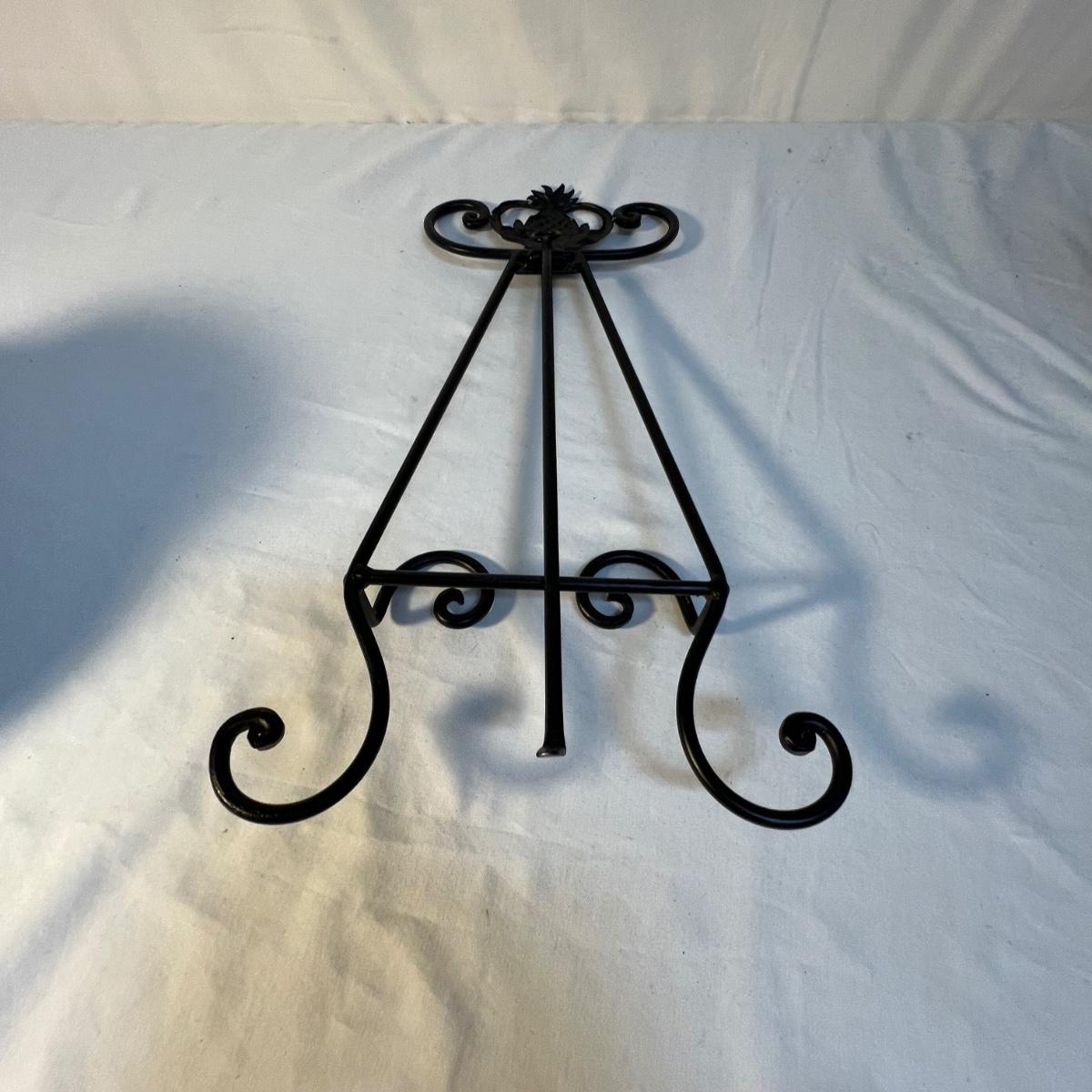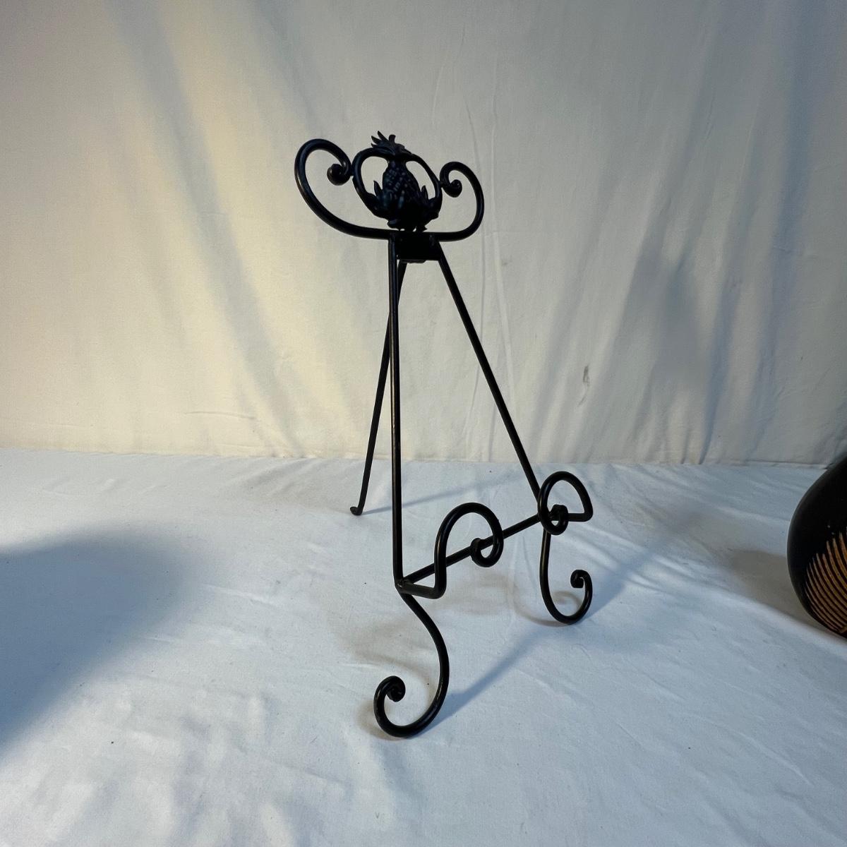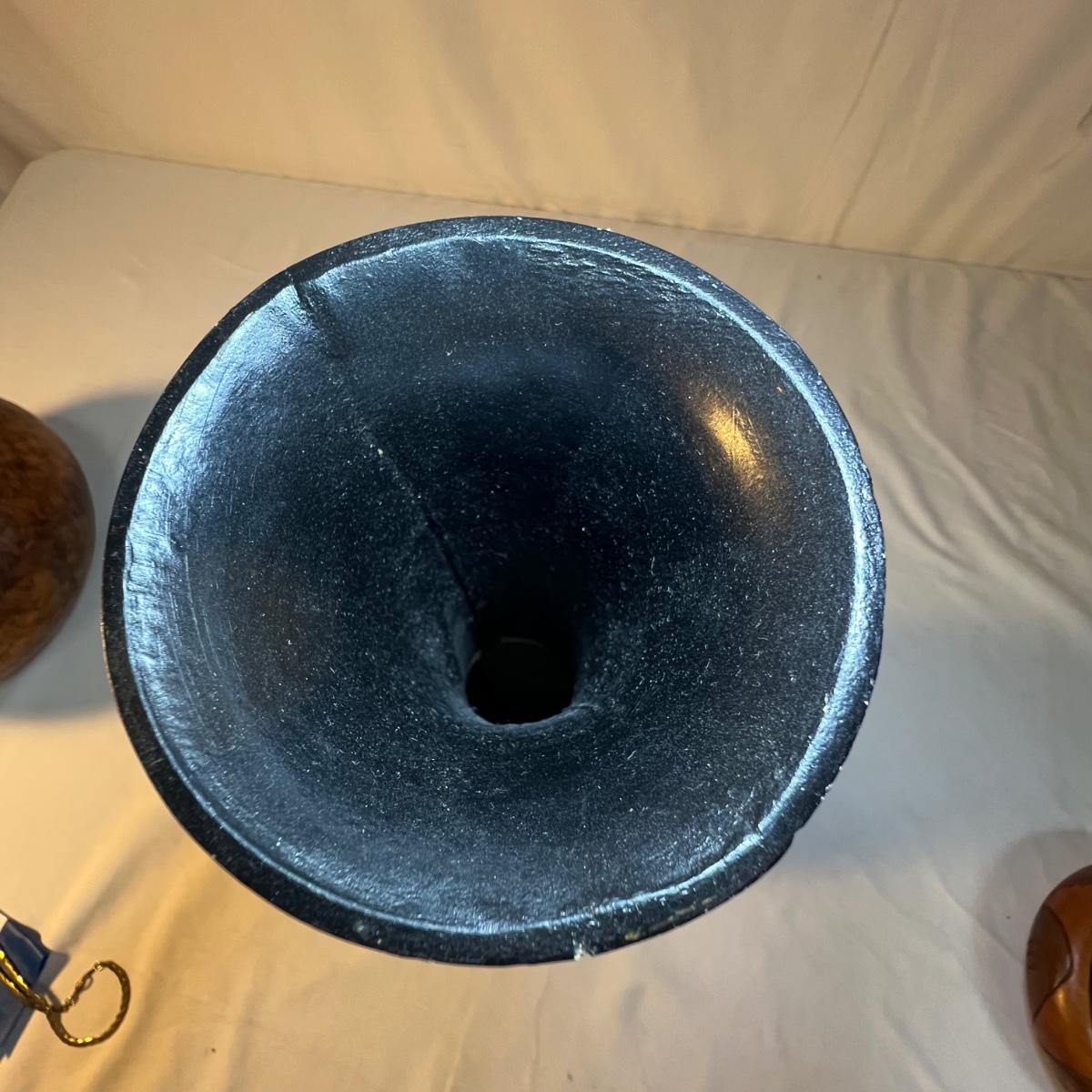 A tall black narrow necked vase and a small bowl with a carved flower design are wooden. The large decorative plate and brown vase are ceramic. The plate has a few small nicks, see images; measures 15”D x 2”H. Black metal plate stand is included.
