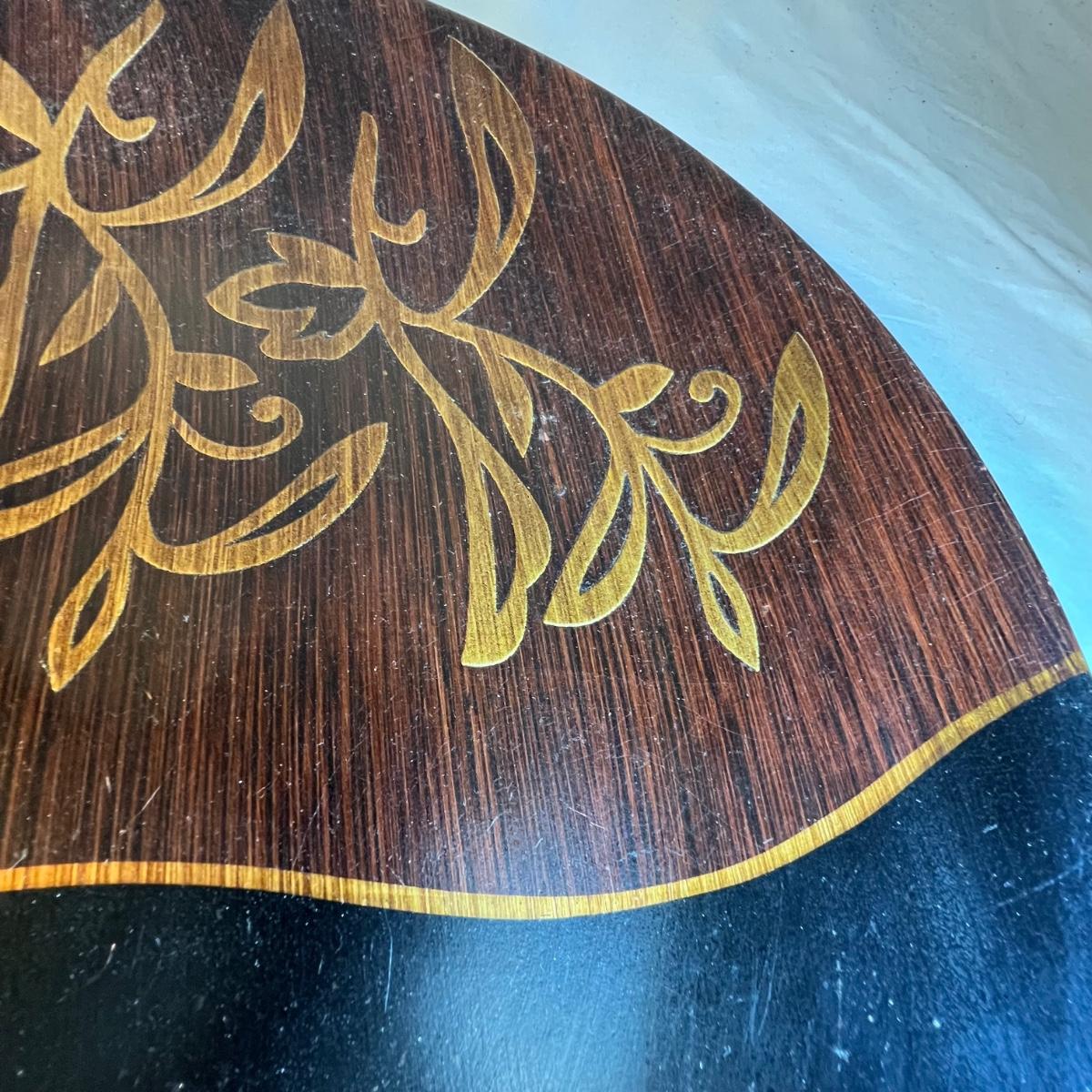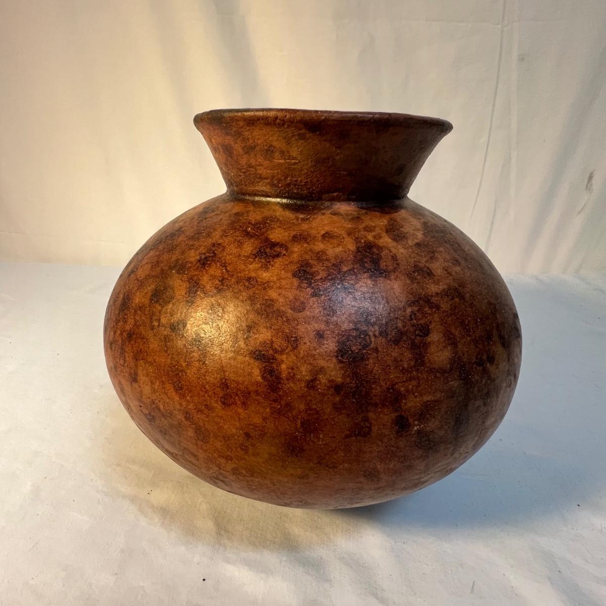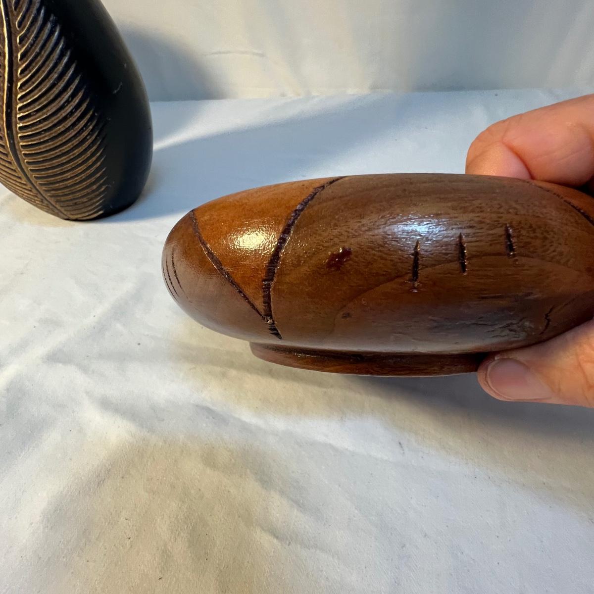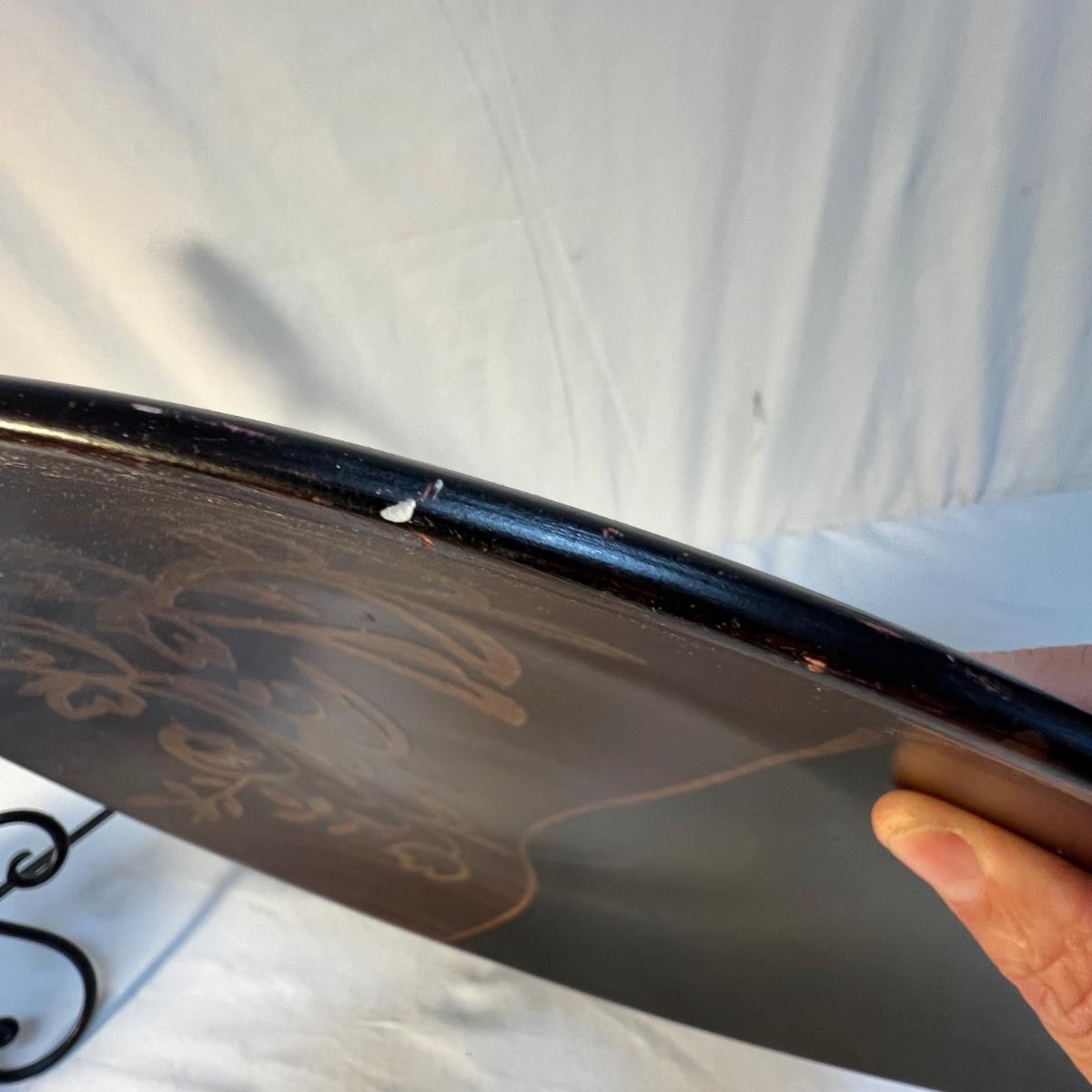 A tall black narrow necked vase and a small bowl with a carved flower design are wooden. The large decorative plate and brown vase are ceramic. The plate has a few small nicks, see images; measures 15”D x 2”H. Black metal plate stand is included.