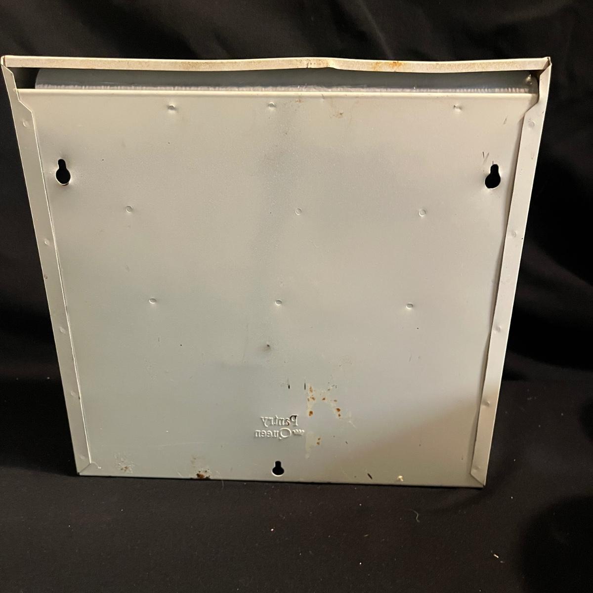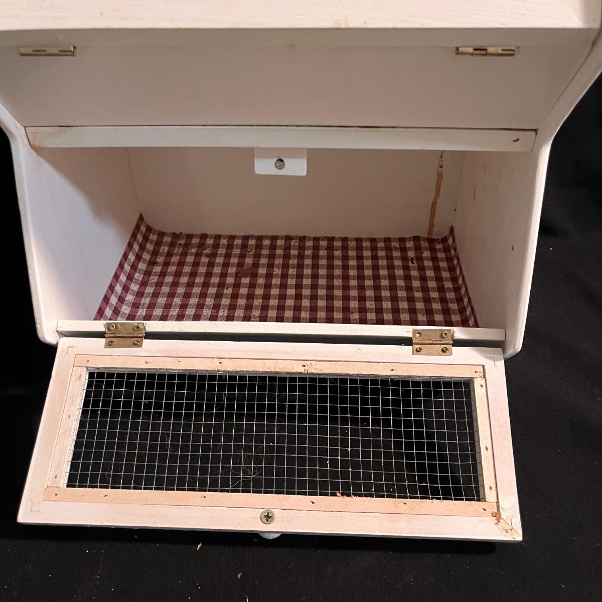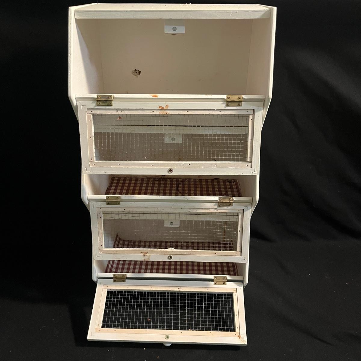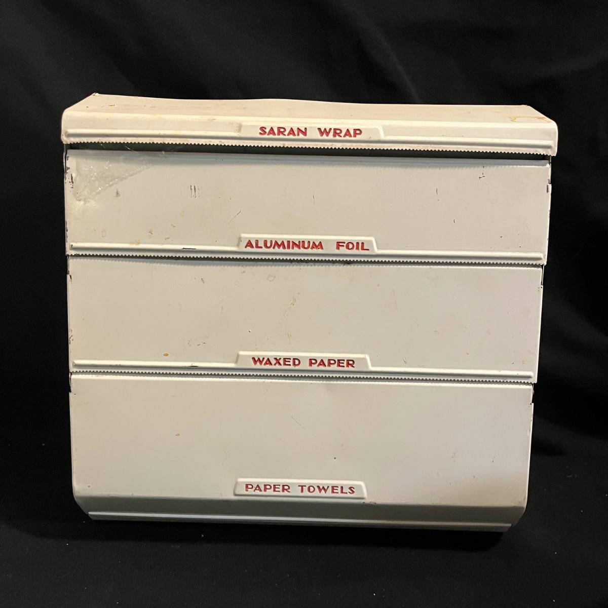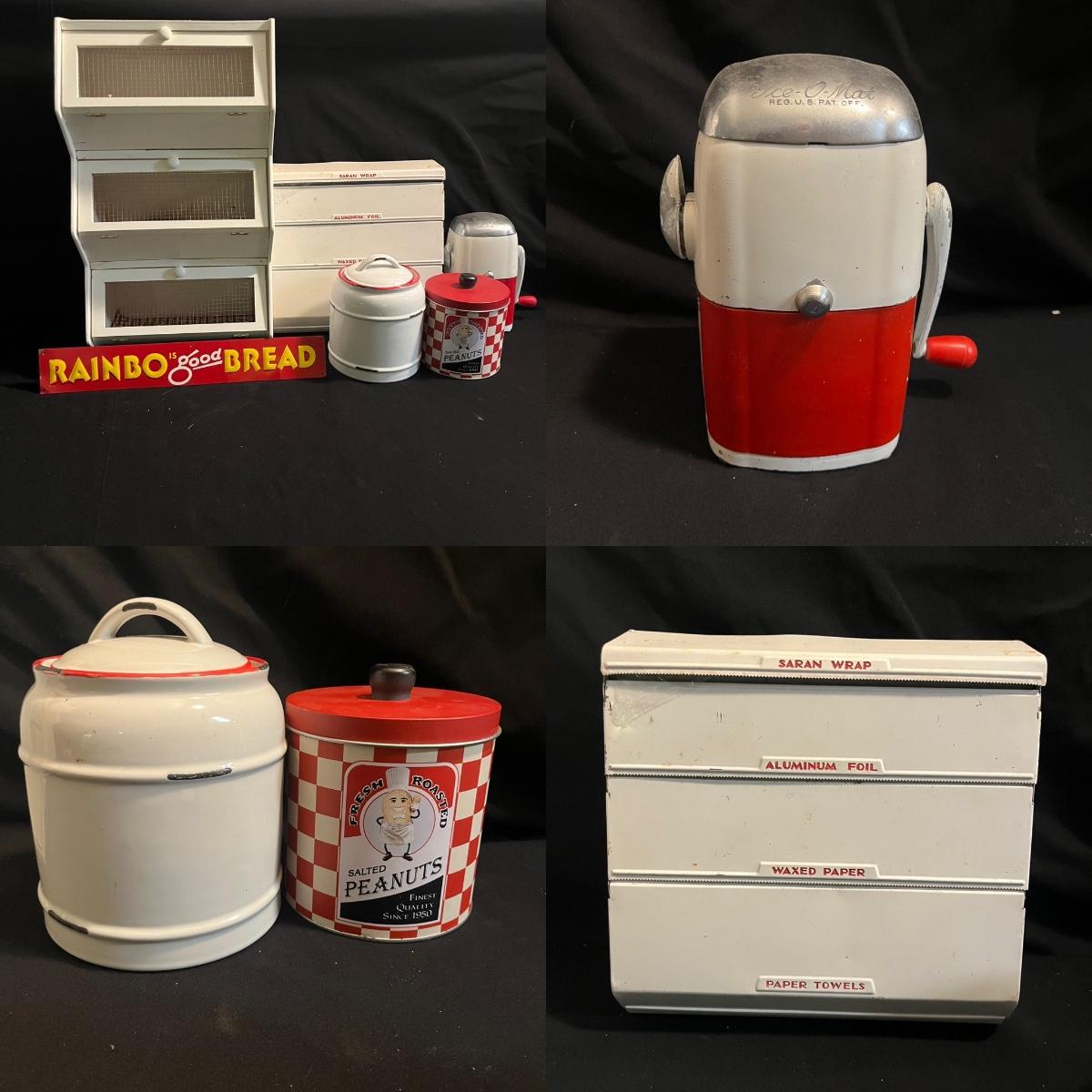 Lot includes a metal kitchen dispenser for foil, Saran Wrap, waxed paper and paper towels, a wooden three-compartment vegetable bin, metal Ice O Mat ice crusher, Rainbo Bread metal sign and a ceramic and metal jar. Vegetable bin measures 12” x 8.5” x 21.5”H and has two large loose screws on a hinge and dispenser has rust on bottom, see pictures.