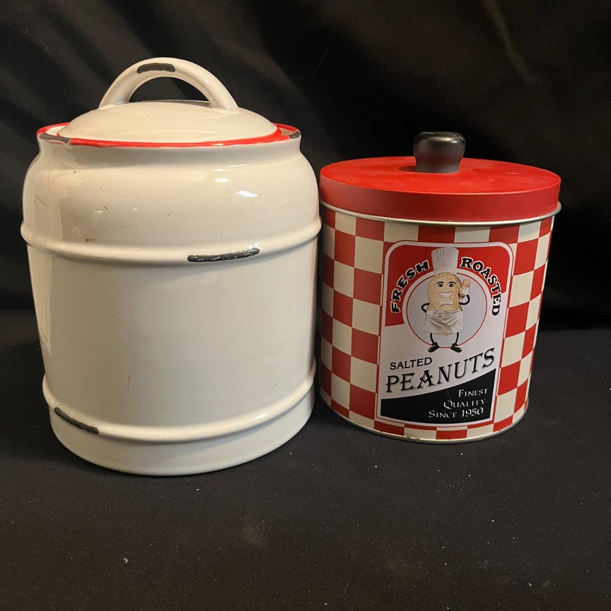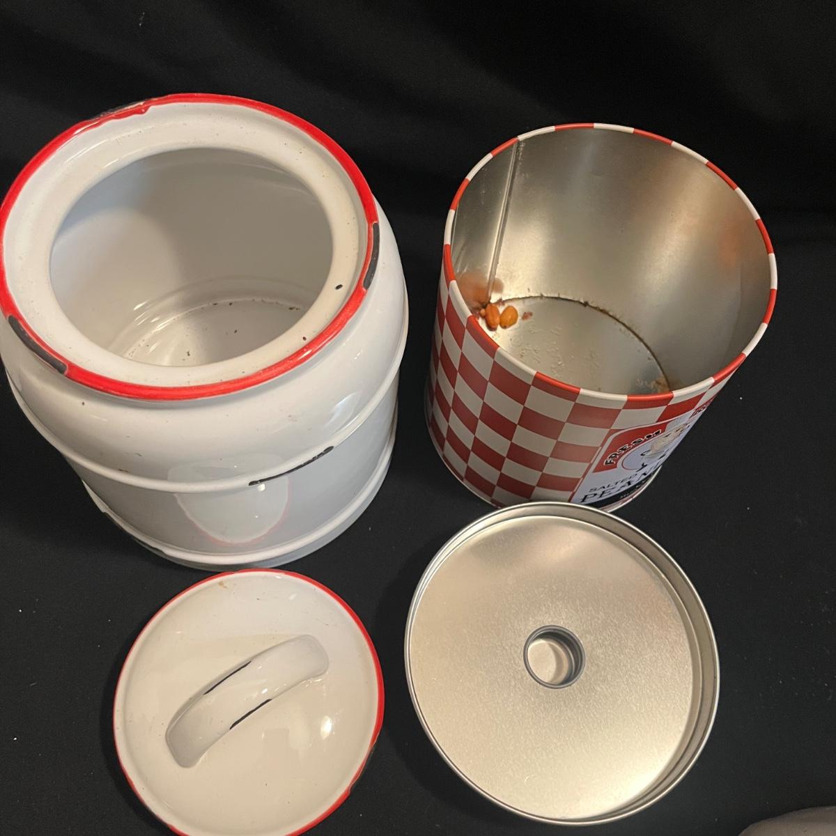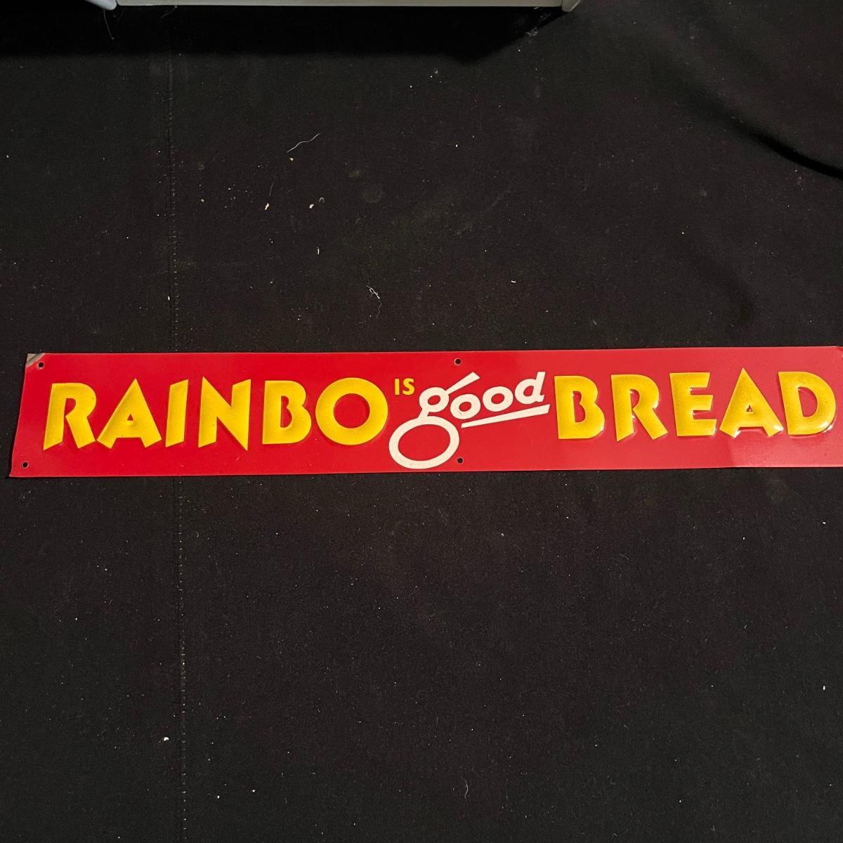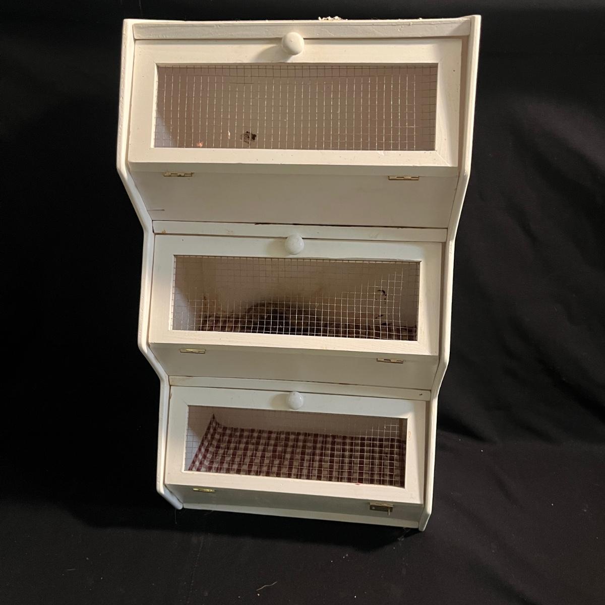 Lot includes a metal kitchen dispenser for foil, Saran Wrap, waxed paper and paper towels, a wooden three-compartment vegetable bin, metal Ice O Mat ice crusher, Rainbo Bread metal sign and a ceramic and metal jar. Vegetable bin measures 12” x 8.5” x 21.5”H and has two large loose screws on a hinge and dispenser has rust on bottom, see pictures.