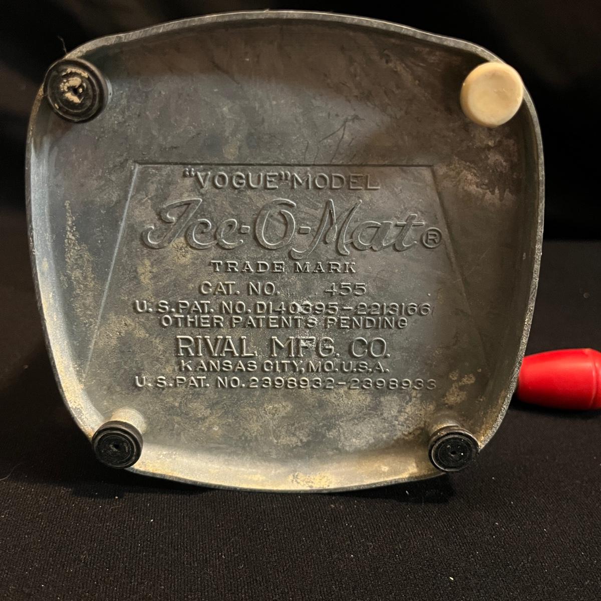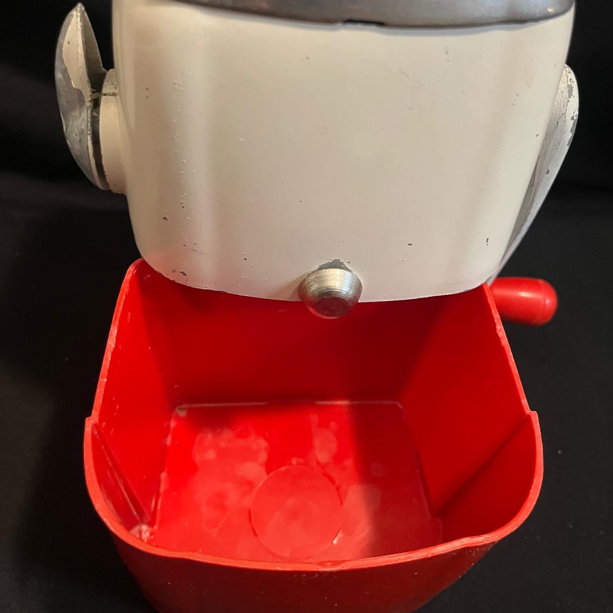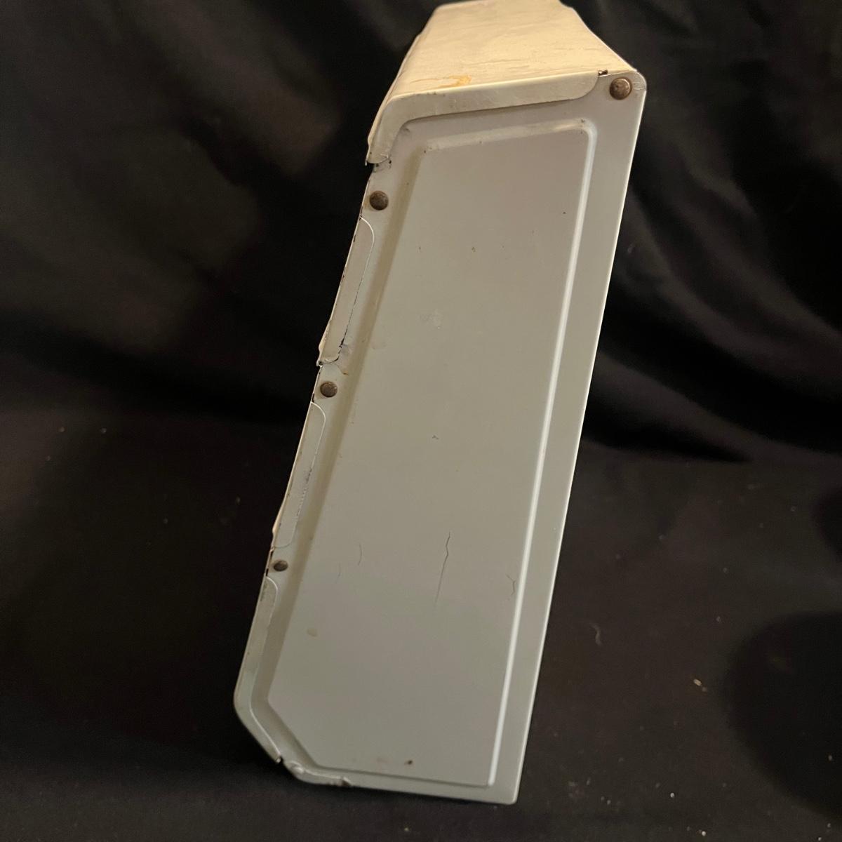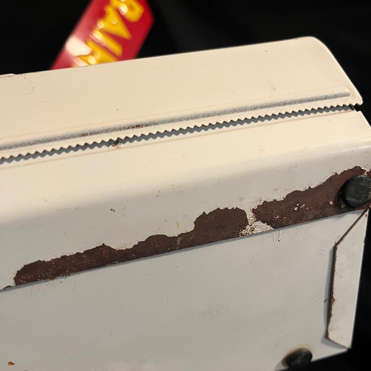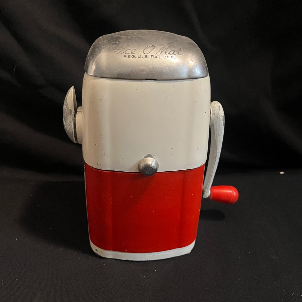 Lot includes a metal kitchen dispenser for foil, Saran Wrap, waxed paper and paper towels, a wooden three-compartment vegetable bin, metal Ice O Mat ice crusher, Rainbo Bread metal sign and a ceramic and metal jar. Vegetable bin measures 12” x 8.5” x 21.5”H and has two large loose screws on a hinge and dispenser has rust on bottom, see pictures.