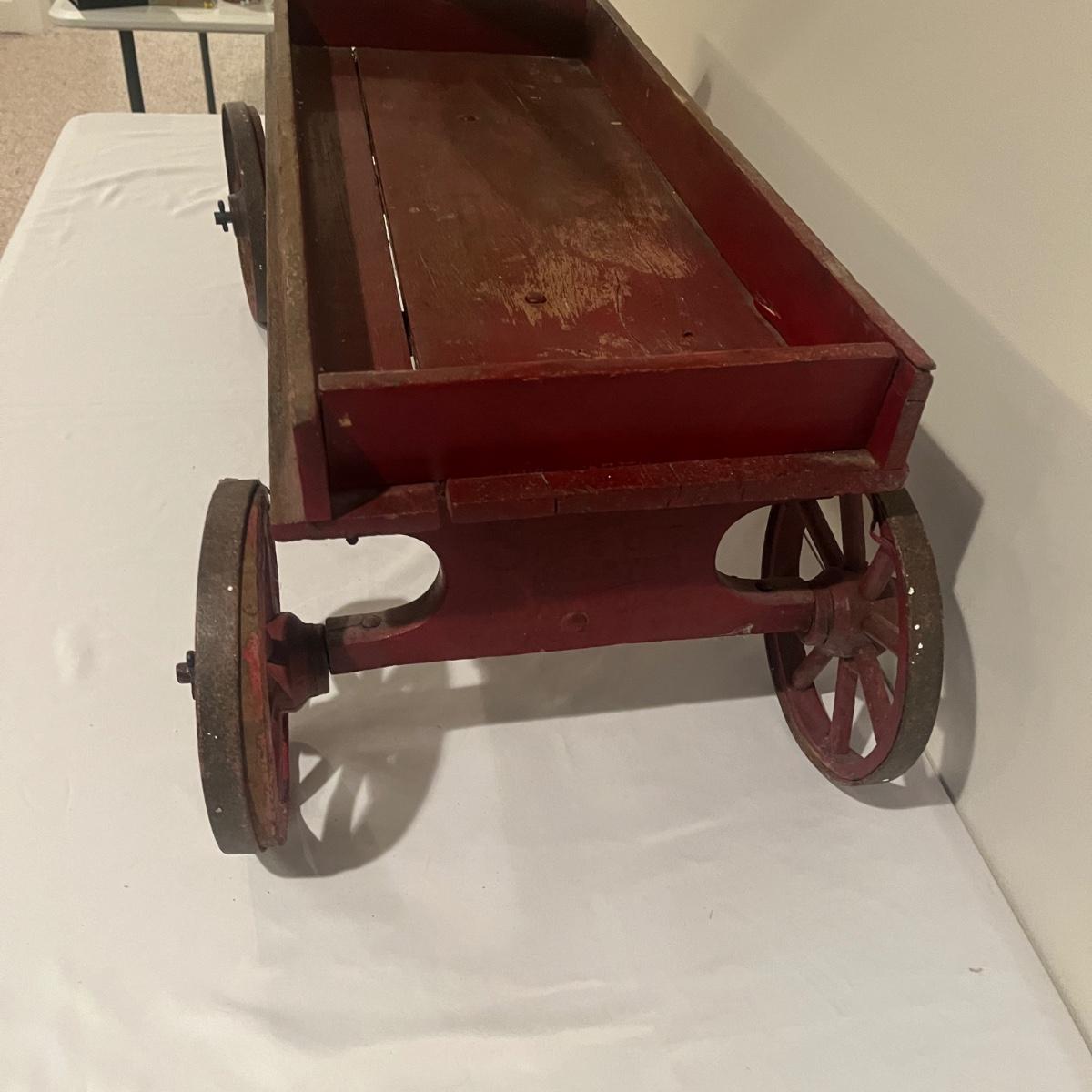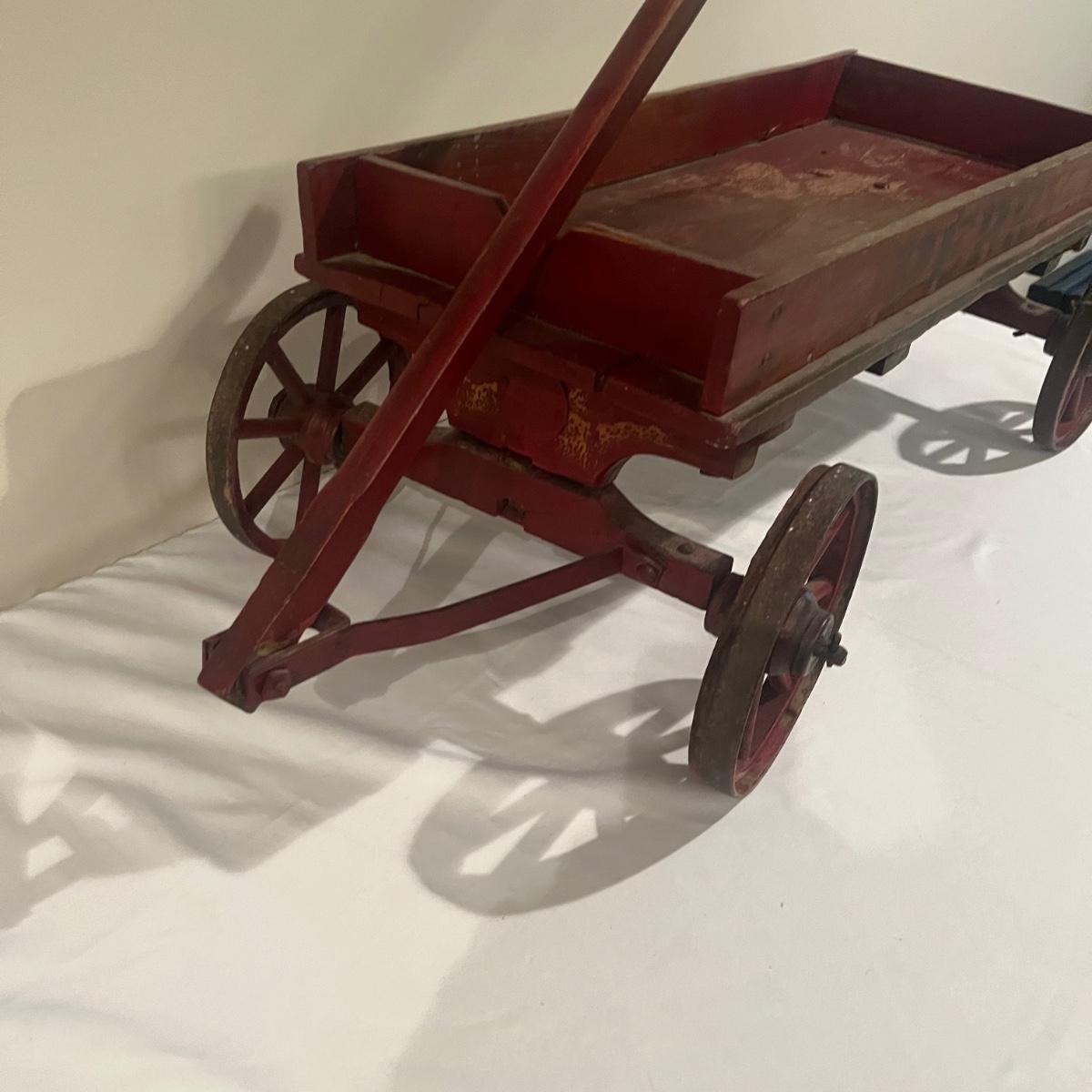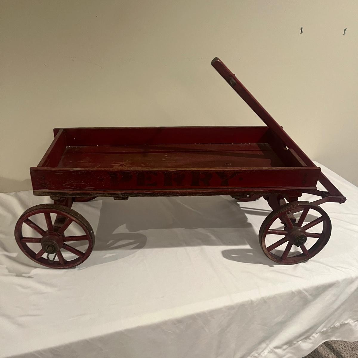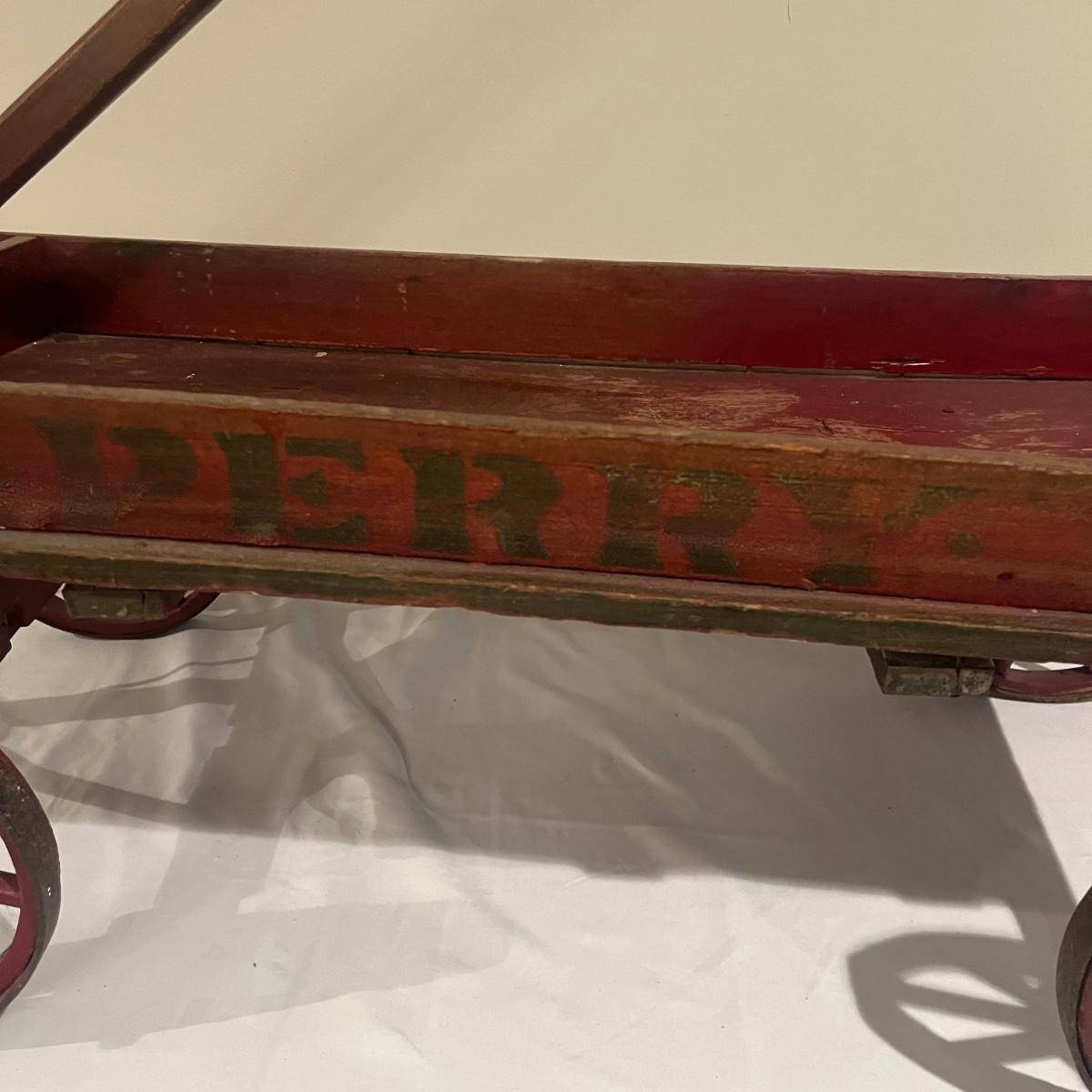 This wooden wagon has wooden wheels with metal banding around. The wagon measures 17” x 39” x 11”H. Please see photos for details. "Perry" is printed on the side.
